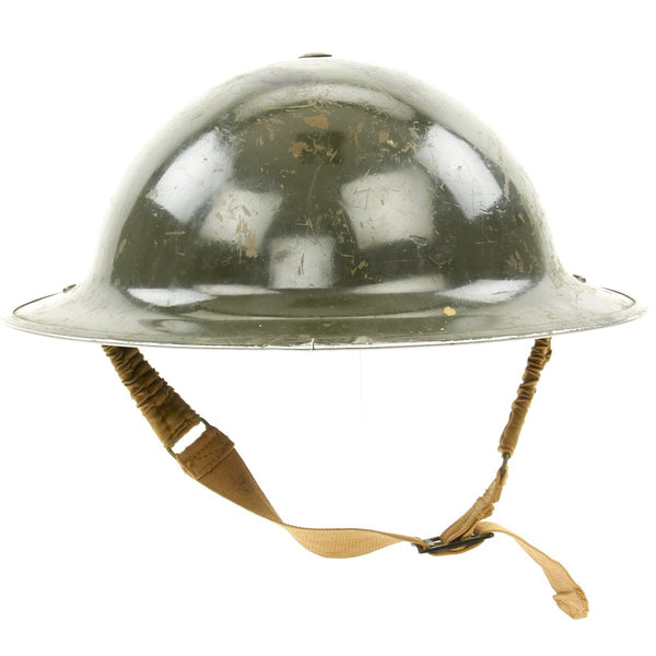 Original Item: Only One Available. This is an exceptional example of a genuine Canadian -manufactured Mark II steel helmet, which is dated 1941 on the shell, and 1942 on the liner. The stamping on the underside of the rim reads: G. S.W. H MK II 1941 G.S.W. stands for General Steel Wares and Aluminum Goods of Toronto, who made helmets from 1940 to 1942. While this helmet is stamped with Mk I, that is the designation GSW used for the first shell version of the MkII Helmet, so this is definitely a MkII helmet. The paint appears to be in very good condition, though it does look to have been field repainted once in a darker green, and there is a black area painted on the crown, possibly to reduce reflection. Shell is overall in great shape with no major issues. The original liner is also in excellent condition and reads: 6 7/8 V.M.CI I1942 Viceroy Manufacturing Company was one of the two liner manufacturers in Canada during the war. The chin strap is in perfect springy condition, with some wear, and has the Canadian Broad Arrow in C logo. History of the Brodie helmet: The Brodie helmet, called Helmet, steel, Mark I helmet in Britain and the M1917 Helmet in the U.S., is a steel combat helmet designed and patented in 1915 by Englishman John Leopold Brodie. Colloquially, it was called the shrapnel helmet, Tommy helmet, Tin Hat, and in the United States the doughboy helmet. Worn by Australians during WW2 and sometimes known as 'Panic Hat'. It was also known as the dishpan hat, tin pan hat, washbasin, battle bowler (when worn by officers), and Kelly helmet. The US version, the M1917, was copied from the British Mk 1 steel helmet of 1916. The German Army called it the Salatschüssel (salad bowl). At about the same time, the British War Office had seen a similar need for steel helmets. The War Office Invention Department was ordered to evaluate the French design. They decided that it was not strong enough and too complex to be swiftly manufactured. British industry was not geared up to an all-out effort of war production in the early days of World War I, which also led to the shell shortage of 1915. A design patented in 1915 by John L. Brodie of London offered advantages over the French design. It was constructed in one piece that could be pressed from a single thick sheet of steel, giving it added strength. Brodie's design resembled the medieval infantry kettle hat or chapel-de-fer, unlike the German Stahlhelm, which resembled the medieval sallet. The Brodie had a shallow circular crown with a wide brim around the edge, a leather liner and a leather chinstrap. The helmet's "soup bowl" shape was designed to protect the wearer's head and shoulders from Shrapnel shell projectiles bursting from above the trenches. The design allowed the use of relatively thick steel that could be formed in a single pressing while maintaining the helmet's thickness. This made it more resistant to projectiles but it offered less protection to the lower head and neck than other helmets. The original design (Type A) was made of mild steel with a brim 1.5-2 inches (38-51 mm) wide. The Type A was in production for just a few weeks before the specification was changed and the Type B was introduced in October 1915. The specification was altered at the suggestion of Sir Robert Hadfield to a harder steel with 12% manganese content, which became known as "Hadfield's steel", which was virtually impervious to shrapnel balls hitting from above. Ballistically this increased protection for the wearer by 10 percent. It could withstand a .45 caliber pistol bullet traveling at 600 feet (180 m) per second fired at a distance of 10 feet (3.0 m). It also had a narrower brim and a more domed crown. The original paint scheme, suggested by Brodie, was a mottled light green, blue, and orange camouflage but they were also painted in green or blue-grey. That same month the first delivery of the helmets was made to British Army troops. Initially, there were far from enough helmets to equip every man, so they were designated as "trench stores", to be kept in the front line and used by each unit that occupied the sector. It was not until the summer of 1916, when the first one million helmets had been produced, that they could be generally issued. The Brodie helmet reduced casualties but was criticized by General Herbert Plumer on the grounds that it was too shallow and too light-reflective, its rim was too sharp, and its lining was too slippery. These criticisms were addressed in the Mark I model helmet of 1916, which had a separate folded rim, a two-part liner and matte khaki paint finished with sand, sawdust, or crushed cork to give a dull, non-reflective appearance. In 1917, the liner was modified to include a rubber cushion to make it more comfortable, although this was not adopted for the M1917. Towards the end of the war, helmets were often painted with unit insignia. These are often called "parade helmets" by collectors.