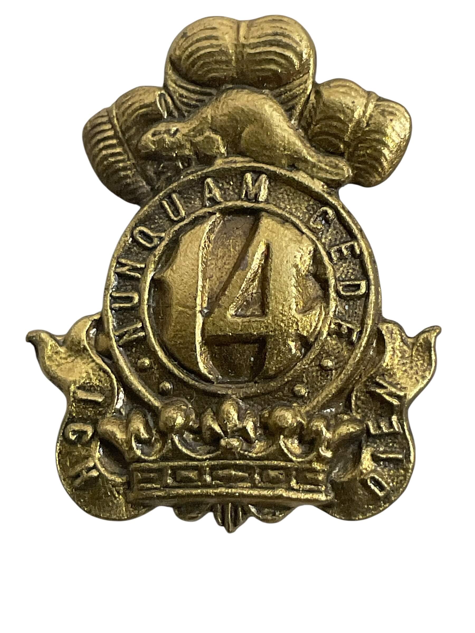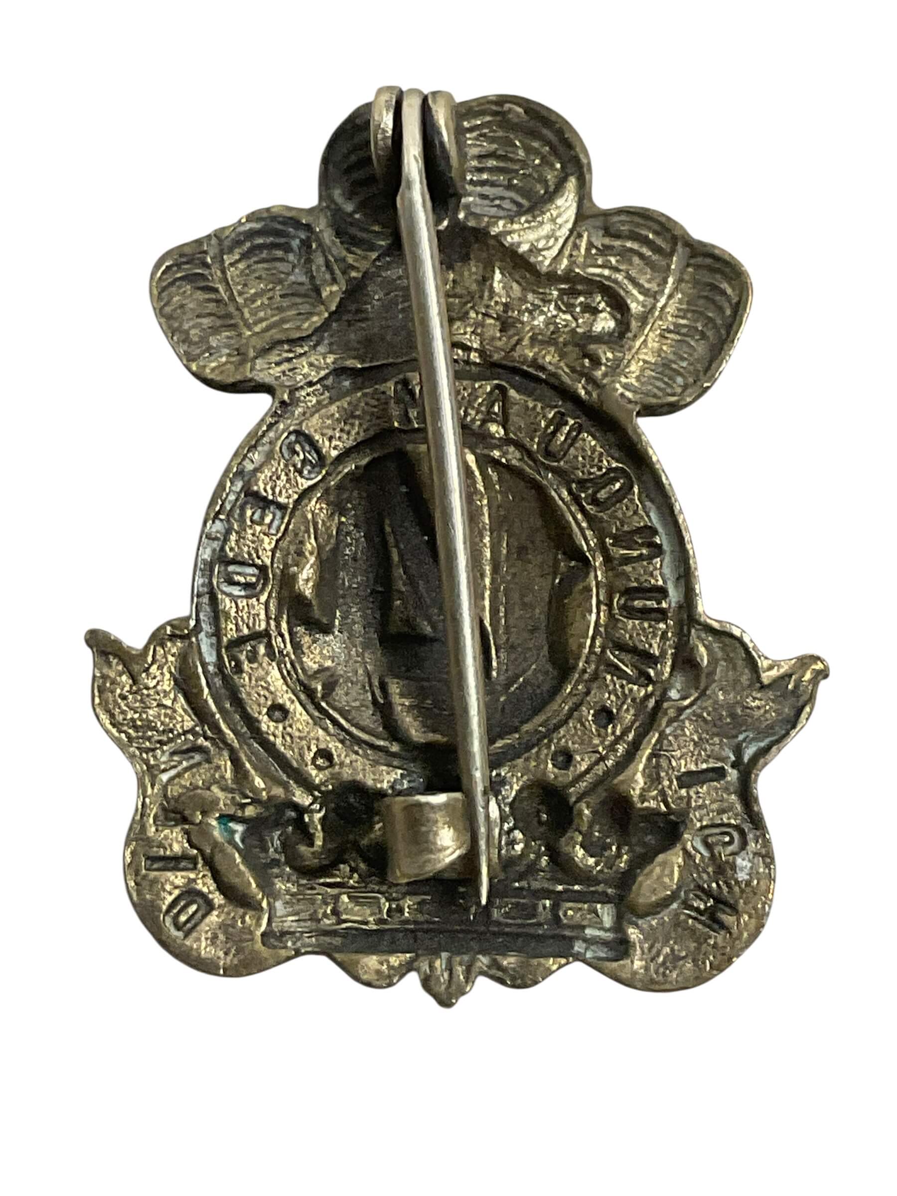 The 14th Princess of Wales’ Own Regiment (PWOR) Collar Insignia is a single piece of uniform insignia used by the Canadian militia unit known as the Princess of Wales’ Own Regiment. This regiment, originally established in 1863 and based in Kingston, Ontario, has a long tradition within the Canadian Army. The collar insignia typically features regimental symbols, often including the royal cypher or other elements signifying the regiment’s affiliation and heritage. Cast in metal—commonly brass or white metal—these insignia would be worn on the collar of the regimental tunic, distinguishing members of the PWOR. The design reflects the regiment’s British connection and its role in Canadian military history. Collar insignia like this were used throughout the late 19th and 20th centuries and remain a recognizable part of military dress. This single piece is suitable for display, study, or completion of a period uniform.