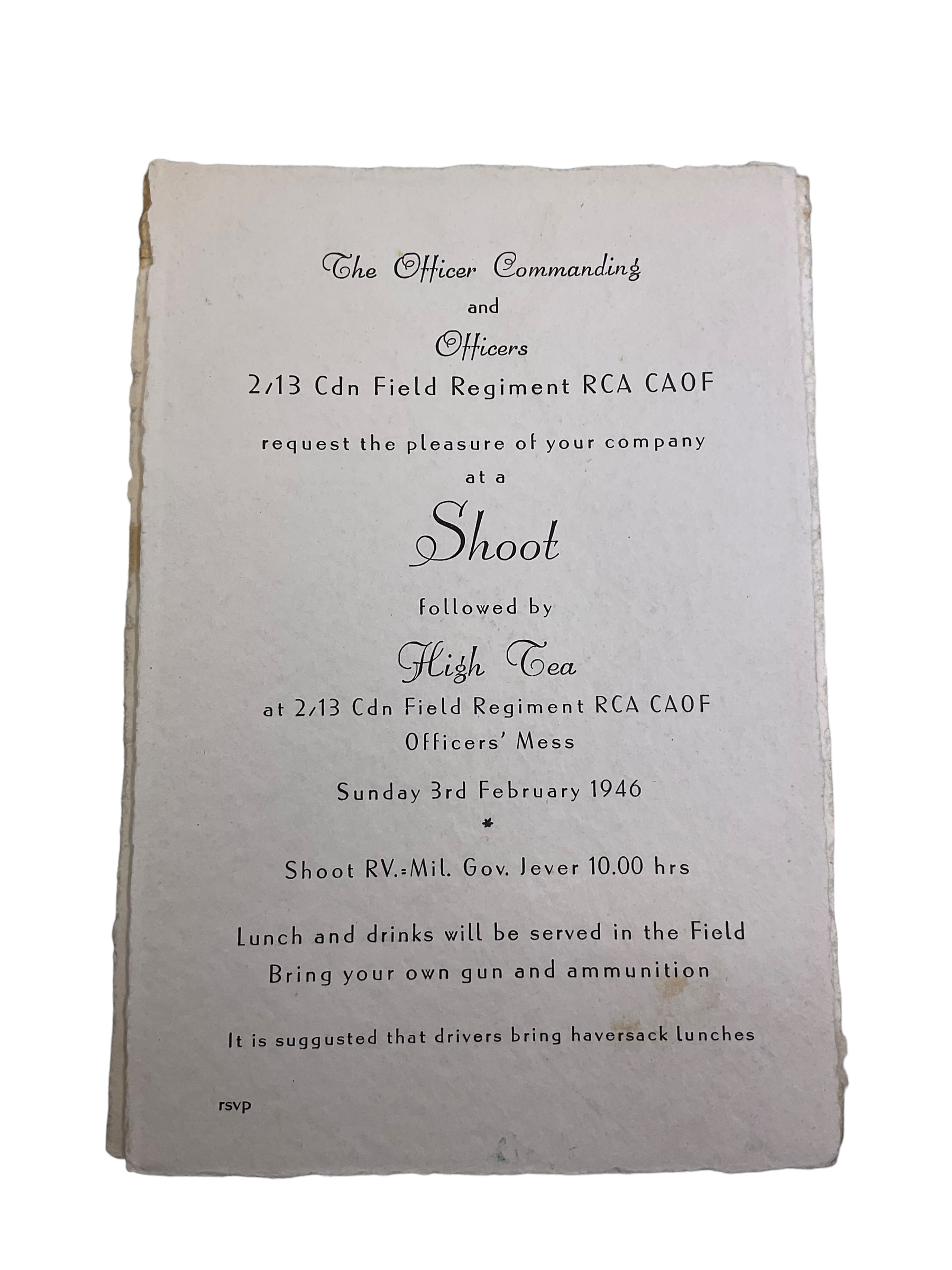 The ‘2/13th Canadian Field Artillery Signed Officers Mess Dinner Shoot’ is a prestigious and commemorative event celebrating the storied history and camaraderie of the 2/13th Canadian Field Artillery officers. This exclusive gathering, held in a formal and elegant setting, offers attendees a unique experience to engage in military traditions while enjoying a luxurious dining experience. Highlighted by a ceremonial shoot, this event is not only a testament to the operational excellence of the regiment but also a reflection of its strong community spirit. Officers and distinguished guests sign a commemorative item to mark their participation and to honor the legacy of the unit. The evening serves as an opportunity for attendees to forge bonds, share stories of service, and pay homage to the valor and heritage of the Canadian Field Artillery. This event remains a cherished tradition within the military community, celebrating discipline, duty, and fellowship.