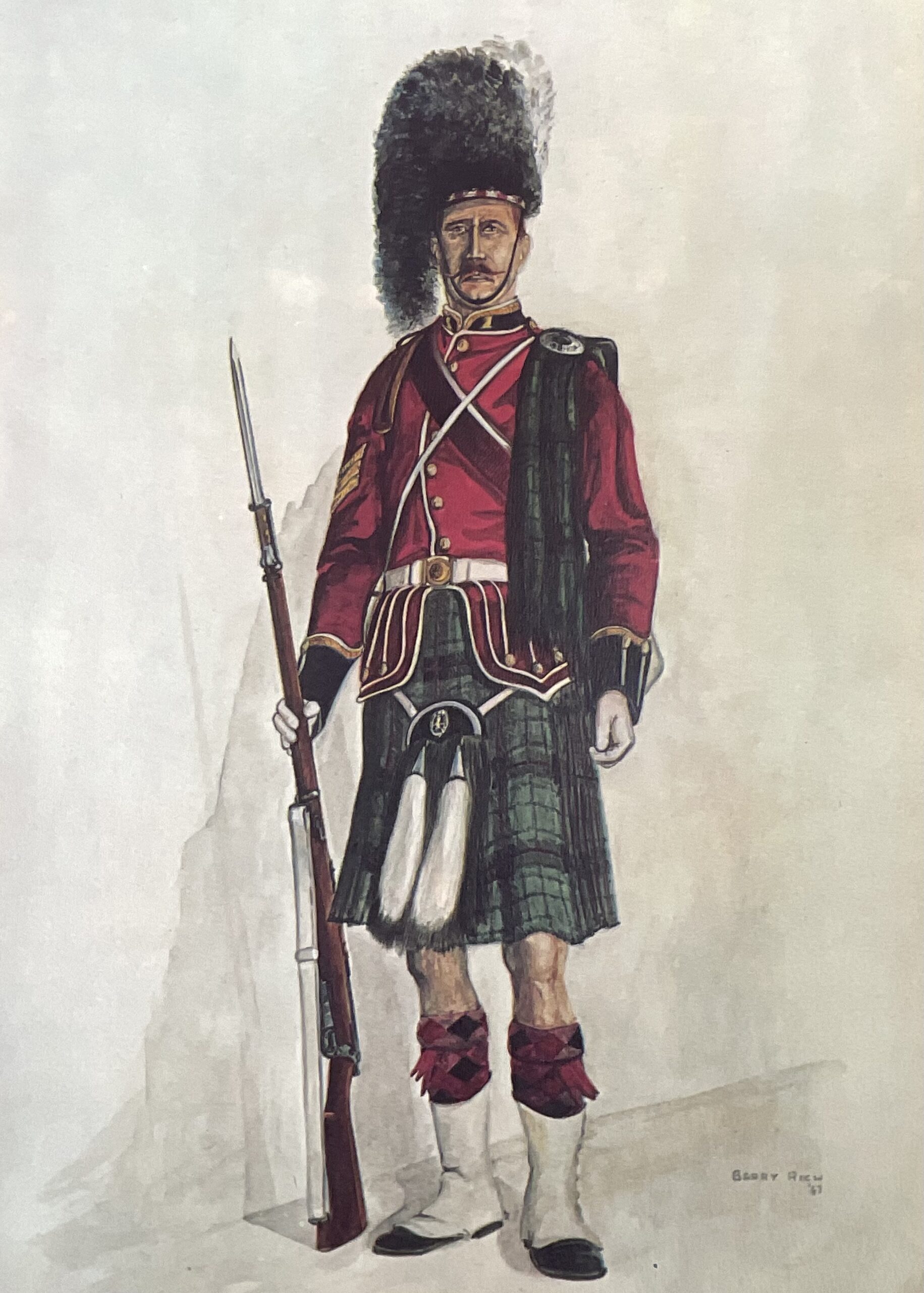 The 48th Highlanders of Canada Numbered Print measures 12 inches by 9 inches and depicts members of the 48th Highlanders, a distinguished regiment of the Canadian Forces established in 1891. This print provides a detailed visual representation of the regiment, known for its distinctive Highland dress, including kilts and feather bonnets, and its extensive service history in both World Wars, as well as peacekeeping missions. The numbering on the print indicates its limited production, appealing to collectors of military memorabilia and Canadian military history. The image captures the regimental insignia and formation, reflecting accurate period uniforms and equipment. The print’s size and composition make it suitable for display or archival purposes. This item serves as a historical reference for those studying Canadian military units, regimental traditions, or uniforms. No claims are made regarding the artist or specific date of creation, as these details are not included in the item’s description.