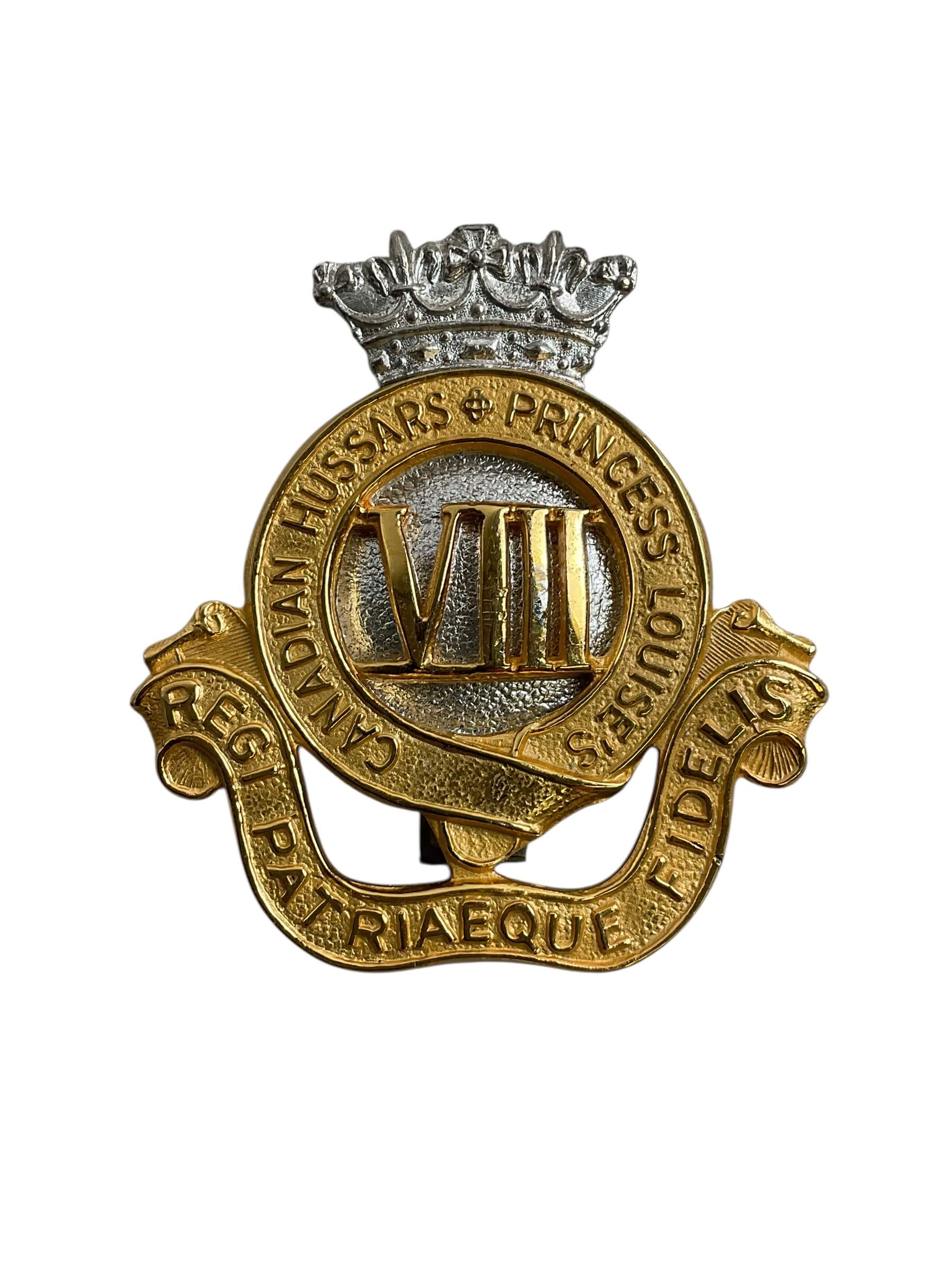 The ‘8th Canadian Hussars Cap Badge’ is an iconic emblem that represents the 8th Canadian Hussars (Princess Louise’s), one of the oldest armored regiments in Canada. This distinguished insignia is steeped in military history, dating back to the regiment’s formation in 1848. The cap badge features the traditional ‘VIII’ number, a symbol of the regiment’s numerical position within the Canadian army. It also includes the Royal Cypher, a tribute to Princess Louise, the regiment’s titular sponsor. The badge is typically made from brass or copper, polished to a high shine, and fastened to the military beret or cap. It is a symbol of honor, service and tradition, embodying the spirit of the men and women who served in the regiment, and those who continue to do so. Owning such a badge is a matter of pride and a tribute to the rich heritage of the Canadian military.