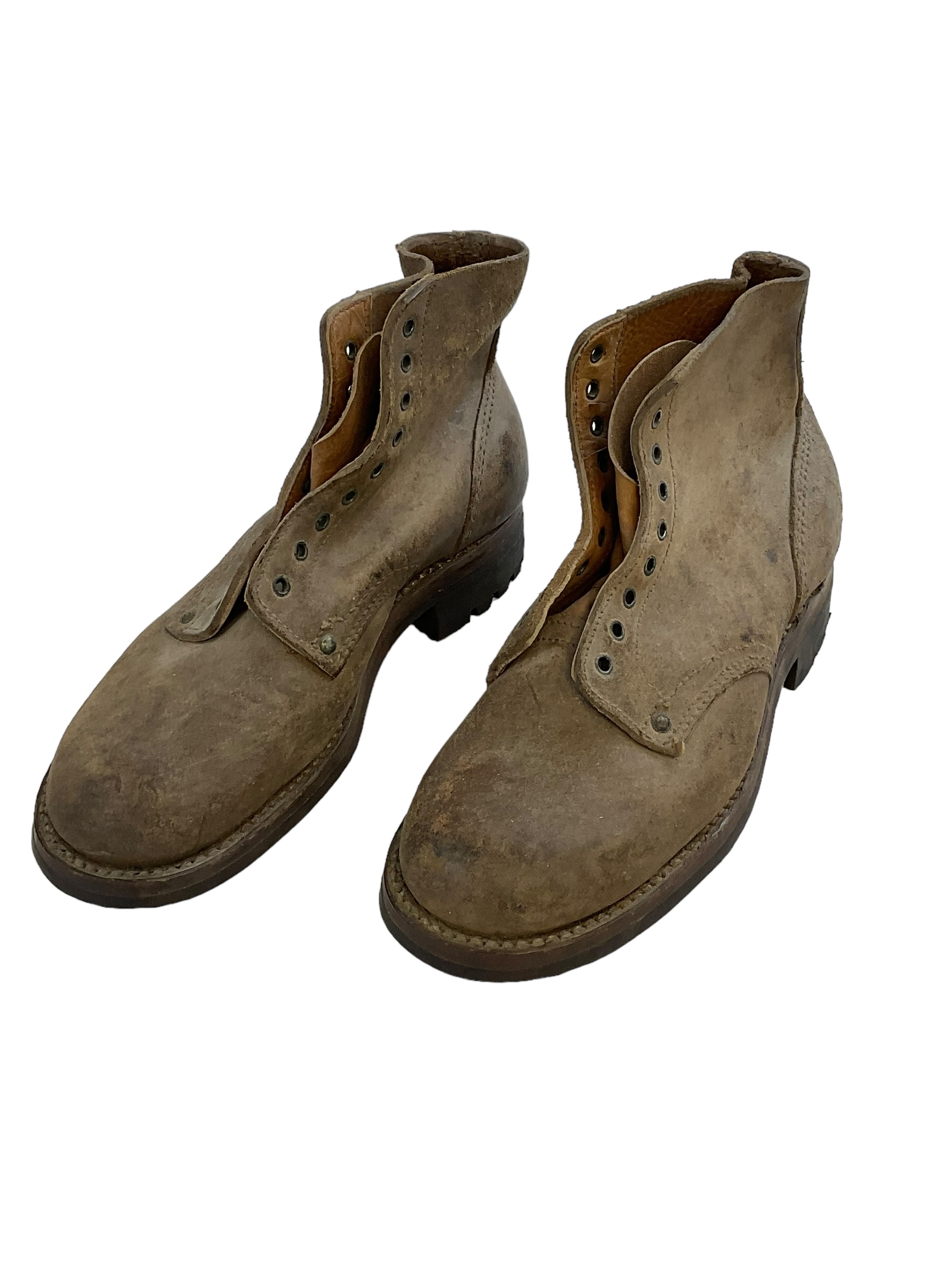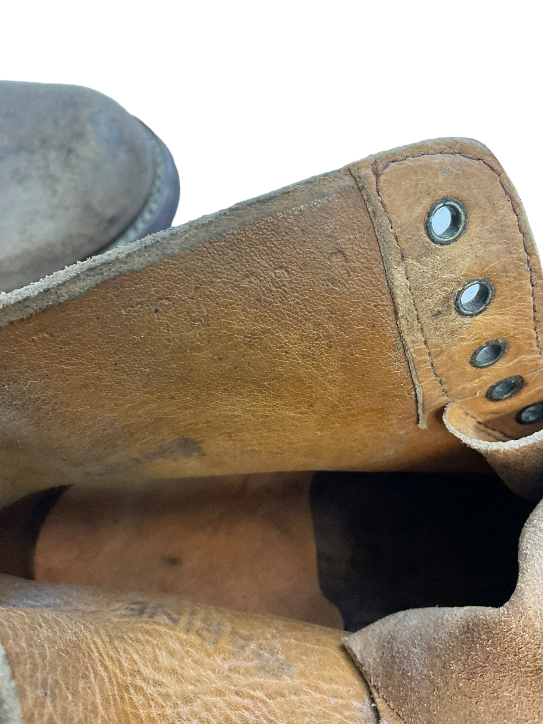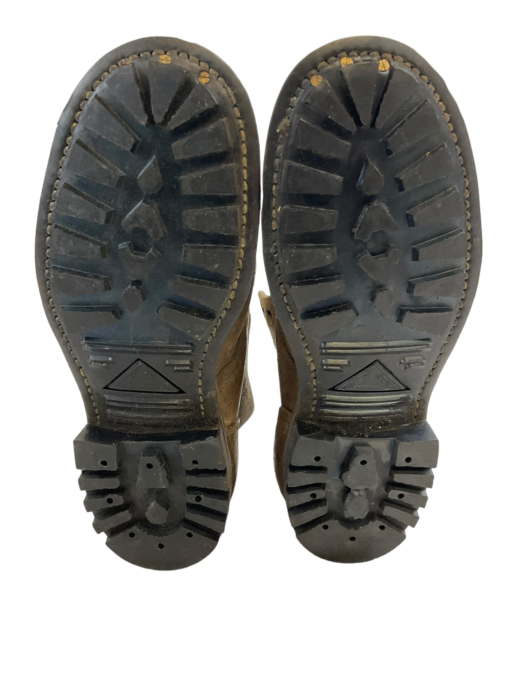 This is a pair of used French TDM Troupes de Marine 9-hole Ankle Boots. Stamped 39 (possibly the size; bottom sole measures approximately 10 3/4″) and MARINE on the inside. The soles are “FIT” Sport Grenoble Chasse. The boots have scuffs and marks, normal leather wear. I ship all over the world. GST of 5% is applicable on all sales within Canada.