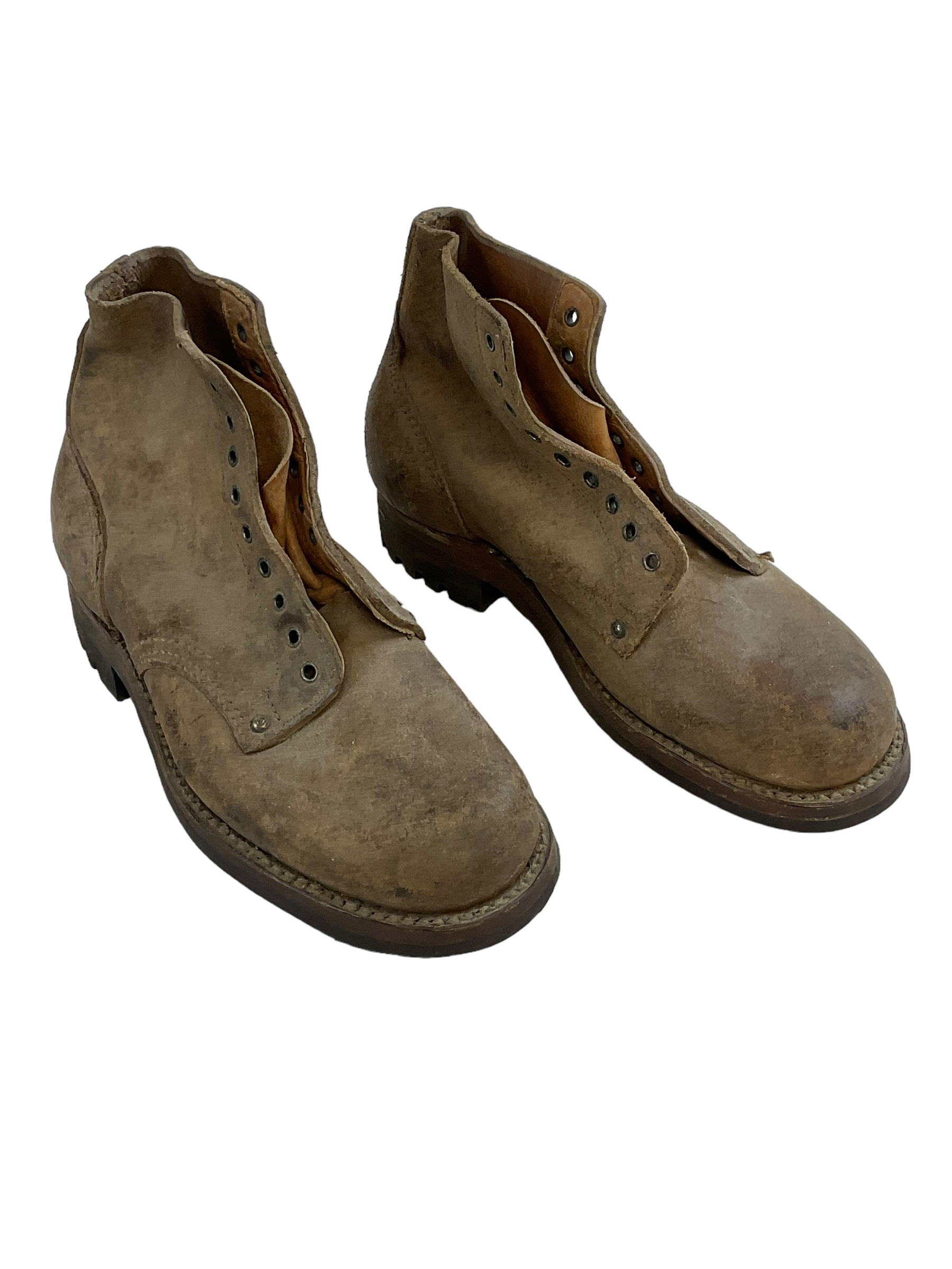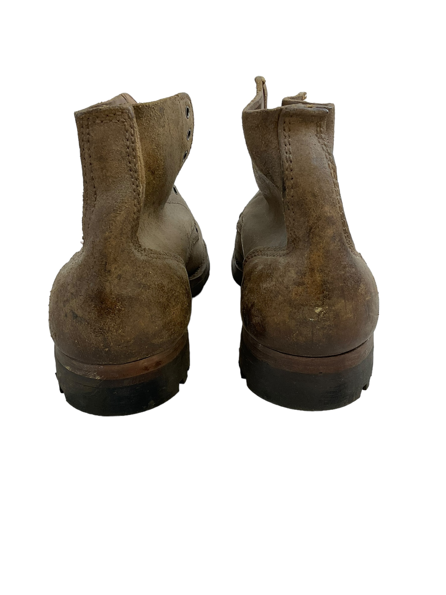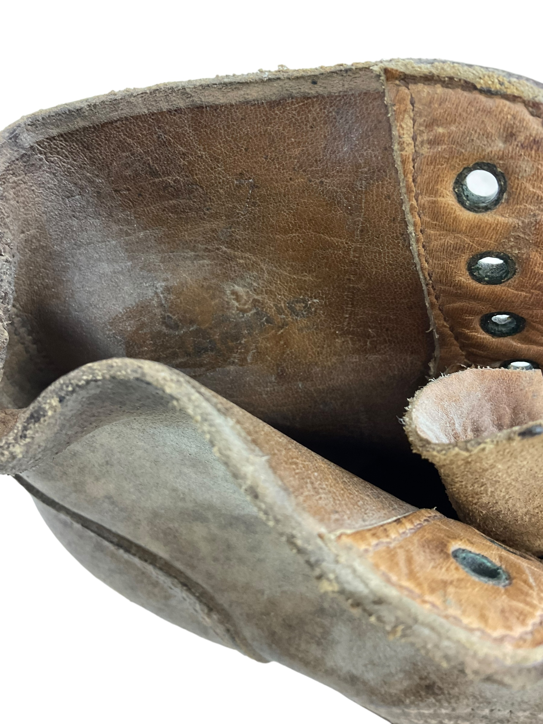 This is a pair of used French TDM Troupes de Marine 9-hole Ankle Boots. Stamped 39 (possibly the size; bottom sole measures approximately 10 3/4″) and MARINE on the inside. The soles are “FIT” Sport Grenoble Chasse. The boots have scuffs and marks, normal leather wear. I ship all over the world. GST of 5% is applicable on all sales within Canada.