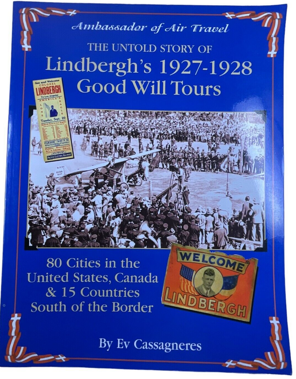 This is a used softcover Ambassador of Air Travel The Untold Story of Lindberghs 1927 to 1928 Good Will Tours 80 Cities in the United States Canada and 15 Countries South of the Border Ev Cassagneres Reference Book.  Total of 348 pages with lots of pictures and information.