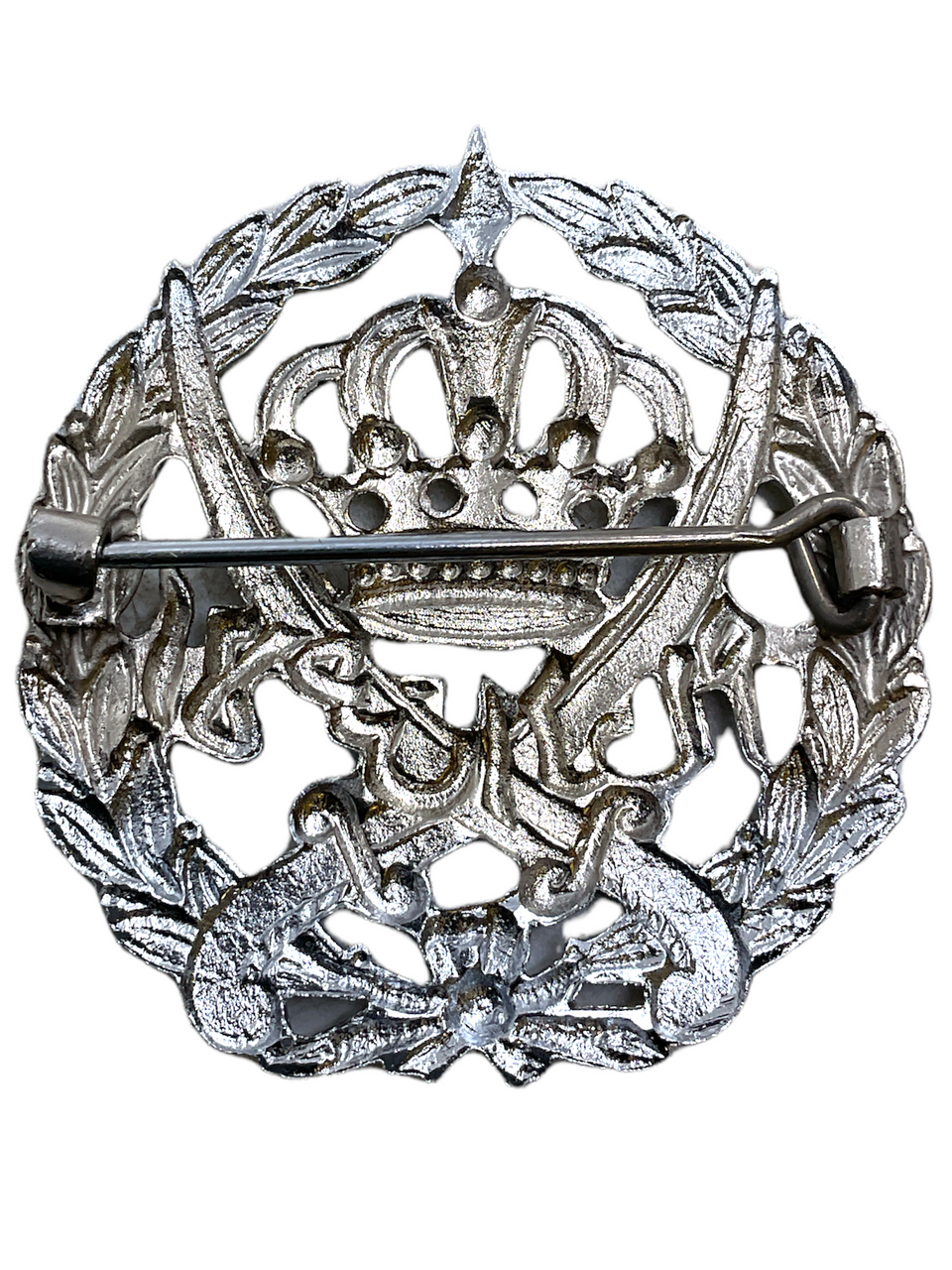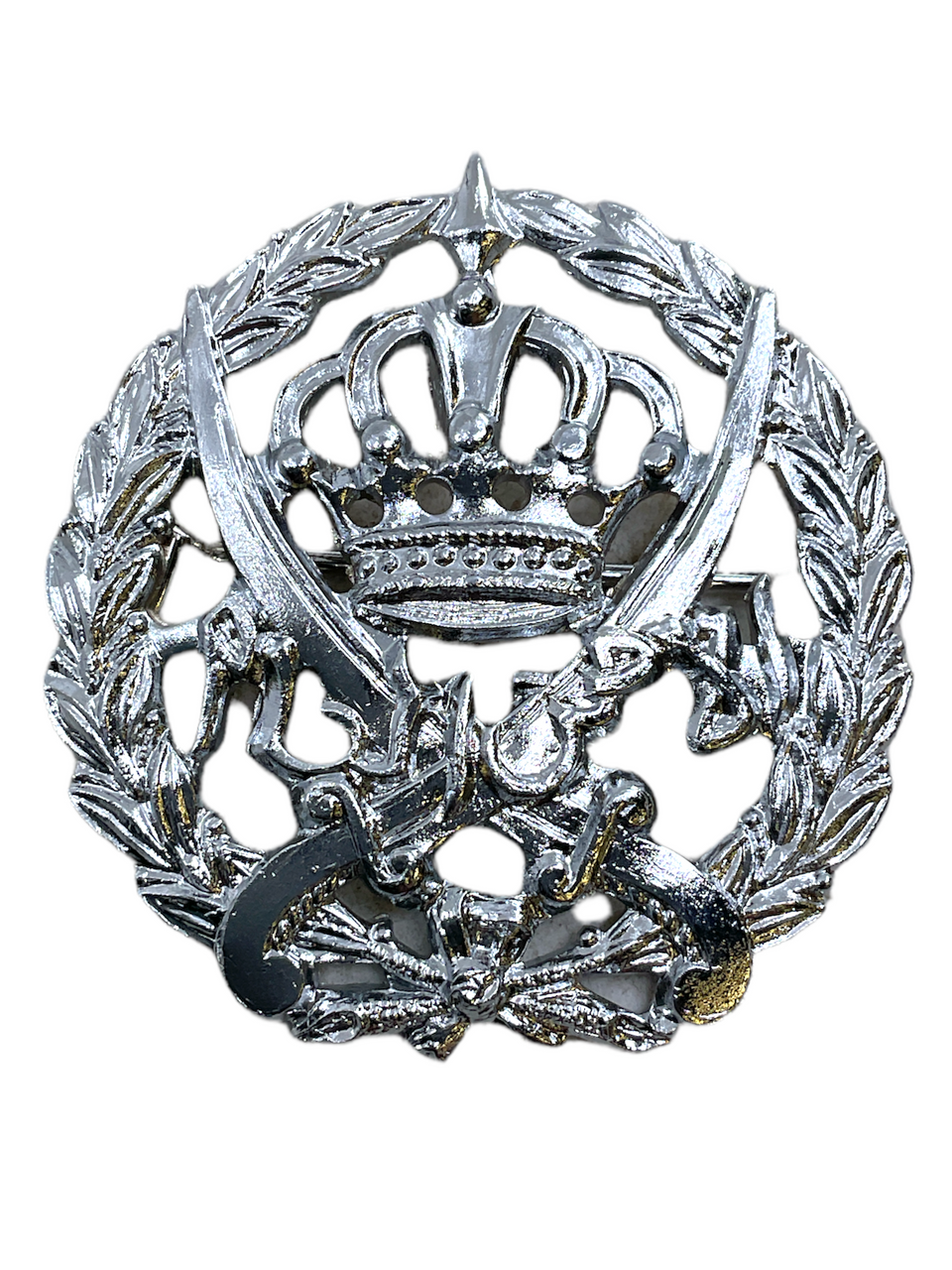 The “Arab Legion Cap Badge” commemorates the distinguished Arab Legion, a prominent military force established in Jordan during the early 20th century. This intricately designed insignia symbolizes the bravery and unity of the Legion’s soldiers. Typically fashioned from metal, the badge features ornate detailing, often including Arabic script and meaningful symbols such as crescents or stars, that reflect the rich cultural and historical heritage of the Arab world. These badges not only served as a mark of identity and pride for the Legion’s members but also represented their dedication and loyalty to their duty. Collectors and historians value these cap badges for their historical significance and craftsmanship. The Arab Legion played a vital role in regional security and in shaping the modern military landscape of the Middle East, making the cap badge a cherished memento of an influential era in Jordanian and Arab history.