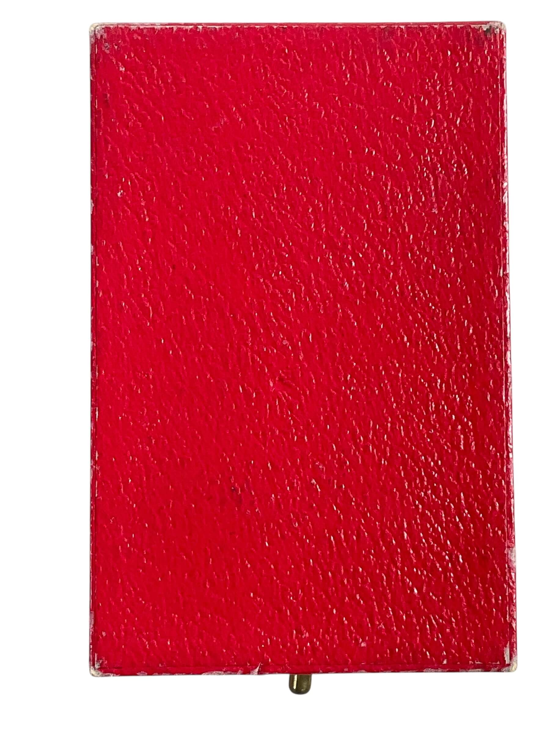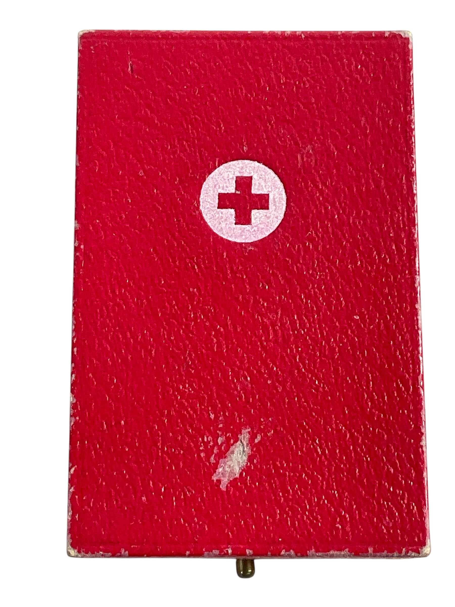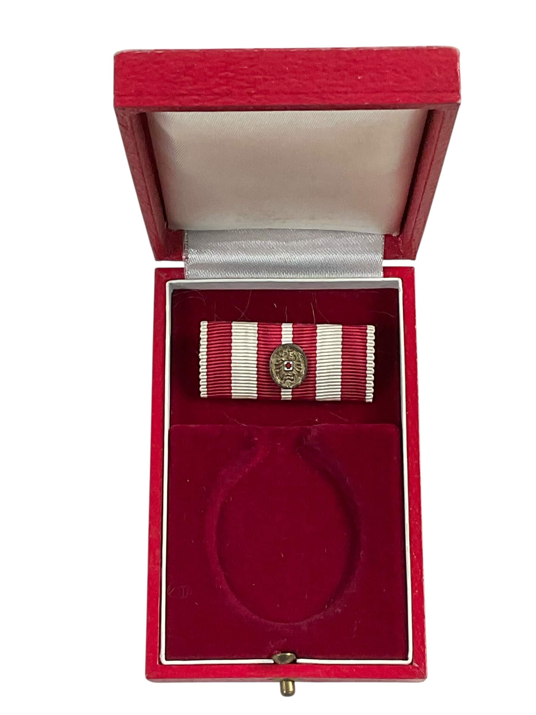 The Austrian Red Cross Medal Box and Ribbon Bar is a presentation set related to the decoration awarded by the Austrian Red Cross. The medal recognizes notable contributions in humanitarian aid and voluntary service within medical and relief contexts. This set includes the original storage box, designed for safekeeping and presentation, typically constructed from hard cardboard or similar material, with fitted inserts to hold the medal and ribbon bar securely. The ribbon