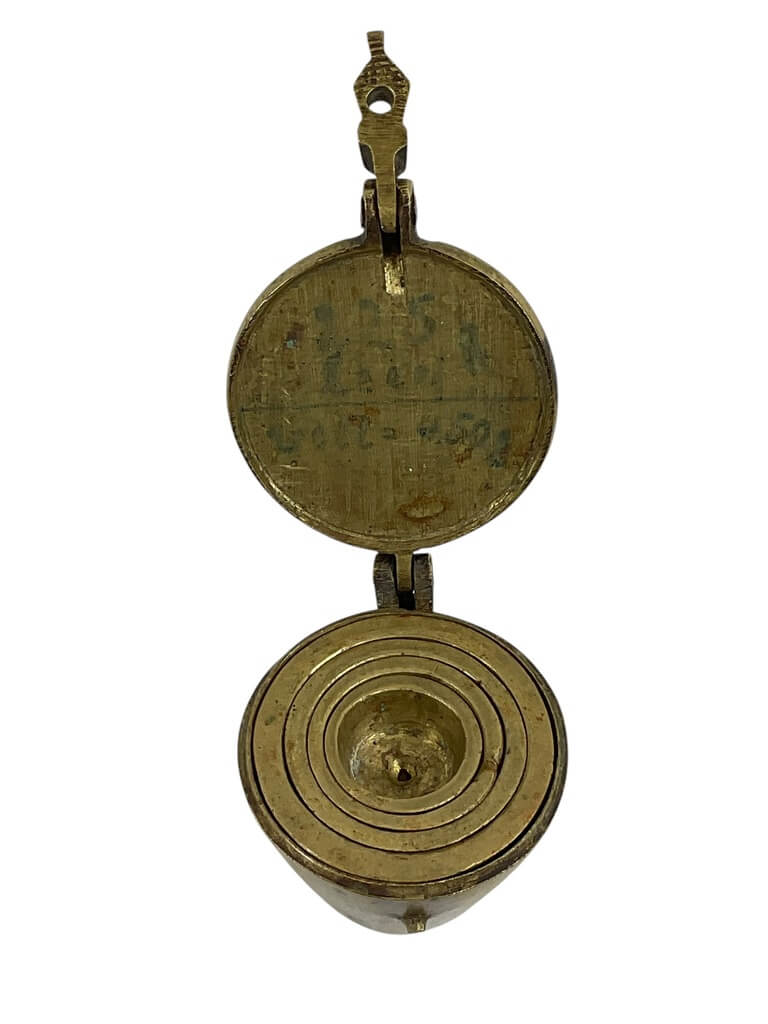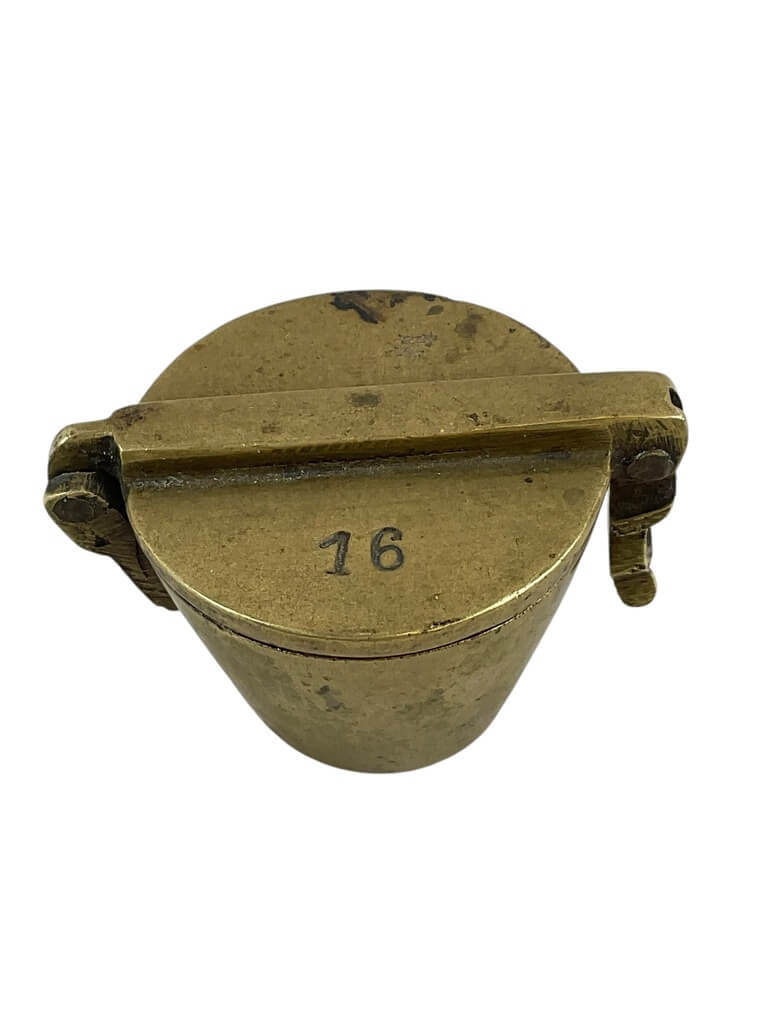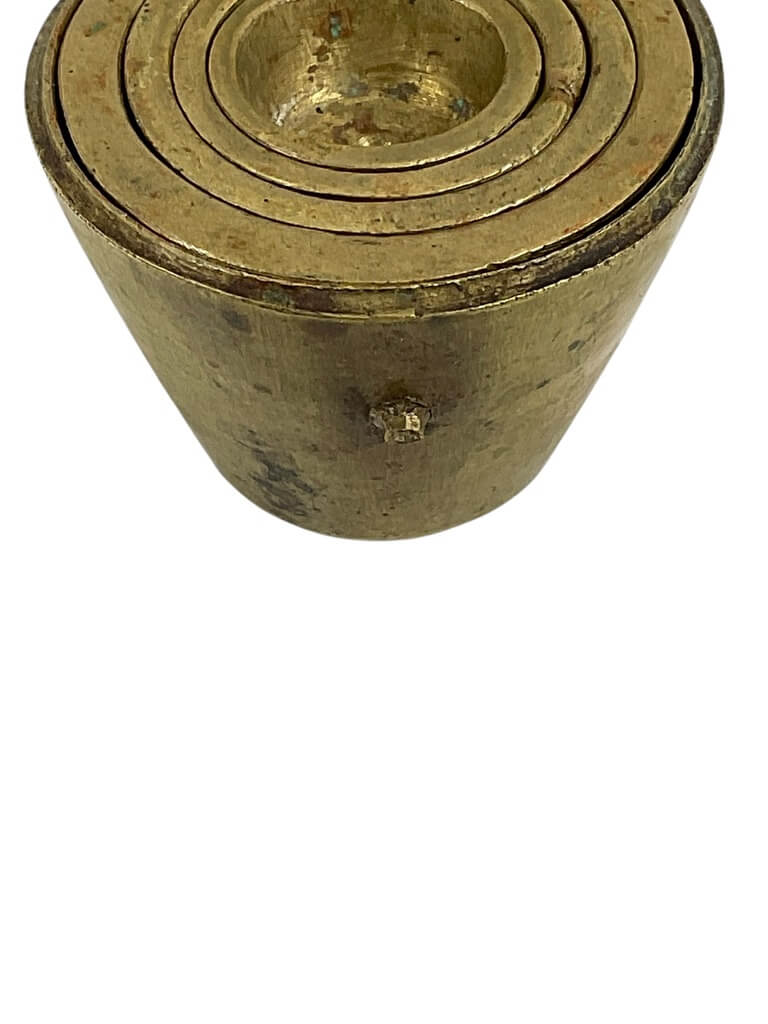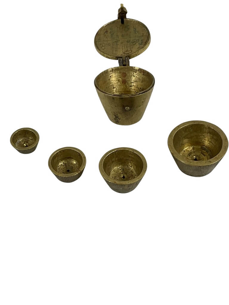 This unique and antique collectible is a Brass Nested Apothecary Cup-Weight Set with Case. The set comprises of intricately designed, graduated brass cups that nest perfectly into one another, signifying meticulous craftsmanship. The weights, historically used by apothecaries or pharmacists to measure ingredients for medicines, echo the precision and detail of times past. Each piece is made of high-quality brass, ensuring durability and longevity. The set comes complete with a beautifully crafted, custom-fit wooden case for secure storage and display. The case also adds a touch of rustic elegance to the overall aesthetic. This Brass Nested Apothecary Cup-Weight Set with Case is not just a functional tool but also a remarkable piece of history, offering a tangible connection to the age-old profession of apothecary. It’s an ideal collectible for those who appreciate vintage tools, historical artifacts, or the art of pharmacy.