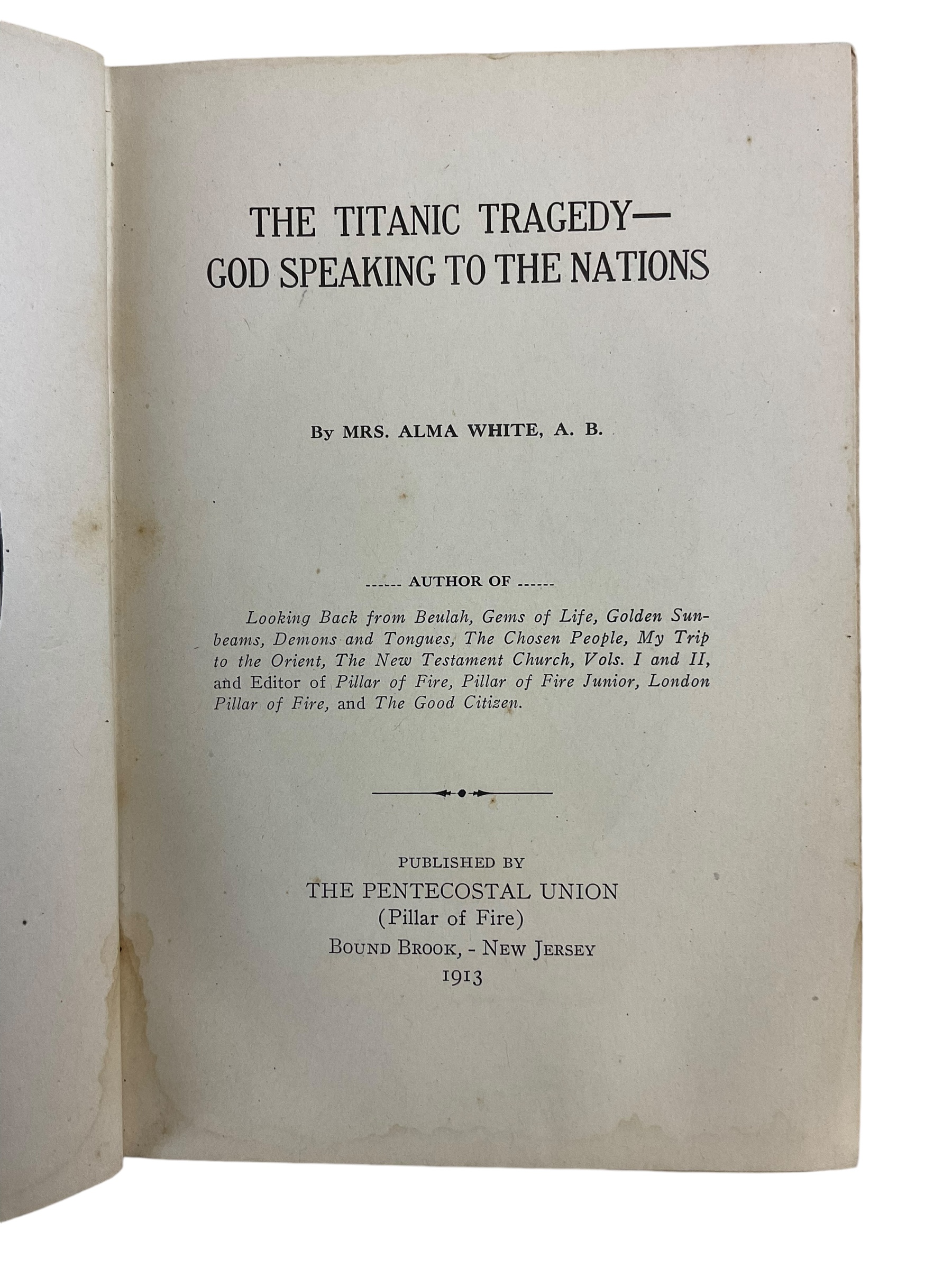A hard Cover Britain Naval The Titanic Tragedy God Speaking To The Nations  Reference Book. Total of 211 pages with several photos  of after the sinking. A religious point of view on Titanic’s sinking. Published in 1912