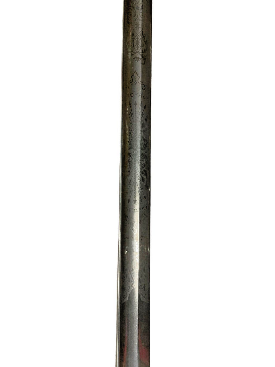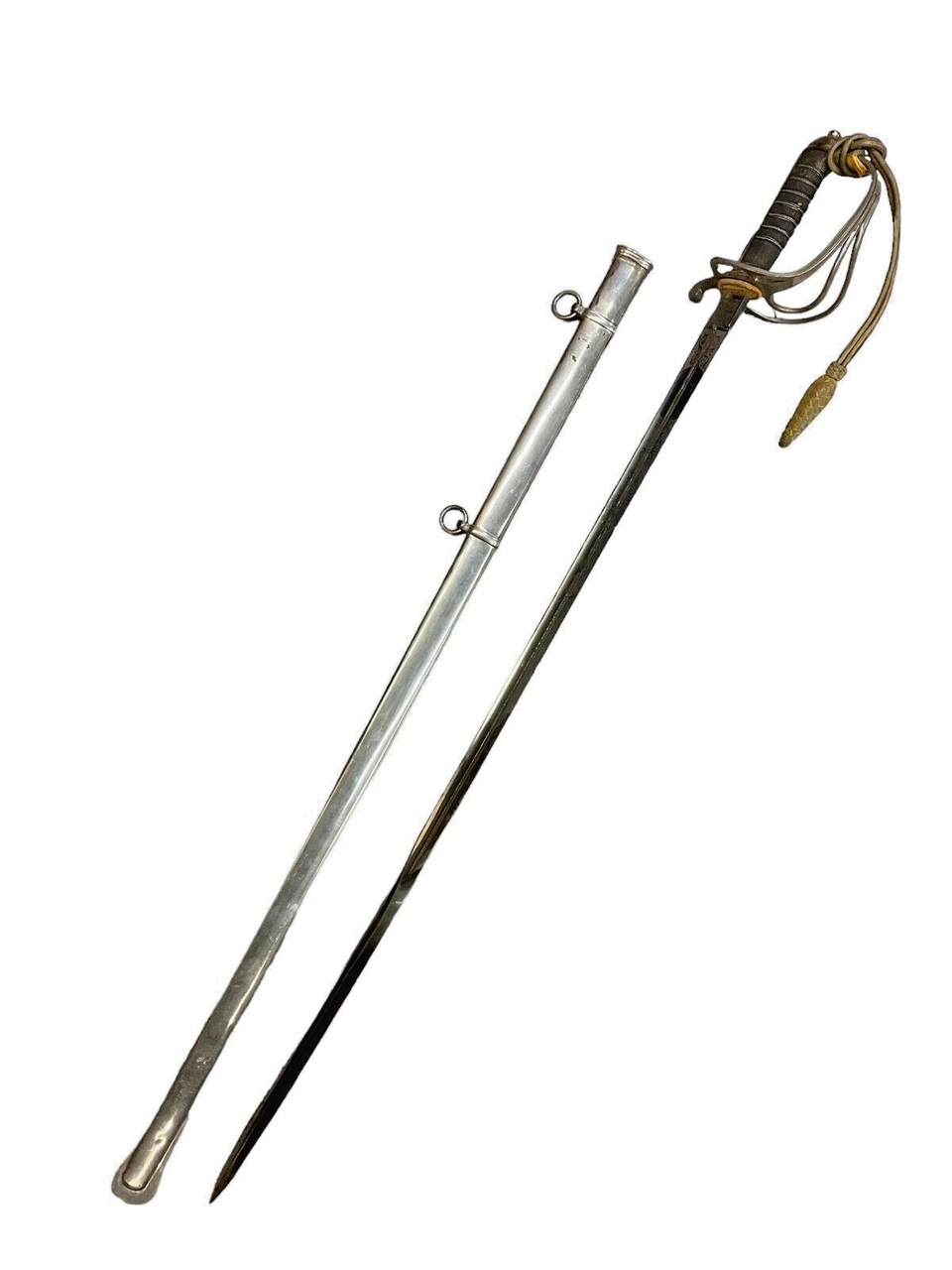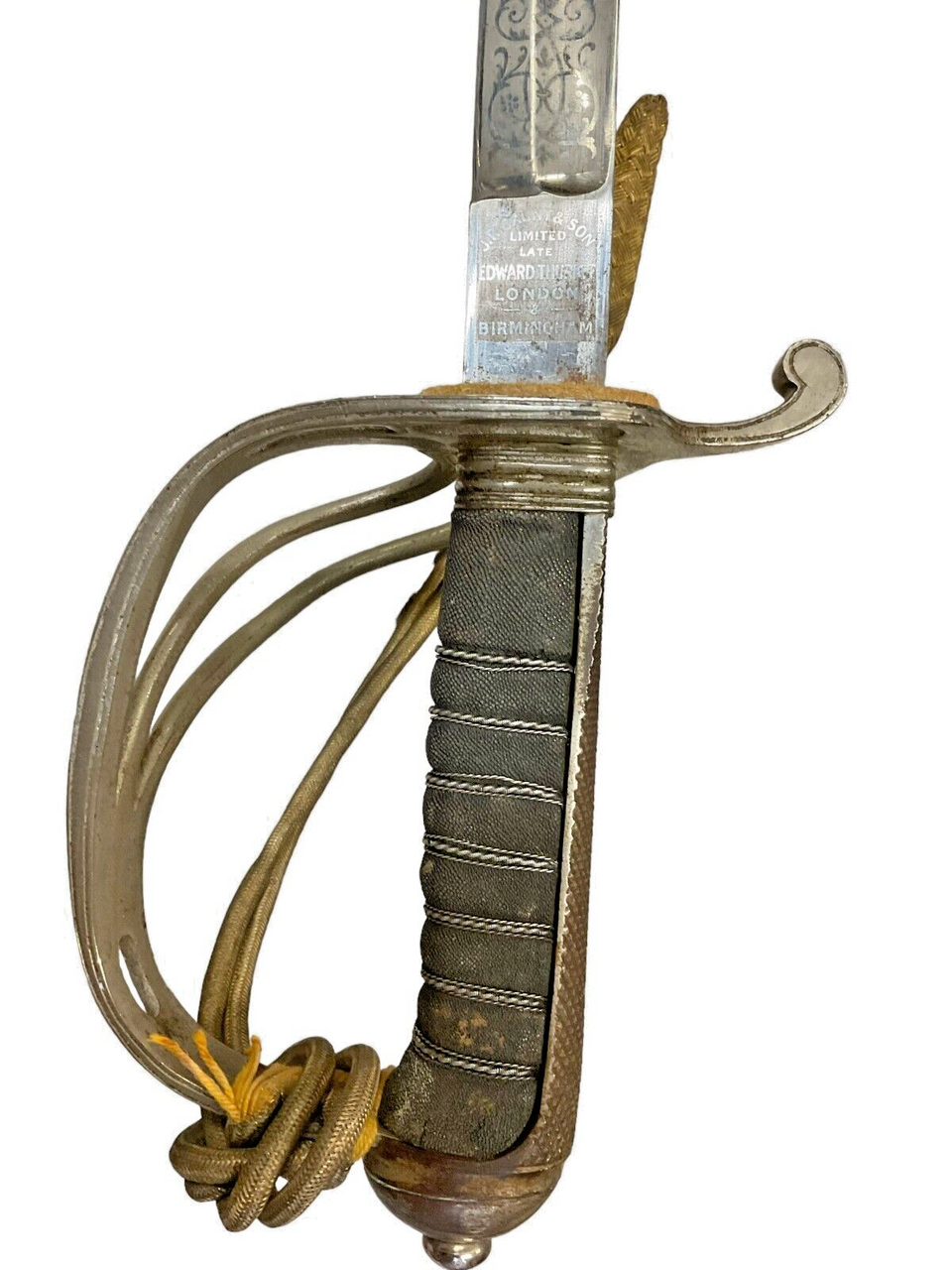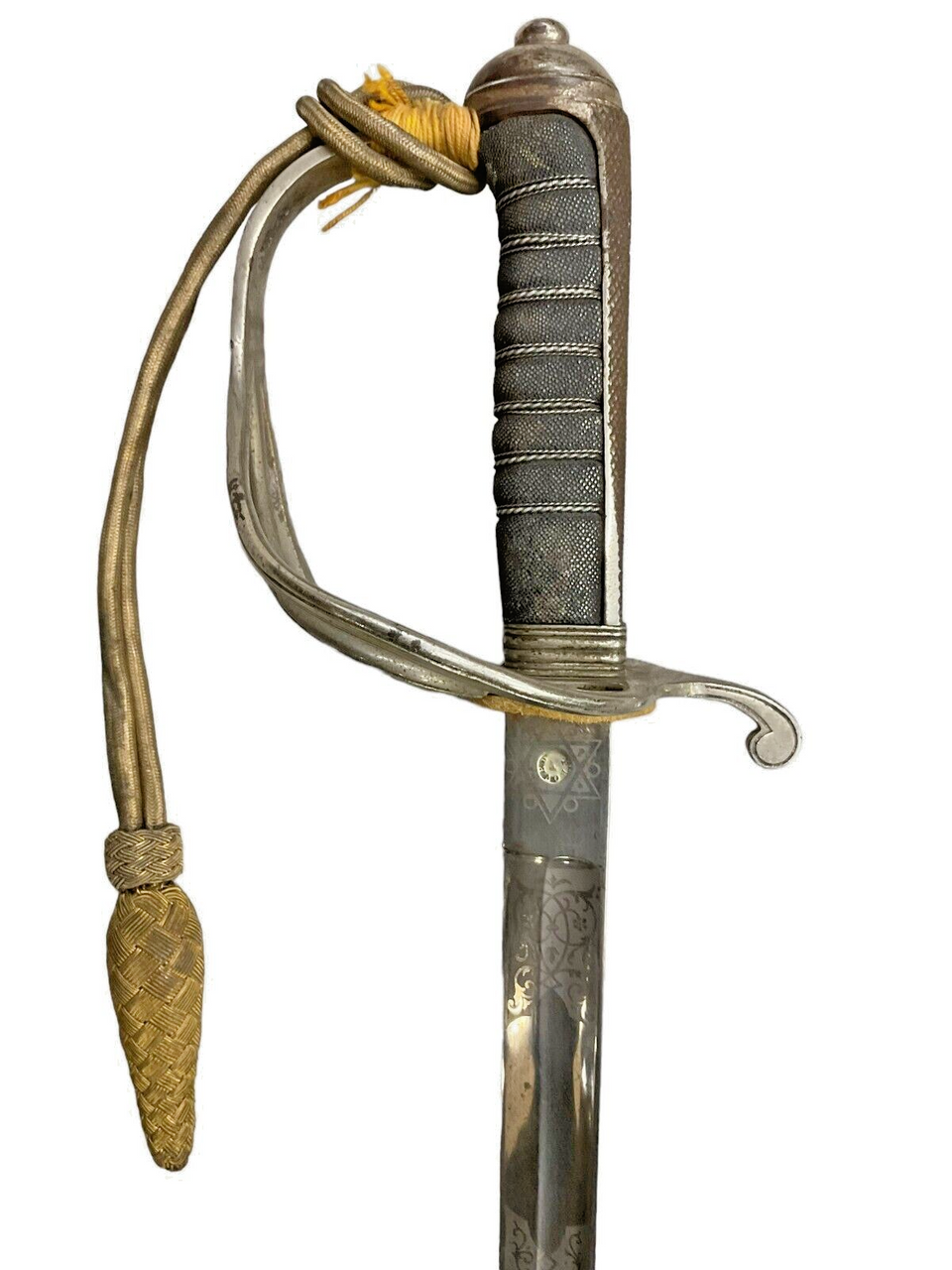 The British 1827 Pattern Artillery Officers Sword, accompanied by its scabbard and knot, is a distinguished piece of military history. This elegant sword features a straight, single-edged blade that is both practical for combat and ceremonial duties. The intricately designed hilt showcases a Gothic-style guard adorned with royal cyphers, reflecting the regal heritage of the British artillery. The grip, wrapped in wire-bound sharkskin or leather, ensures a secure hold. The accompanying steel scabbard provides sturdy protection for the blade, while the decorative sword knot adds a touch of traditional refinement. This sword is not merely a weapon but a symbol of status and honor among British artillery officers of the 19th century, representing a period of significant military craftsmanship and history. Collectors and historians alike will appreciate the blend of artistry and functionality embodied in this iconic British military artifact.