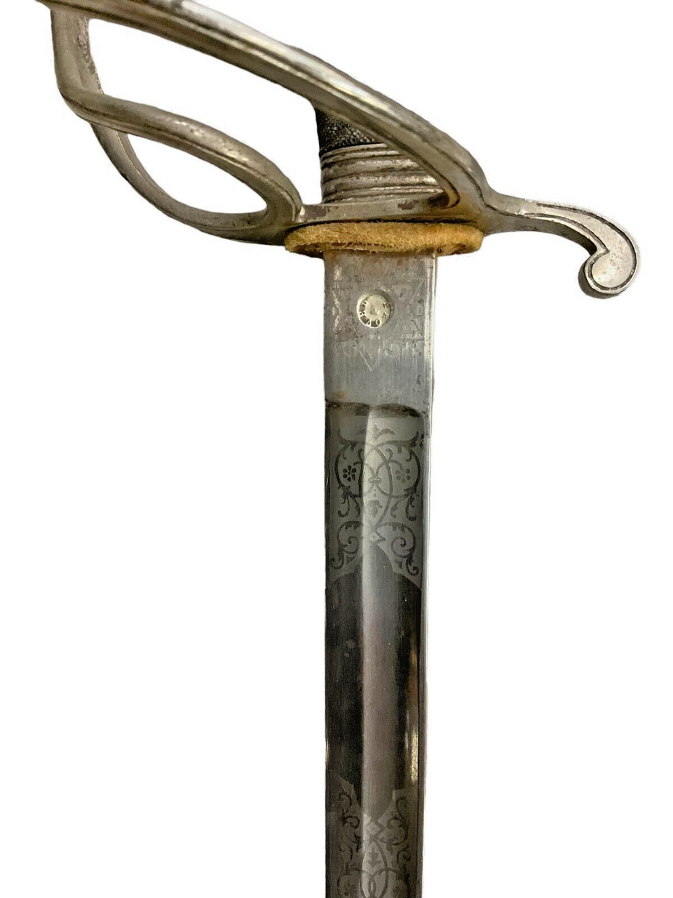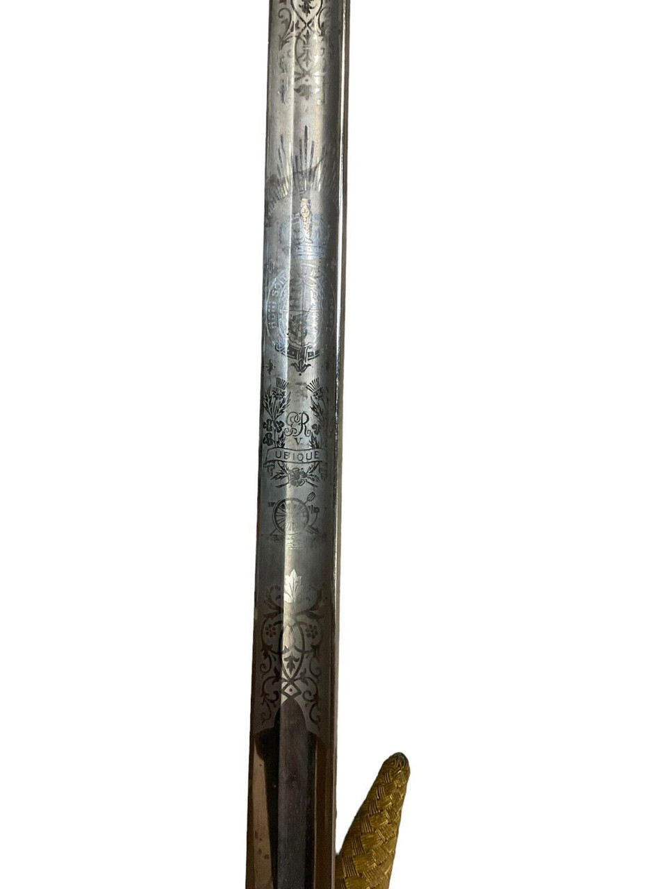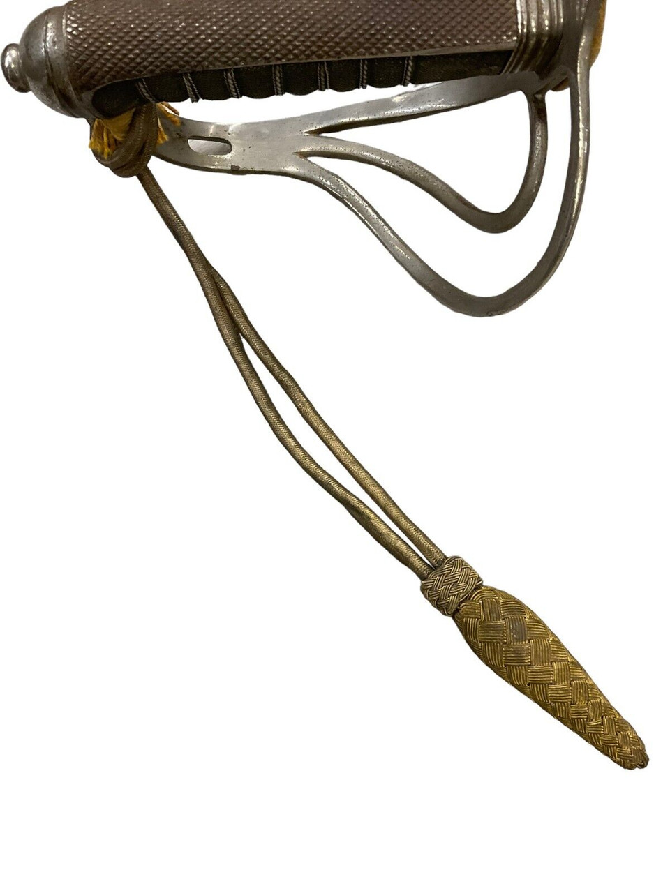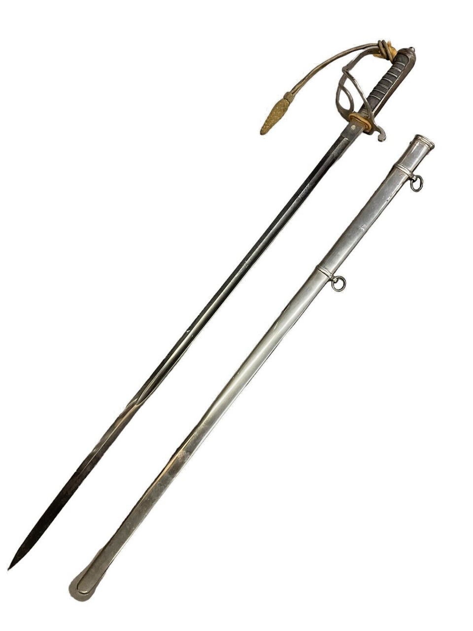 The British 1827 Pattern Artillery Officers Sword, accompanied by its scabbard and knot, is a distinguished piece of military history. This elegant sword features a straight, single-edged blade that is both practical for combat and ceremonial duties. The intricately designed hilt showcases a Gothic-style guard adorned with royal cyphers, reflecting the regal heritage of the British artillery. The grip, wrapped in wire-bound sharkskin or leather, ensures a secure hold. The accompanying steel scabbard provides sturdy protection for the blade, while the decorative sword knot adds a touch of traditional refinement. This sword is not merely a weapon but a symbol of status and honor among British artillery officers of the 19th century, representing a period of significant military craftsmanship and history. Collectors and historians alike will appreciate the blend of artistry and functionality embodied in this iconic British military artifact.