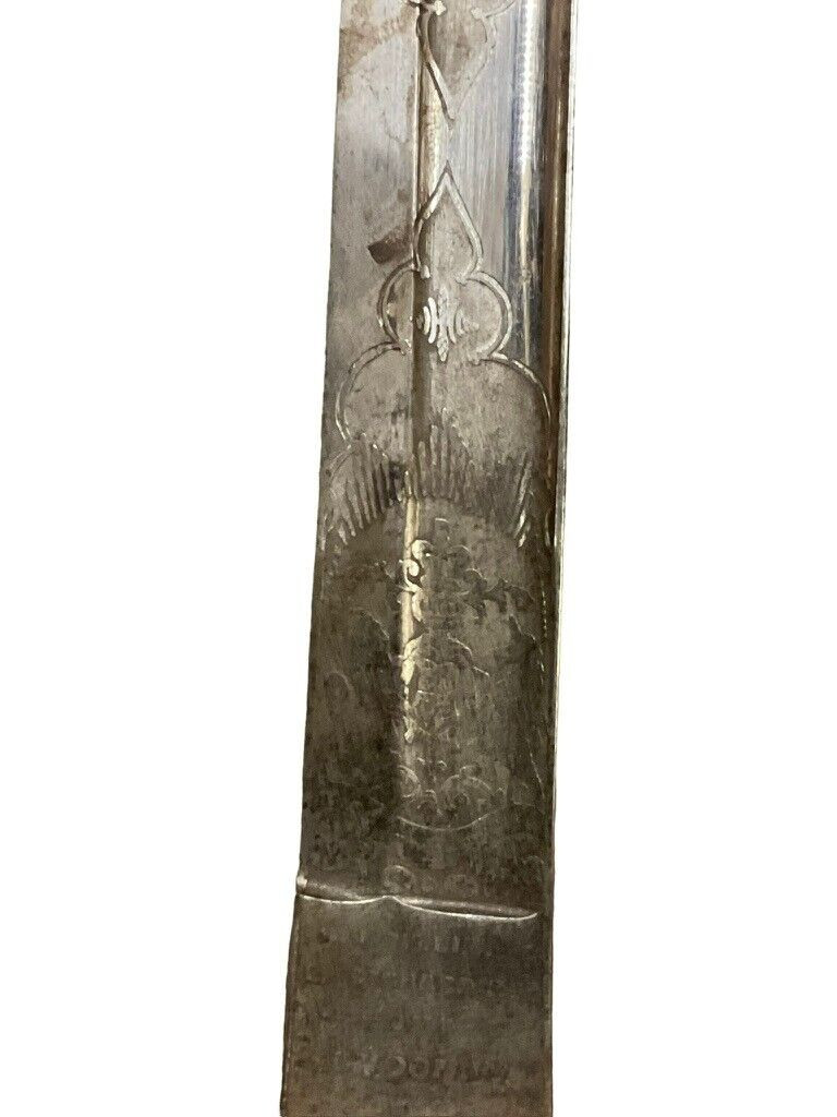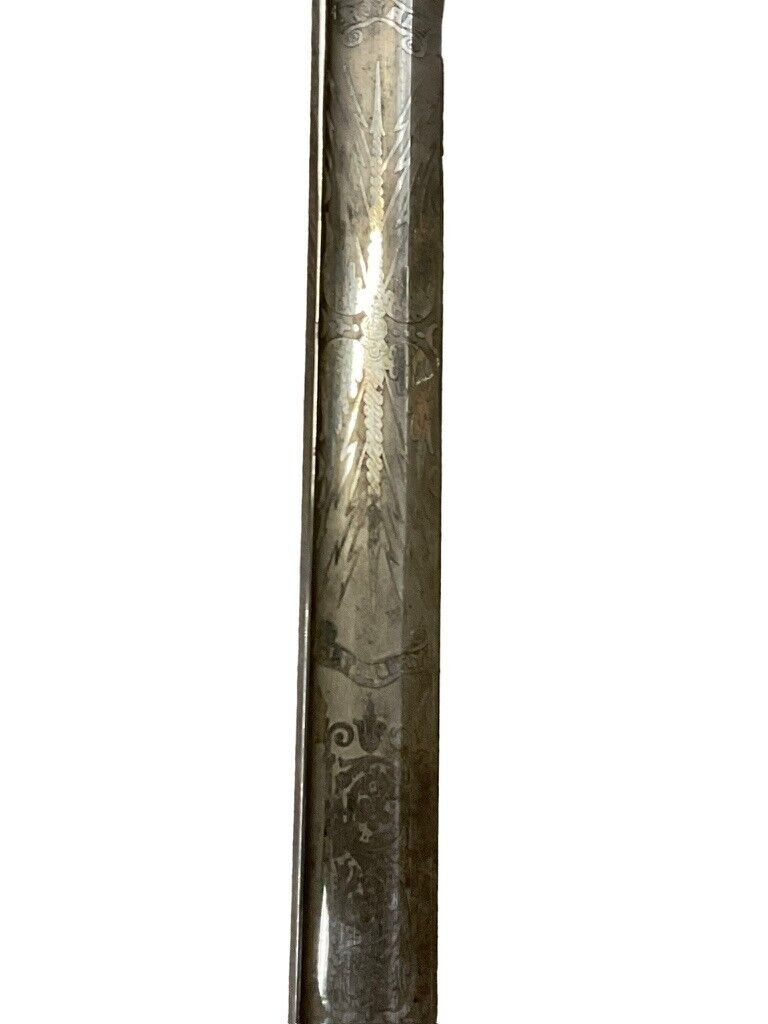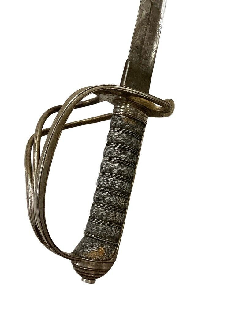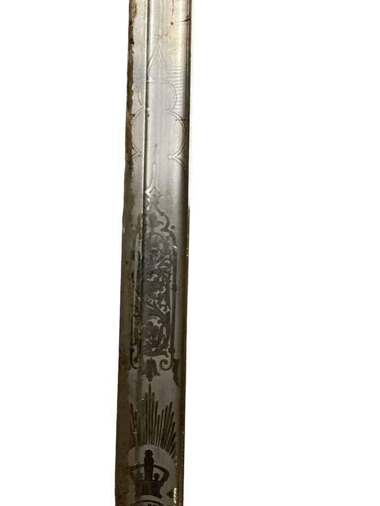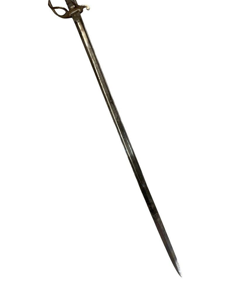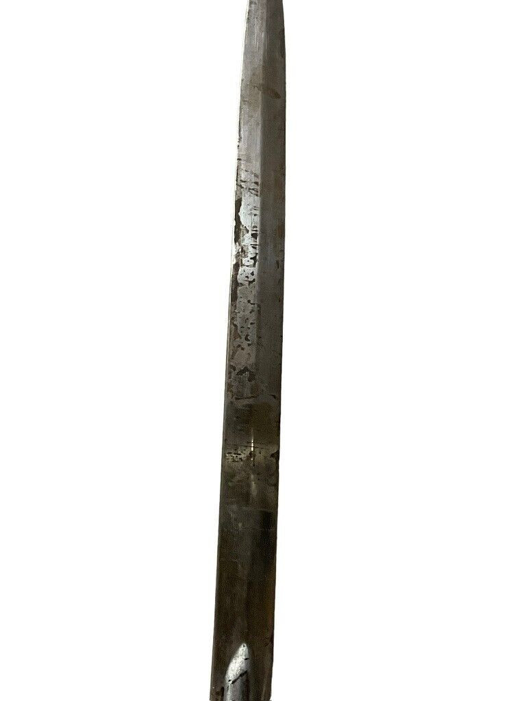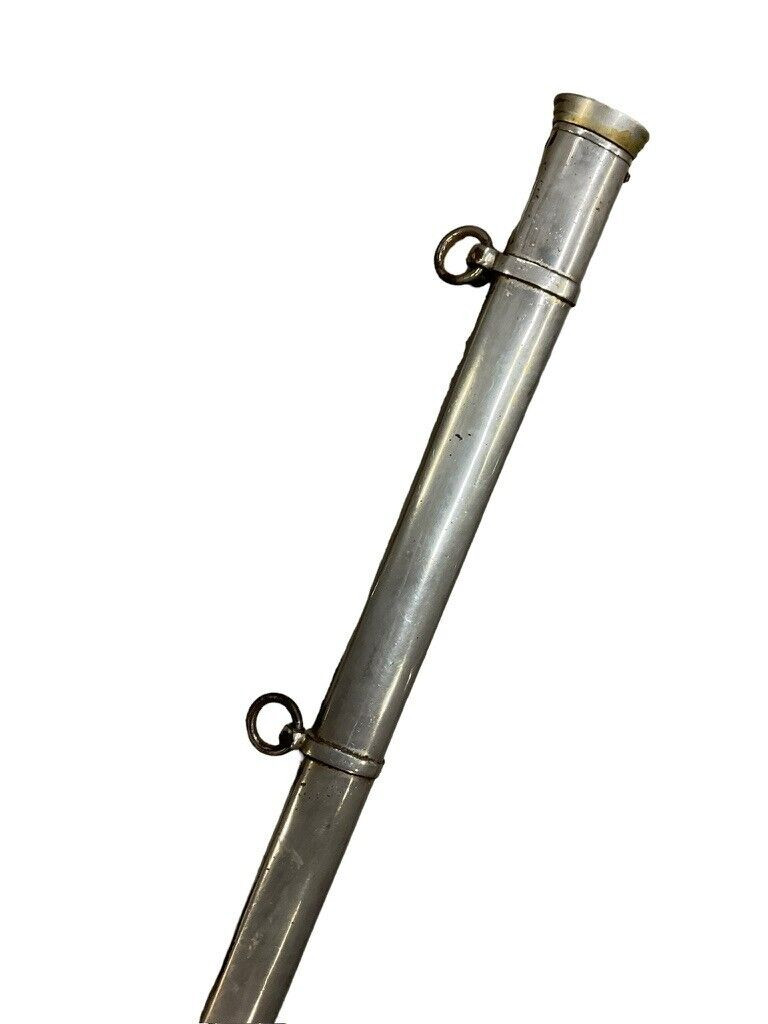 The British 1827 Pattern Artillery Officers Sword with Scabbard is a fine example of military craftsmanship from the early 19th century. This historical piece features a steel blade with intricate etchings, showcasing the attention to detail and artistry of the period. The hilt is adorned with an elegant brass guard and grip, designed for both functionality and sophistication. The sword is complemented by its original scabbard, crafted to provide protection and ease of carry for the officer. This model was specifically designed for artillery officers, reflecting their prestigious role within the British Armed Forces. With its rich history and exquisite design, the 1827 Pattern sword stands as a symbol of tradition and excellence in British military heritage. This sword not only served as a practical weapon but also as a status symbol, making it a valuable and cherished collectible for historians and enthusiasts alike.
