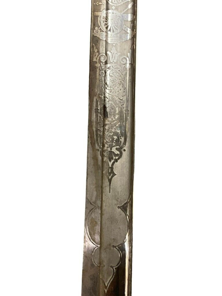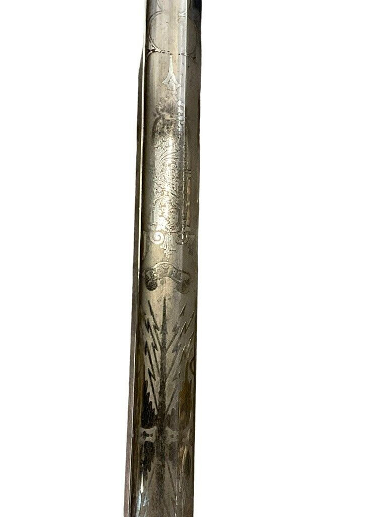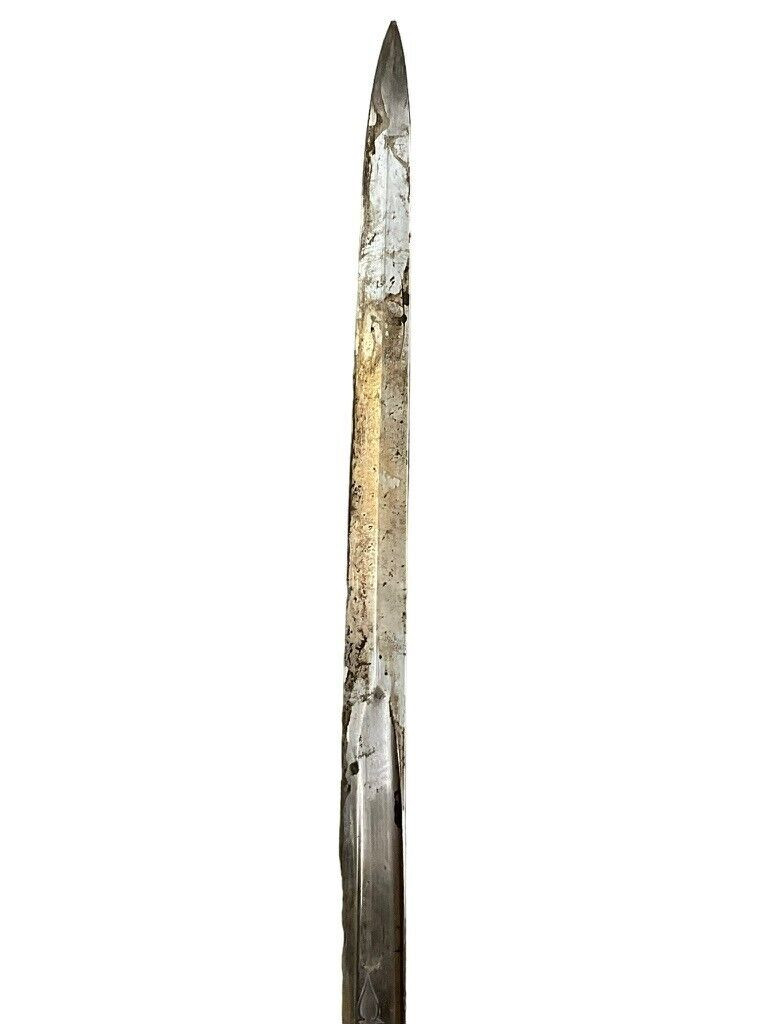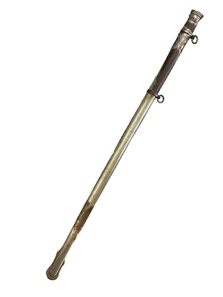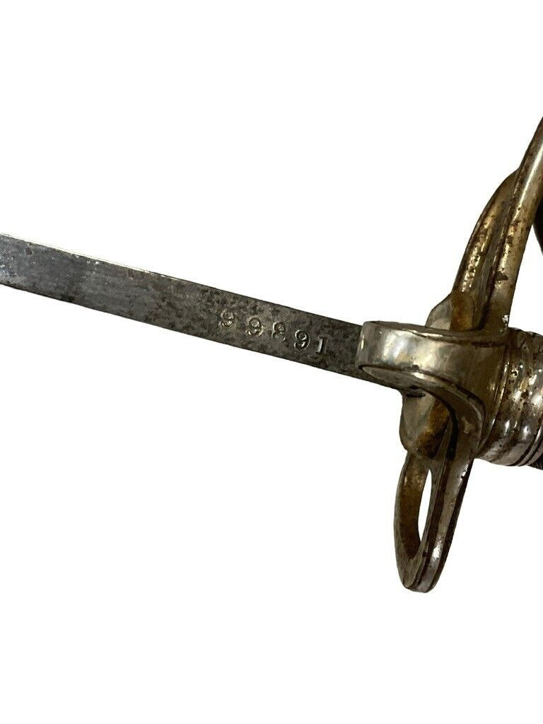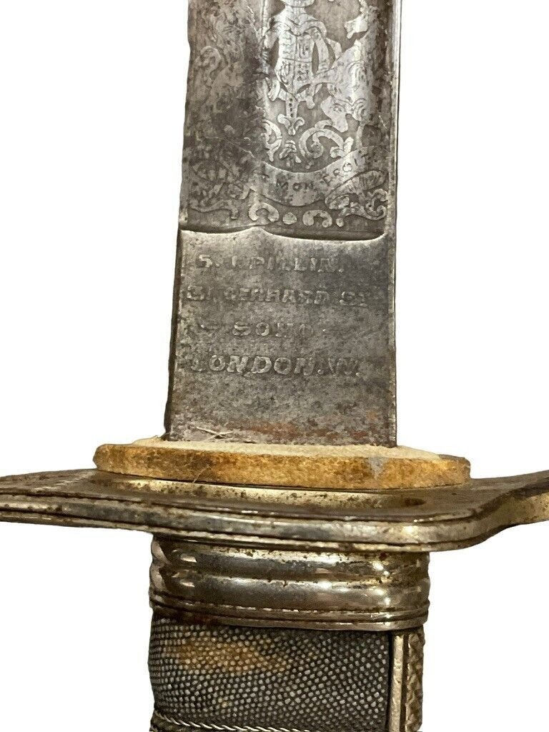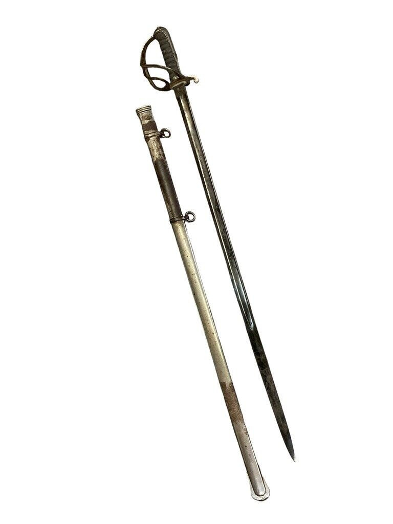 The British 1827 Pattern Artillery Officers Sword with Scabbard is a fine example of military craftsmanship from the early 19th century. This historical piece features a steel blade with intricate etchings, showcasing the attention to detail and artistry of the period. The hilt is adorned with an elegant brass guard and grip, designed for both functionality and sophistication. The sword is complemented by its original scabbard, crafted to provide protection and ease of carry for the officer. This model was specifically designed for artillery officers, reflecting their prestigious role within the British Armed Forces. With its rich history and exquisite design, the 1827 Pattern sword stands as a symbol of tradition and excellence in British military heritage. This sword not only served as a practical weapon but also as a status symbol, making it a valuable and cherished collectible for historians and enthusiasts alike.