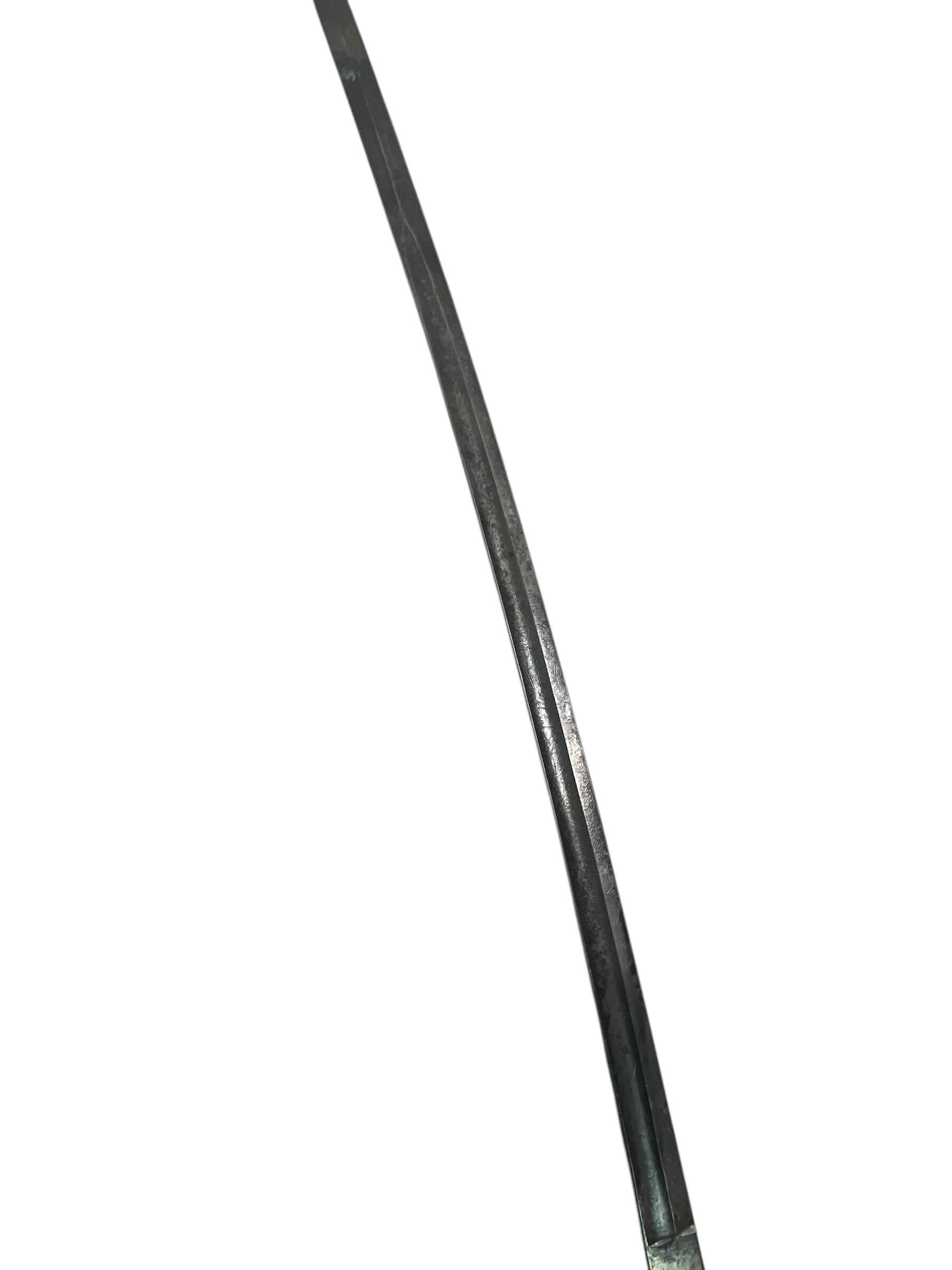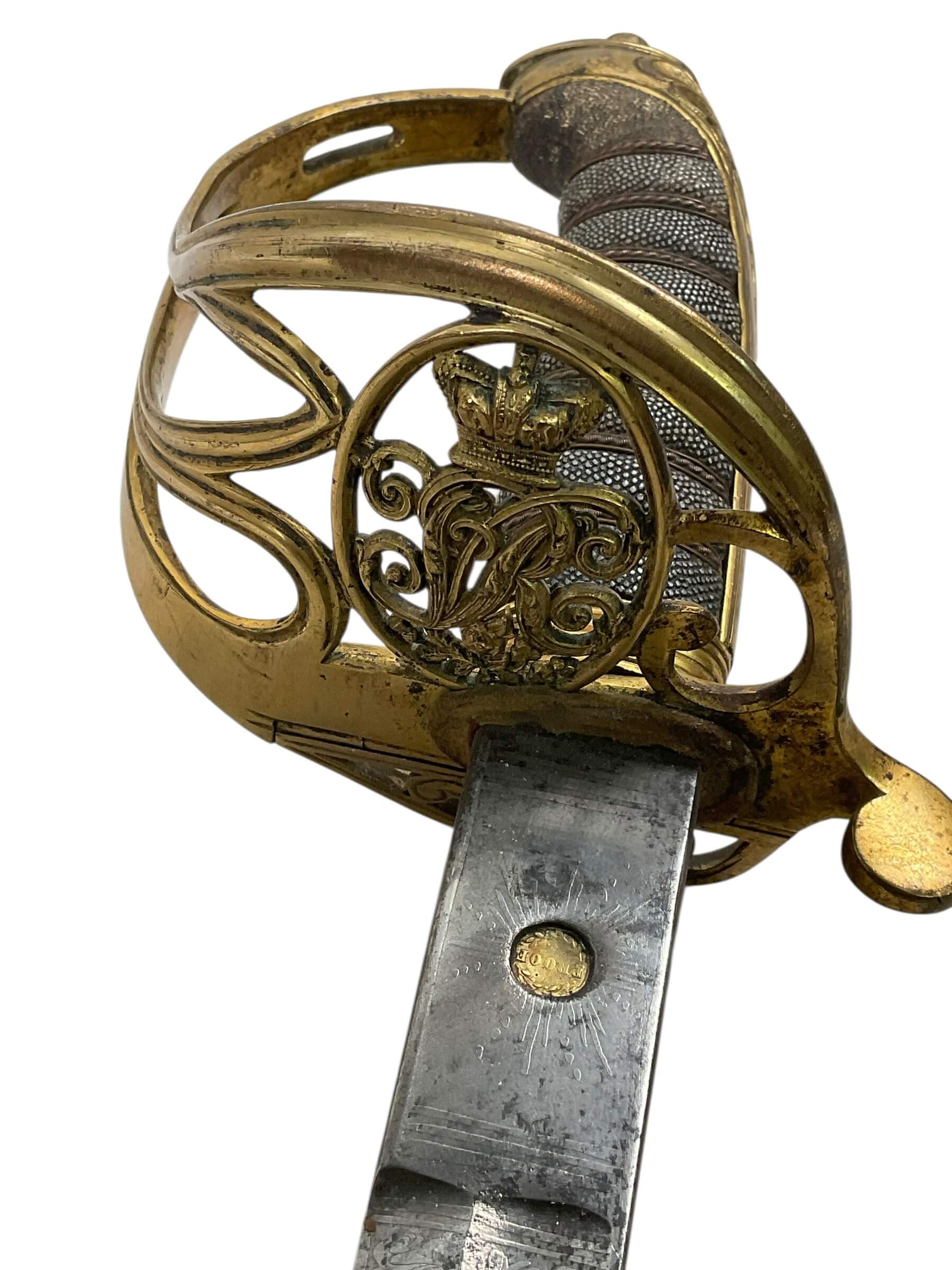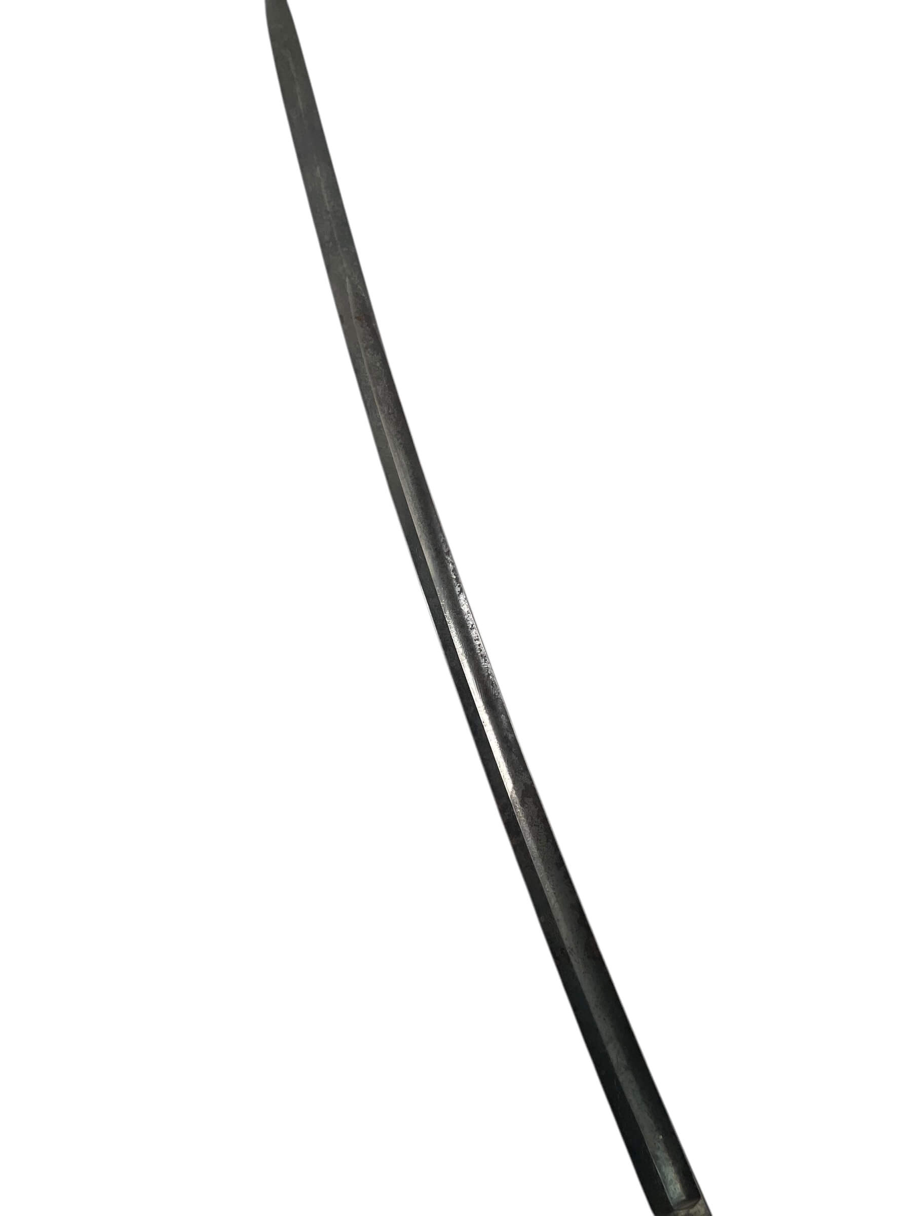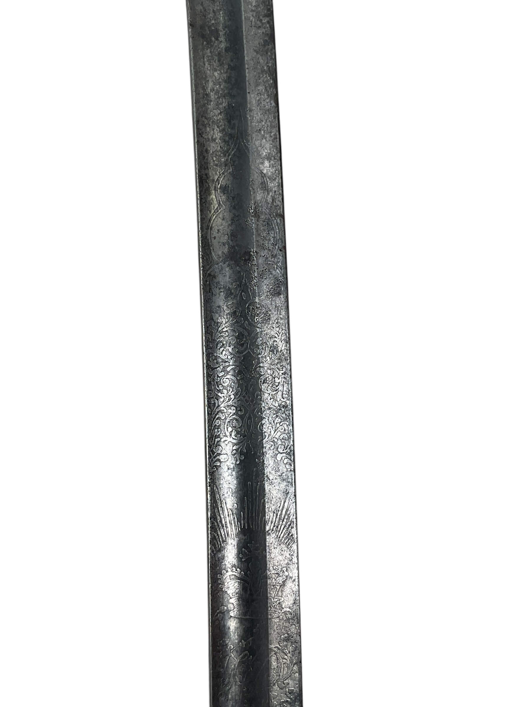 The British 1845 Pattern Infantry Officers Sword is a notable example of 19th-century British military edged weaponry. Introduced in 1845, this sword was designed for commissioned infantry officers and marked a transition from the earlier 1822 pattern. It features a single-edged, slightly curved blade approximately 32 inches in length, optimized for both cut and thrust use. The blade commonly carries a fuller along much of its length for added strength and reduced weight. Its hilt is composed of a distinct Gothic-style guard constructed from steel or brass, providing hand protection, with the grip typically wrapped in sharkskin and wire. This model was standard issue throughout the Victorian period and remained in service with modifications into the early 20th century. The specimen offered is *without scabbard*. Swords of this type are studied for their role in British military history and the evolution of officer sidearms within the British Army.