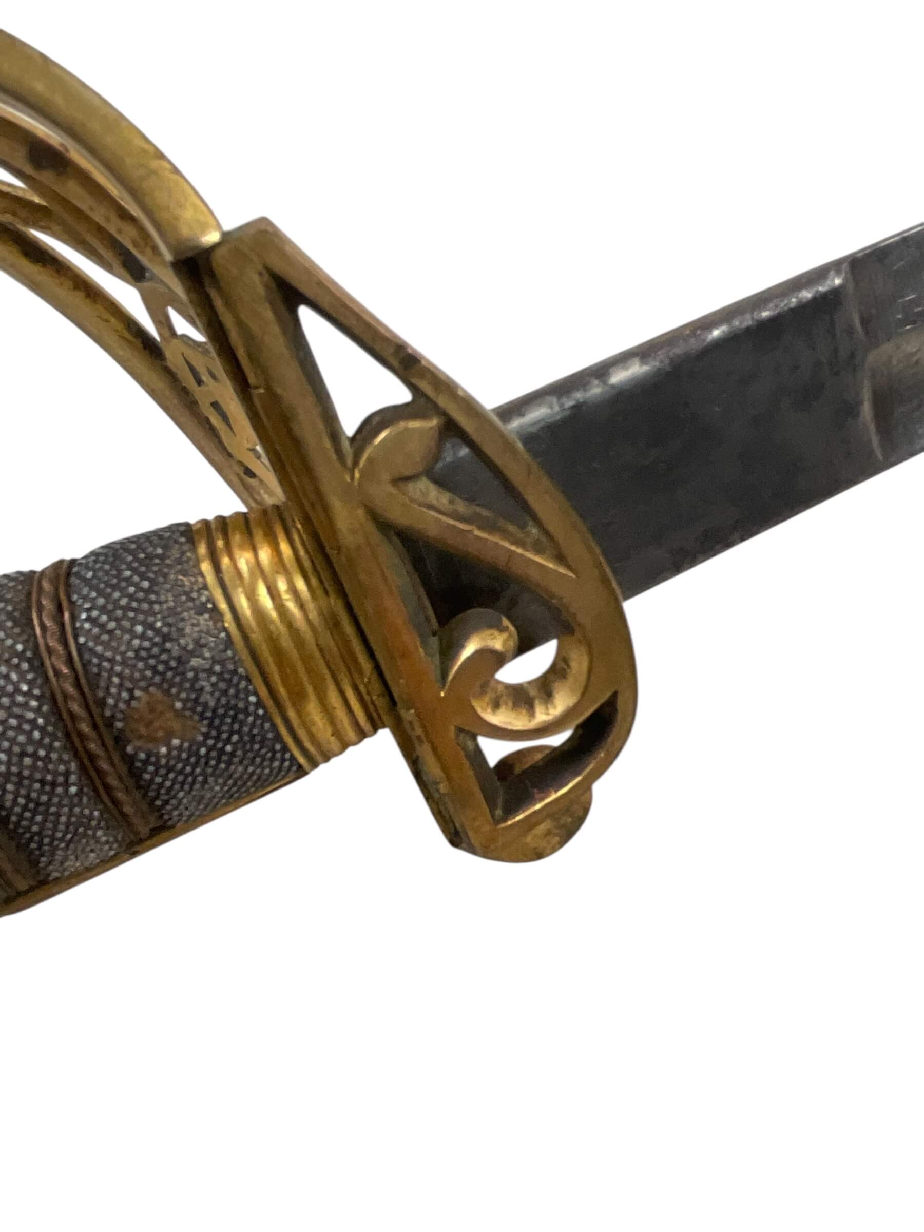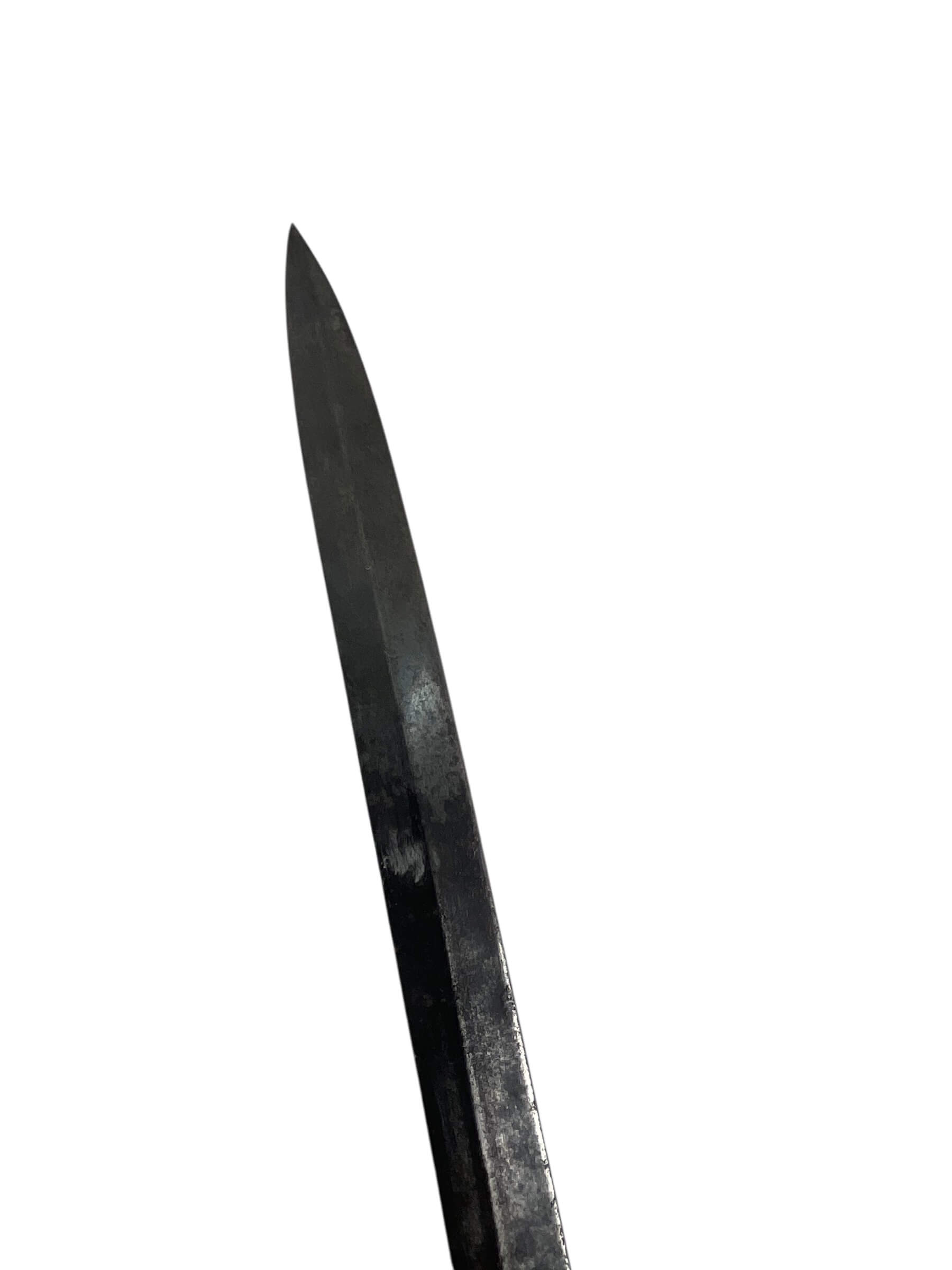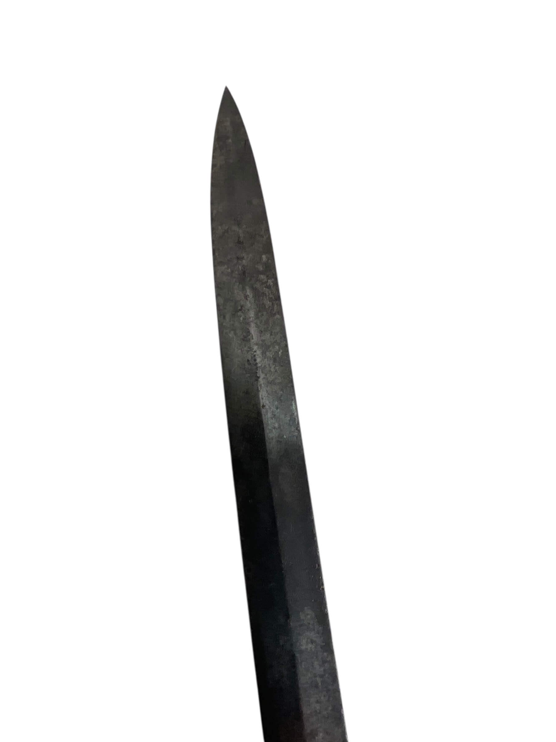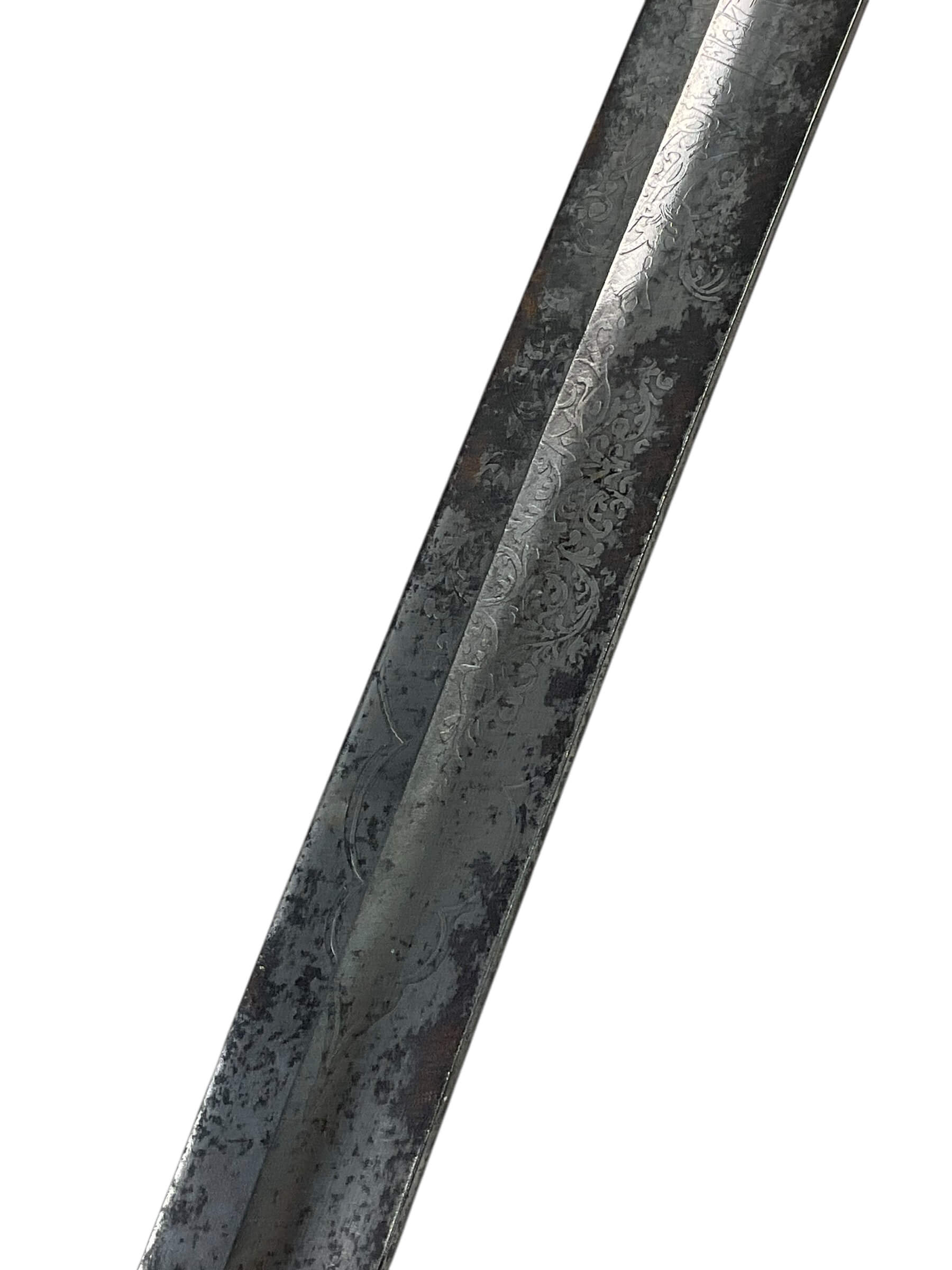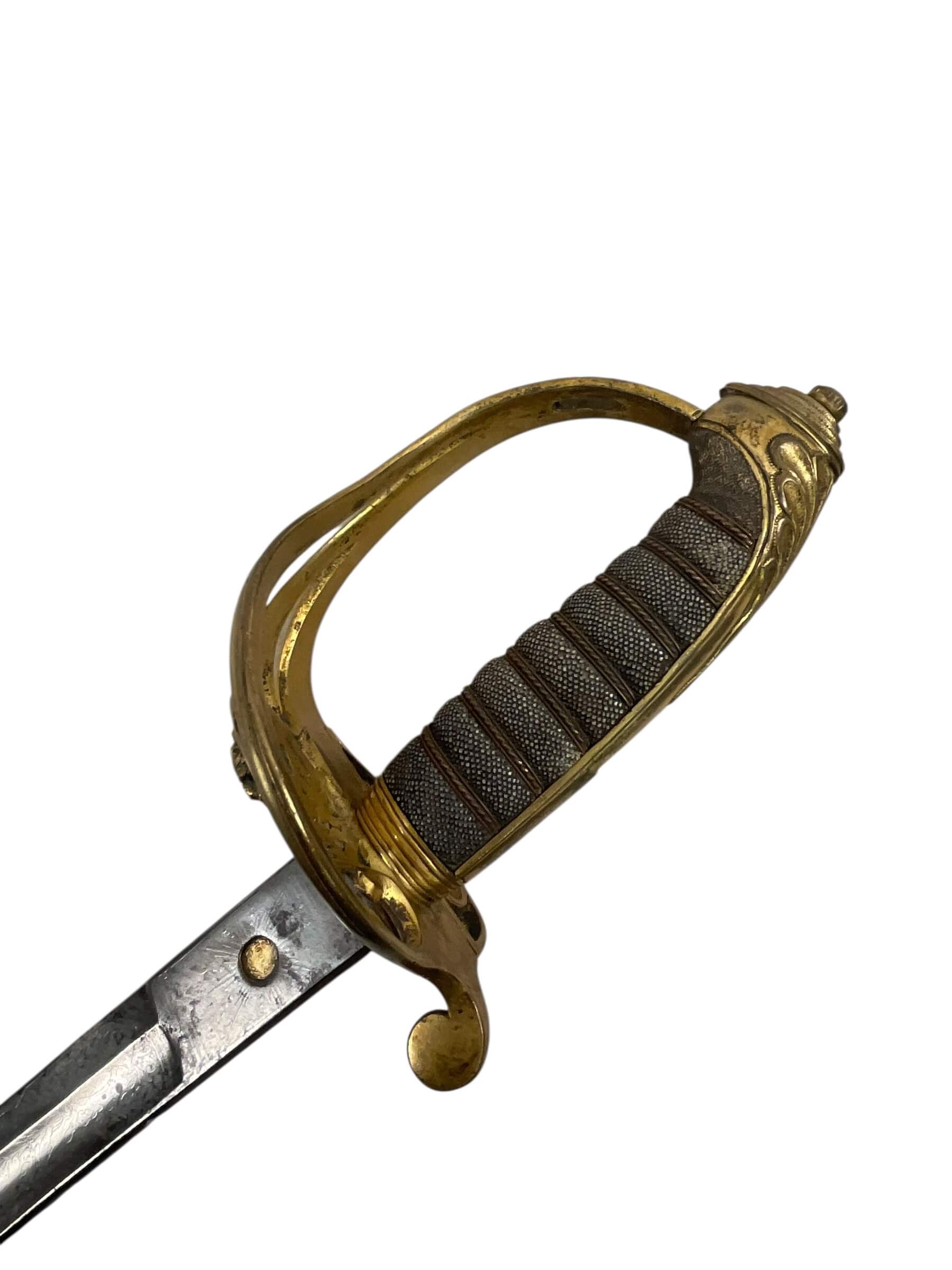 The British 1845 Pattern Infantry Officers Sword is a notable example of 19th-century British military edged weaponry. Introduced in 1845, this sword was designed for commissioned infantry officers and marked a transition from the earlier 1822 pattern. It features a single-edged, slightly curved blade approximately 32 inches in length, optimized for both cut and thrust use. The blade commonly carries a fuller along much of its length for added strength and reduced weight. Its hilt is composed of a distinct Gothic-style guard constructed from steel or brass, providing hand protection, with the grip typically wrapped in sharkskin and wire. This model was standard issue throughout the Victorian period and remained in service with modifications into the early 20th century. The specimen offered is *without scabbard*. Swords of this type are studied for their role in British military history and the evolution of officer sidearms within the British Army.