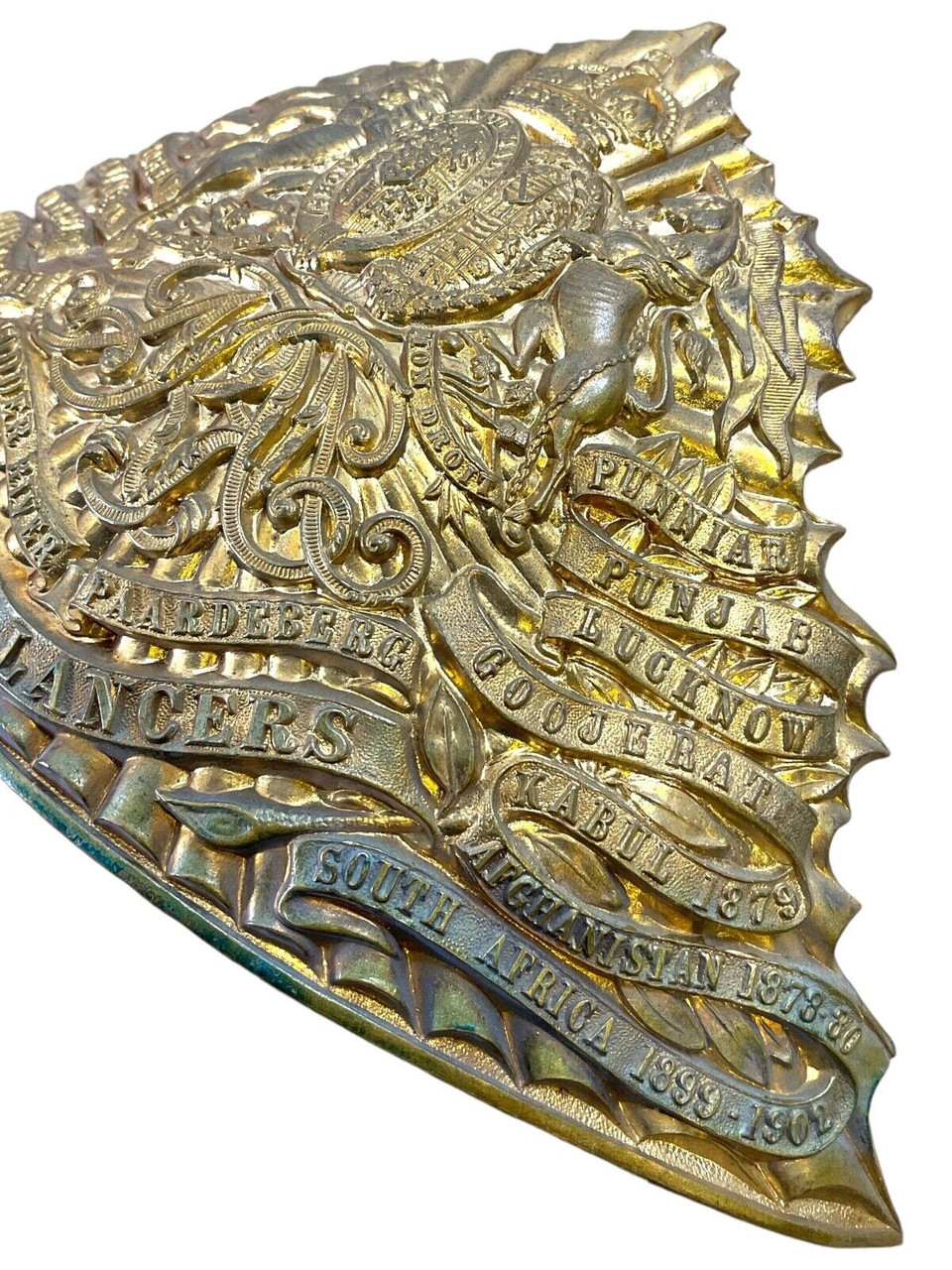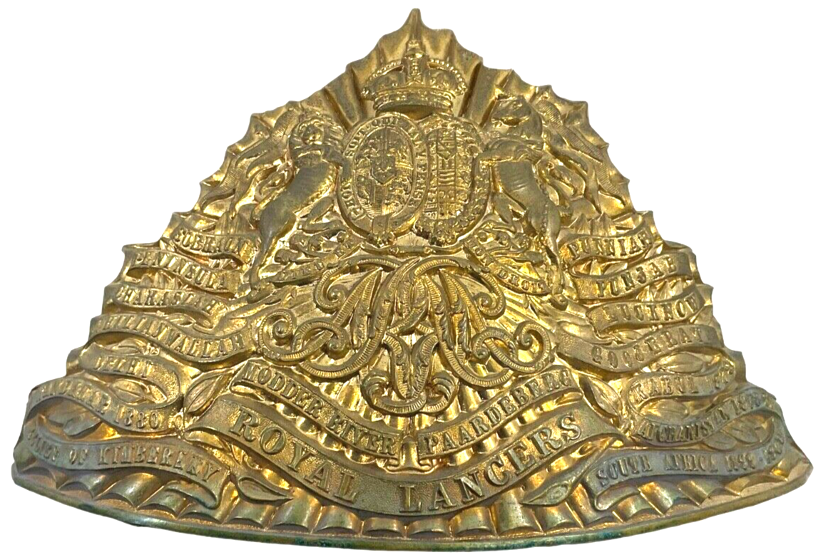 The British 5th Royal Lancers Other Ranks Helmet Plate is an exquisite piece of military regalia that showcases the rich heritage and distinguished service of this renowned cavalry regiment. This ornate brass plate, designed to adorn the helmet of an enlisted lancer, features intricate craftsmanship and emblematic symbols that reflect the storied history of the 5th Royal Lancers. At its center, a bold representation of the regimental insignia is surrounded by detailed scrollwork and laurel wreaths, signifying honor and valor in service. The helmet plate not only served as a distinguishing mark of rank and unit but also embodied the pride and tradition of the regiment. Collectors and historians value this piece for its historical significance and the window it offers into the life of a 19th-century British cavalryman. Whether displayed in a collection or studied for educational purposes, it remains a powerful representation of military history and heritage.