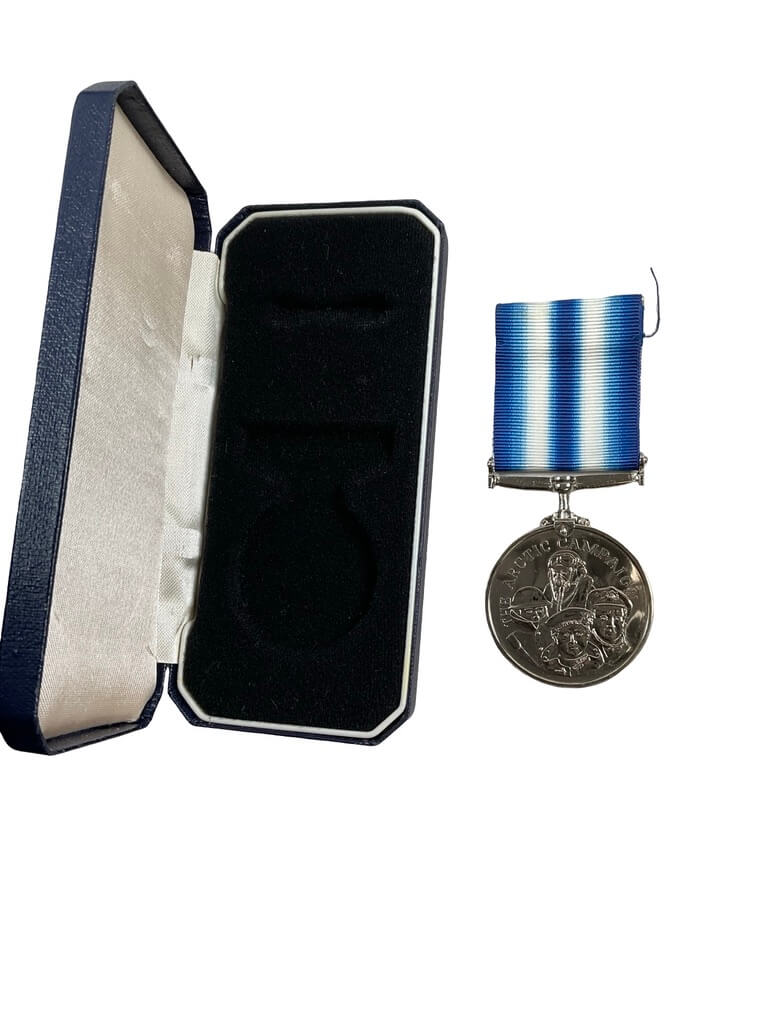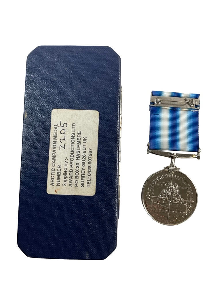 The British Arctic Campaign Medal Full Size in Case is a military decoration awarded to personnel who served in the Arctic convoys during the Second World War. This medal recognizes service rendered between 3 September 1939 and 8 May 1945 in the Arctic region, supporting supply routes to the Soviet Union. The circular silver medal features the crowned effigy of King George VI on the obverse and a representation of HMS Belfast issuing a signal on the reverse, encircled by the words “Arctic 1939-1945.” The accompanying ribbon is white with a central green stripe and narrow blue edges, symbolizing the harsh climate and sea lanes of the Arctic. This full-size issue is presented in an official case, suitable for display or historical reference. The medal serves as a tangible reminder of the challenging operations faced by Royal Navy and merchant seamen in the extreme conditions of the Arctic theatre.