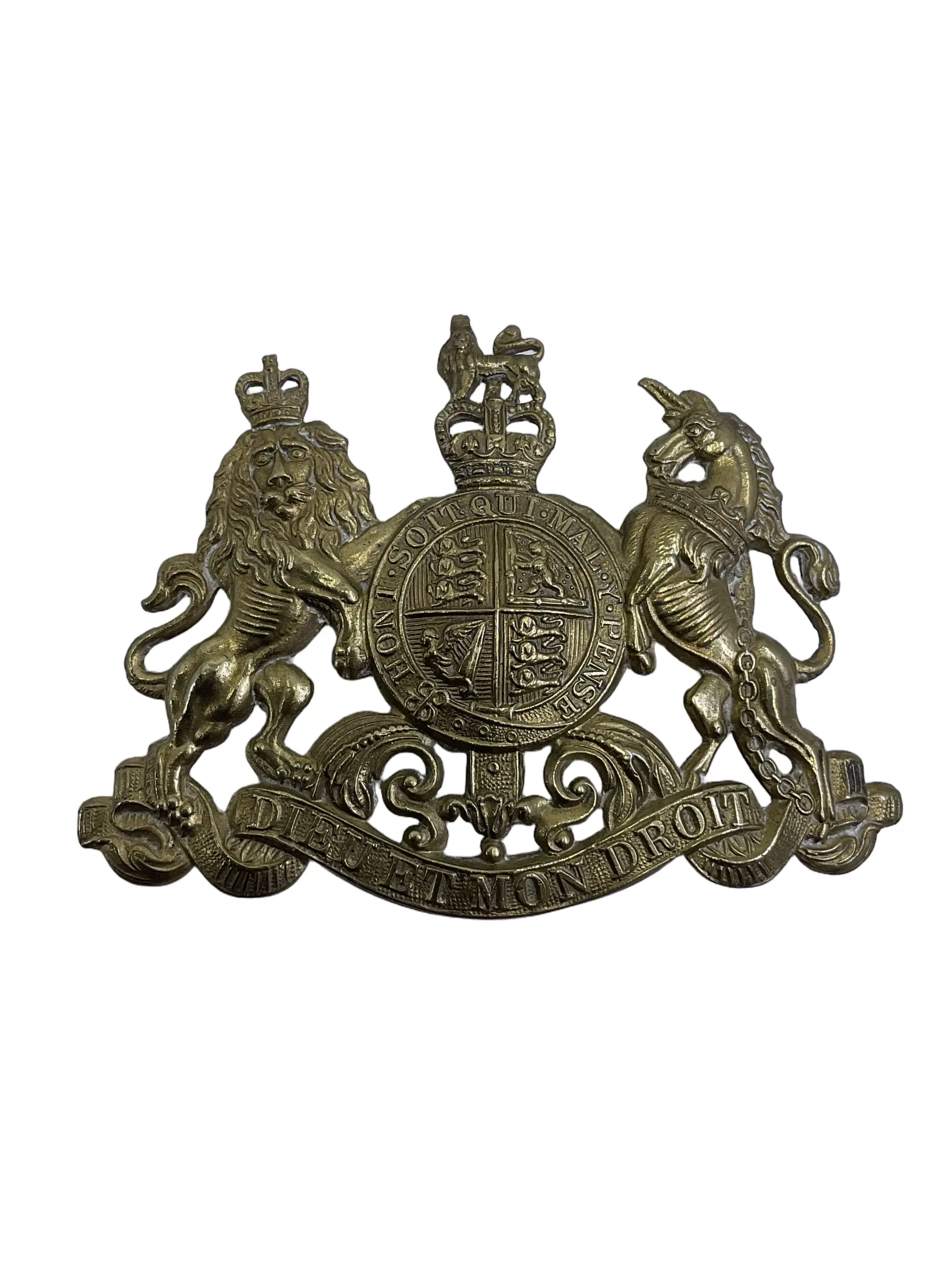 The British Army Cavalry Pouch Badge is a traditional insignia associated with cavalry regiments within the British Army. Typically constructed from metal, such as brass or white metal, this badge would have been affixed to the leather pouch belt worn by cavalry troopers as part of their parade or full dress uniform. The design often features regimental symbols, including crowns, scrolls, or specific emblems that denote the regiment’s heritage. These badges served both decorative and functional purposes, signifying the wearer’s regiment and role within the army. The pouch badge was an important element of the overall dress and was usually well-crafted to reflect regimental pride. Examples may bear evidence of historic wear, such as aged patina or minor surface marks. The British Army Cavalry Pouch Badge is of interest to collectors for its association with the traditions and history of British military cavalry units.