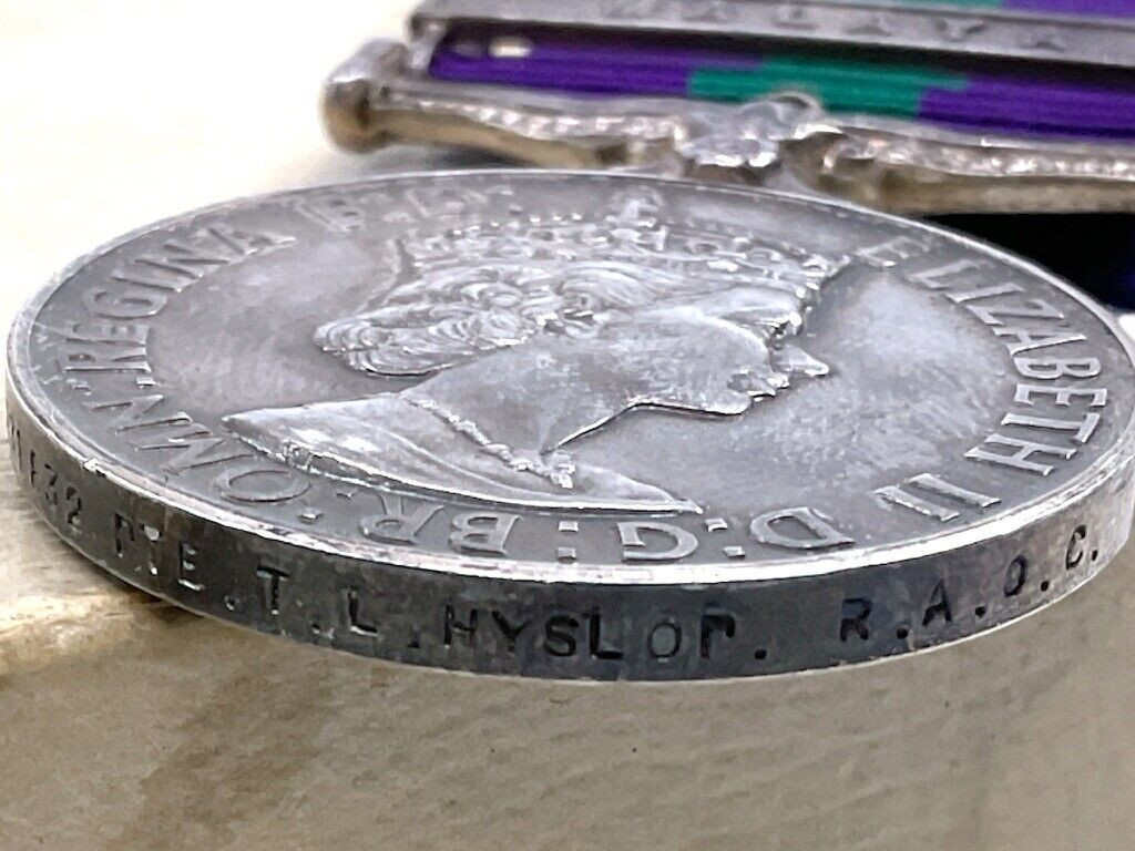 British Army General Service Medal GSM Malaya Bar 23231832 Pte TL Hyslop RAOC