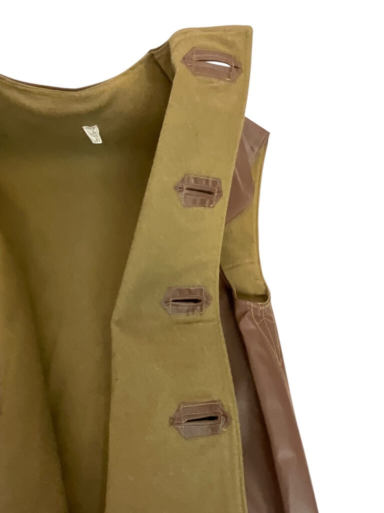 This product is a classic piece of military memorabilia, a British Army Leather Jerkin from 1961, in a Size 3. It’s made from sturdy, high-quality leather, designed to last and endure harsh conditions. The jerkin features four large buttons down the front and a simple, functional design that was typical of British military uniforms of the time. The back of the jerkin bears the date of manufacture, 1961, adding to its authenticity and historical value. The size 3 measurements would have fitted an average-sized man in the 1960s. This leather jerkin is not just a piece of clothing, but a piece of history, making it a perfect collector’s item for military enthusiasts or vintage clothing collectors. Its robust build and timeless design also make it a practical and stylish choice for everyday wear.