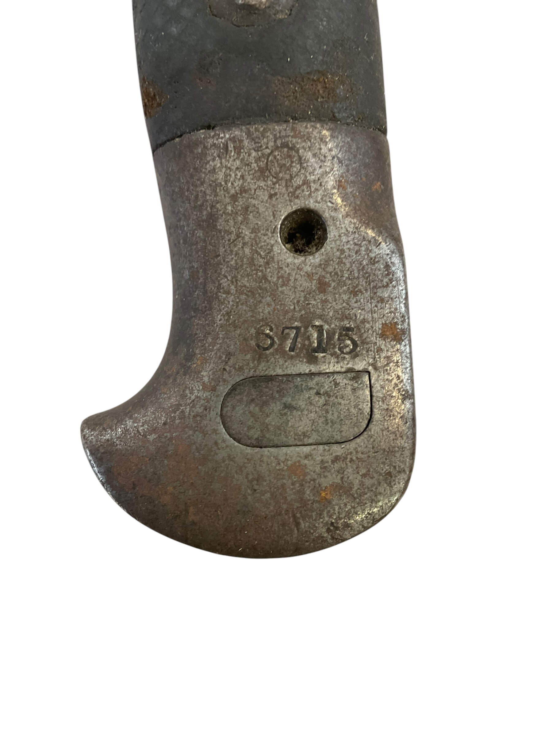 The ‘British Army Martini Henry P1887 MkII Sword Bayonet with Scabbard’ is a historical relic, reflecting a significant era of British military history. Designed for the Martini-Henry rifle, a single-shot lever-actuated weapon adopted by the British Army in 1871, this bayonet was introduced in 1887. The MkII designation indicates that this is the second model of its kind, featuring improvements over its predecessor. This bayonet is also a sword, signifying its dual functionality that was required in close combat situations. The accompanying scabbard allows for safe storage and transport of the bayonet, preserving its condition and enhancing its practicality. The craftsmanship involved in its creation is reflective of British precision and attention to detail. This item is not just a weapon, but a piece of history, making it a highly sought-after collectible for enthusiasts of military memorabilia.