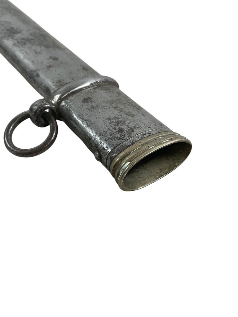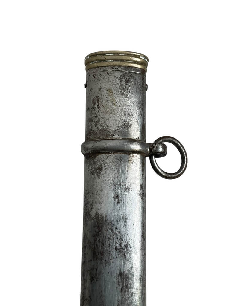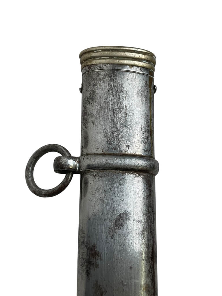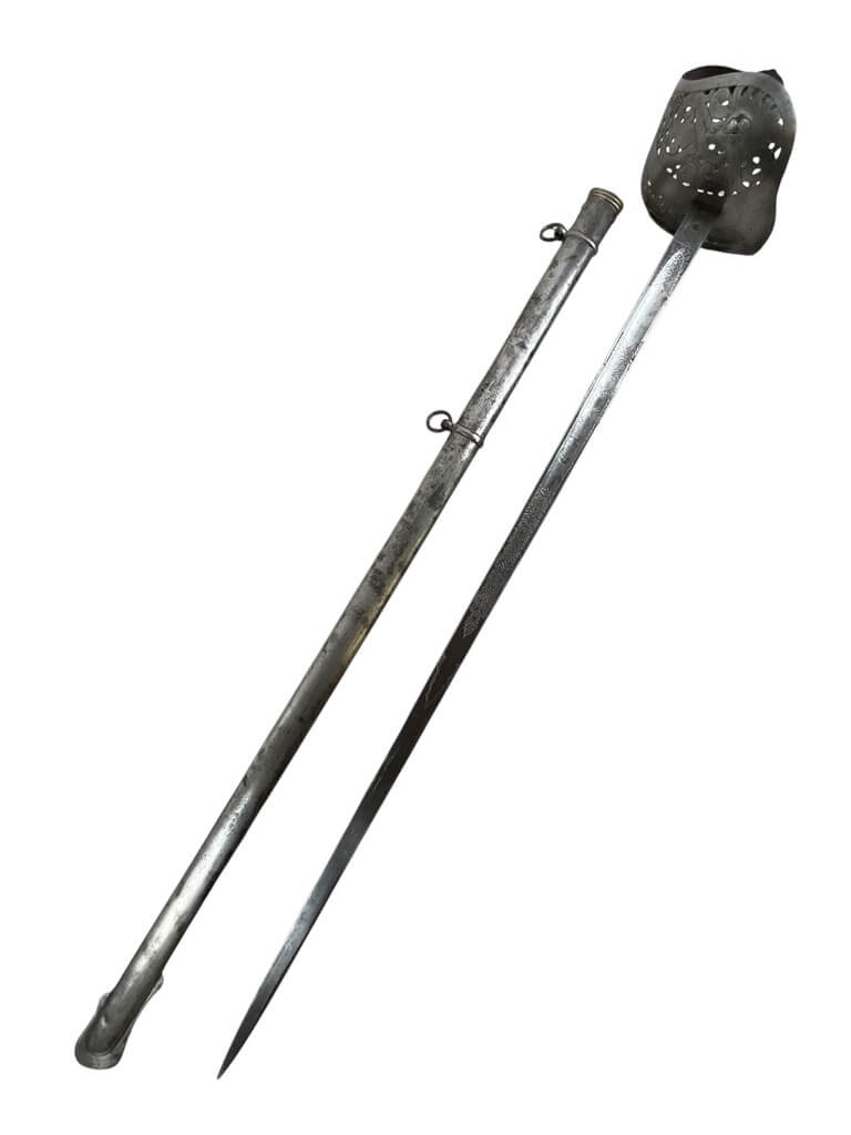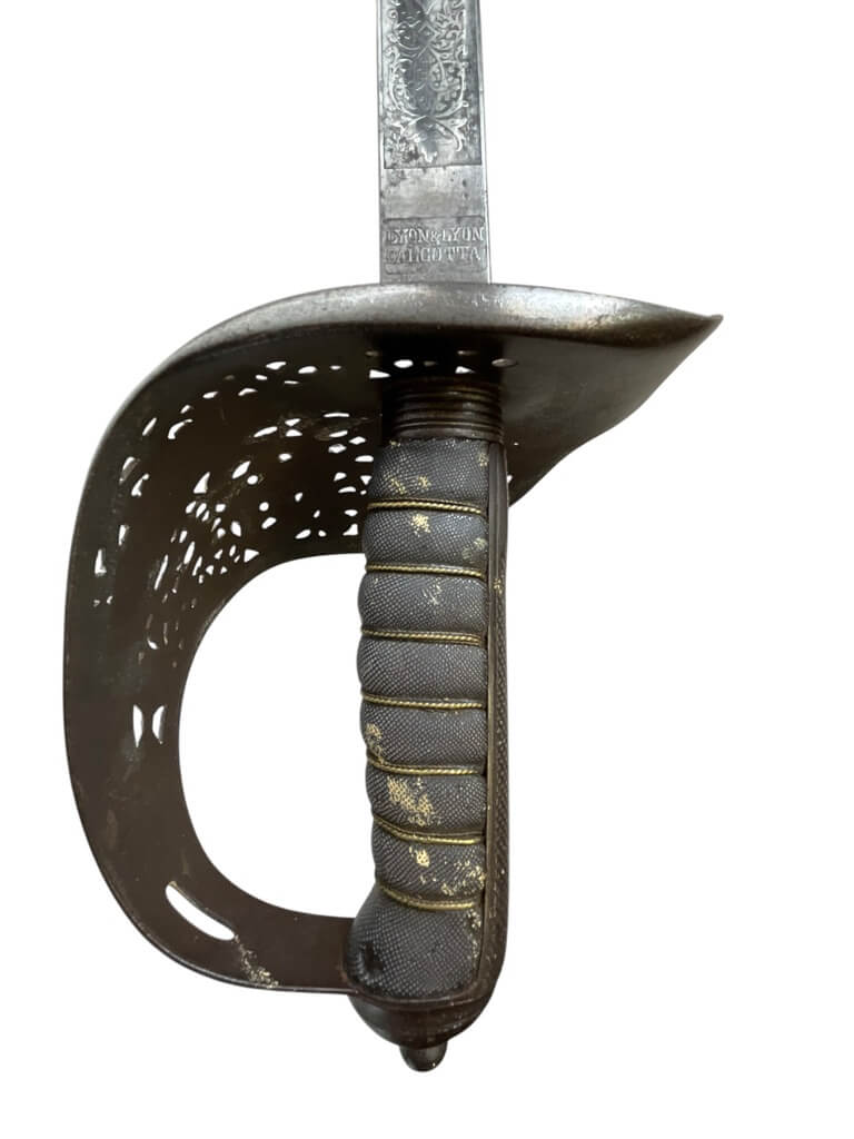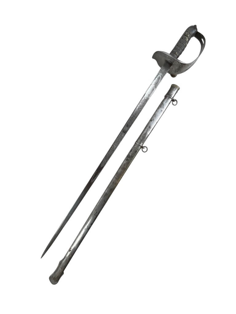 This ‘British Army Officers 1897 Pattern Sword with Scabbard Made in India’ is a remarkable artifact, carrying a rich history within its craftsmanship. The sword, designed according to the specifications of the 1897 pattern, was the standard issue for British Army officers, signifying their rank and authority. The blade is robust yet elegant, reflecting the fine balance between strength and finesse required in an officer. The accompanying scabbard, too, is a work of art, crafted meticulously to house the sword securely. Made in India, this piece is a testament to the cross-cultural influences during the British colonial period. The quality of craftsmanship indicates the high standards maintained in the production of military equipment during this era. This piece is a must-have for collectors with an interest in military history, specifically that of the British Empire. It’s not just a weapon, but a symbol of a bygone era and the rich tapestry of global history.