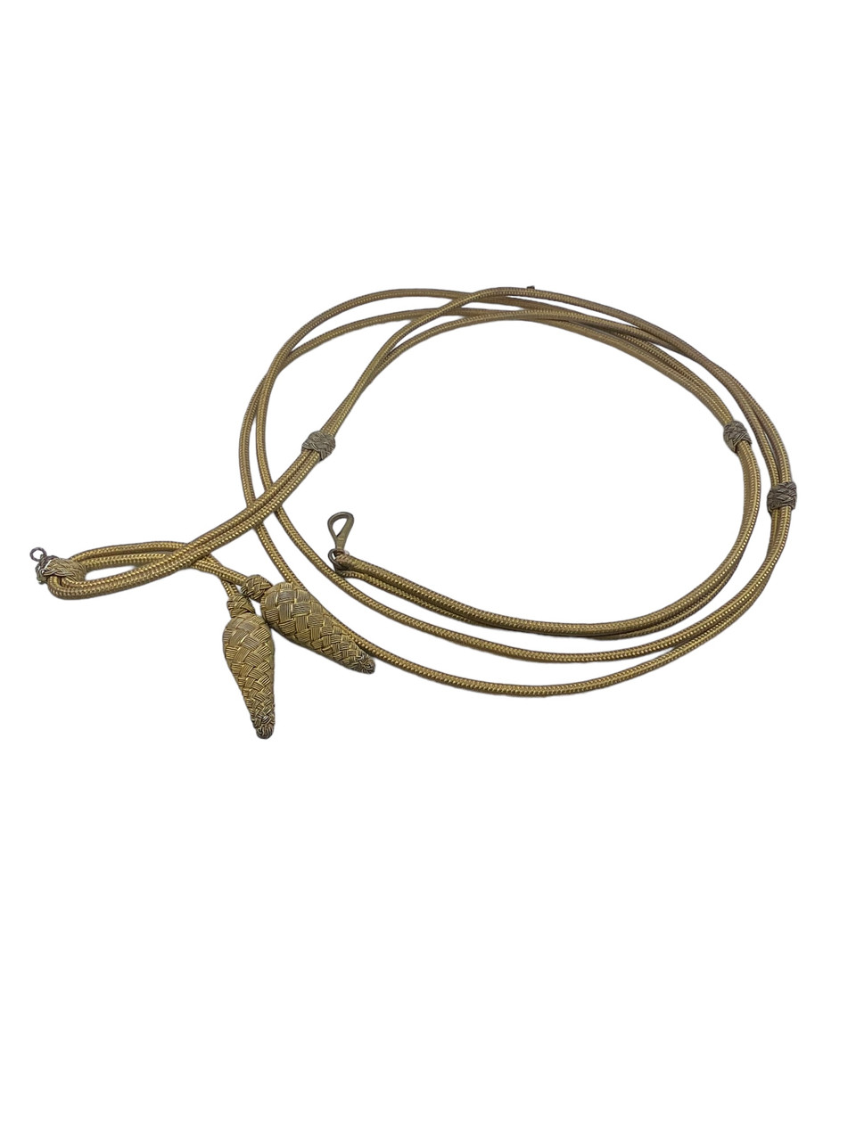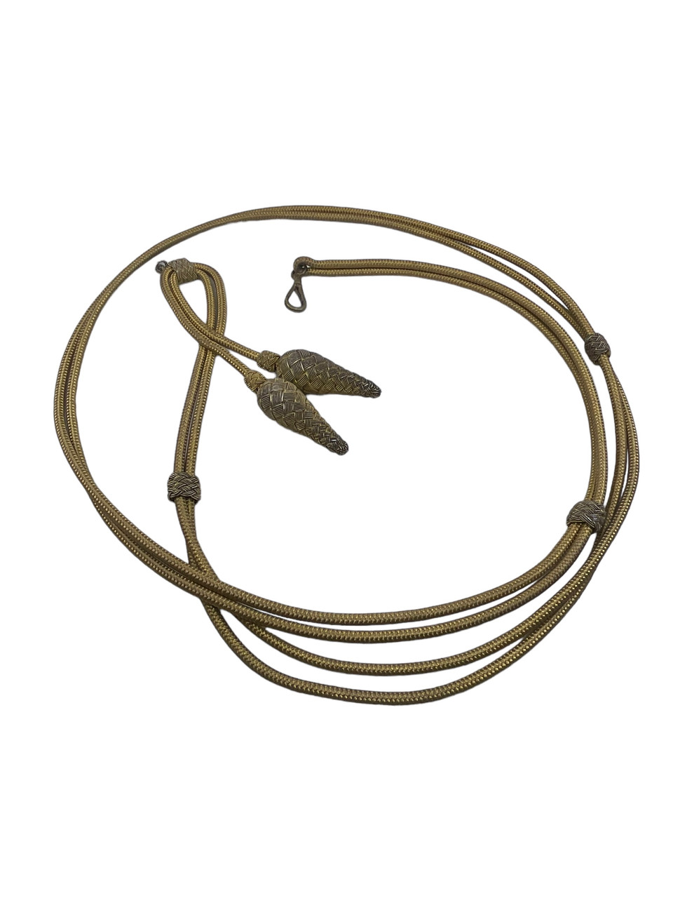The “British Army Officers Cavalry Hussars Bullion Wire Cap Cords” are distinguished uniform accessories, designed specifically for officers in the British Army’s cavalry regiments. Crafted with precision, these cap cords are made from high-quality bullion wire, ensuring durability and a polished appearance. The intricate design reflects the rich heritage and tradition of the Hussars, a renowned cavalry unit known for their bravery and skill. These cap cords not only serve a functional purpose but also add an element of prestige to the officer’s attire, signifying rank and regimental pride. The lustrous finish of the bullion wire adds a touch of elegance, making it a standout feature in ceremonial dress. Ideal for collectors and historians, these cap cords are a testament to the timeless craftsmanship and military history of the British Army.