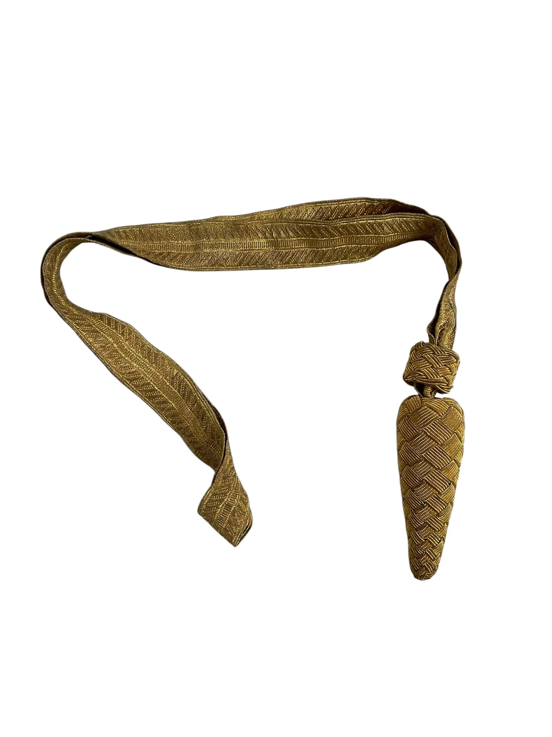 This exquisite piece, titled ‘British Army Officers Gold Sword Knot Vintage’, is a testament to the rich military heritage of the United Kingdom. It is an original artifact from a bygone era, showcasing the fine craftsmanship and attention to detail that was typical of military regalia. The gold sword knot features intricate braiding, a hallmark of traditional British artistry. The design reflects the high standards of the British Army officers who once wore them, representing their rank and prestige. Its vintage allure is further amplified by the patina developed over the years, adding a unique charm to this artifact. This piece is a perfect addition to any collection that values historical significance and British heritage. It is not just a symbol of military power and authority, but also an encapsulation of a period in British history that was marked by honour and valour.