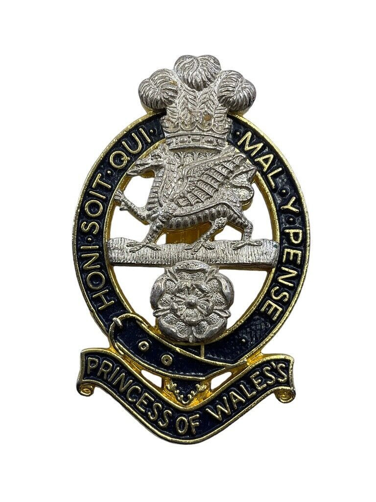 The British Army Princess of Wales’s Royal Regiment Cap Badge is a distinctive and emblematic piece of military insignia. Representing one of the UK’s most prestigious and storied infantry regiments, this cap badge bears significant historical and symbolic importance. The design typically features a detailed and heraldic lion, crowned, and often accompanied by various elements such as roses, signifying its roots and connections to the British monarchy and historical regiments. Crafted with meticulous attention to detail, it is commonly worn by members of the Princess of Wales’s Royal Regiment as a part of their ceremonial and daily military attire. This badge not only signifies the soldier’s unit and allegiance but also serves as a source of pride, embodying the regiment’s rich traditions, valor, and its motto, “Honi soit qui mal y pense” (Shame on him who thinks evil of it). Collectors and military enthusiasts often treasure these badges for their aesthetic and historical value.