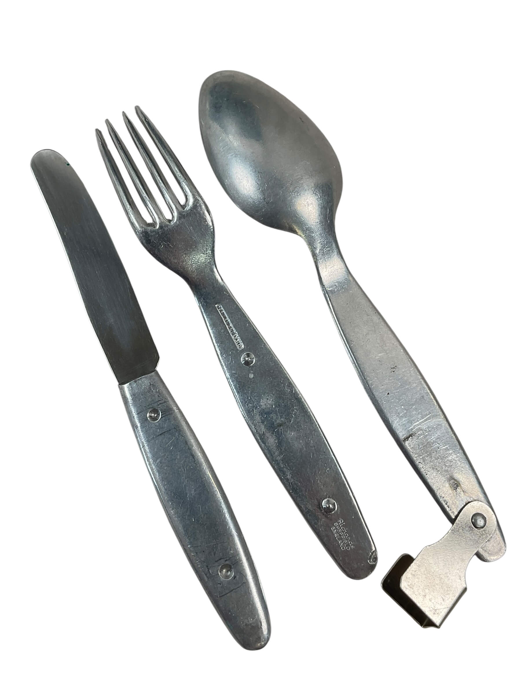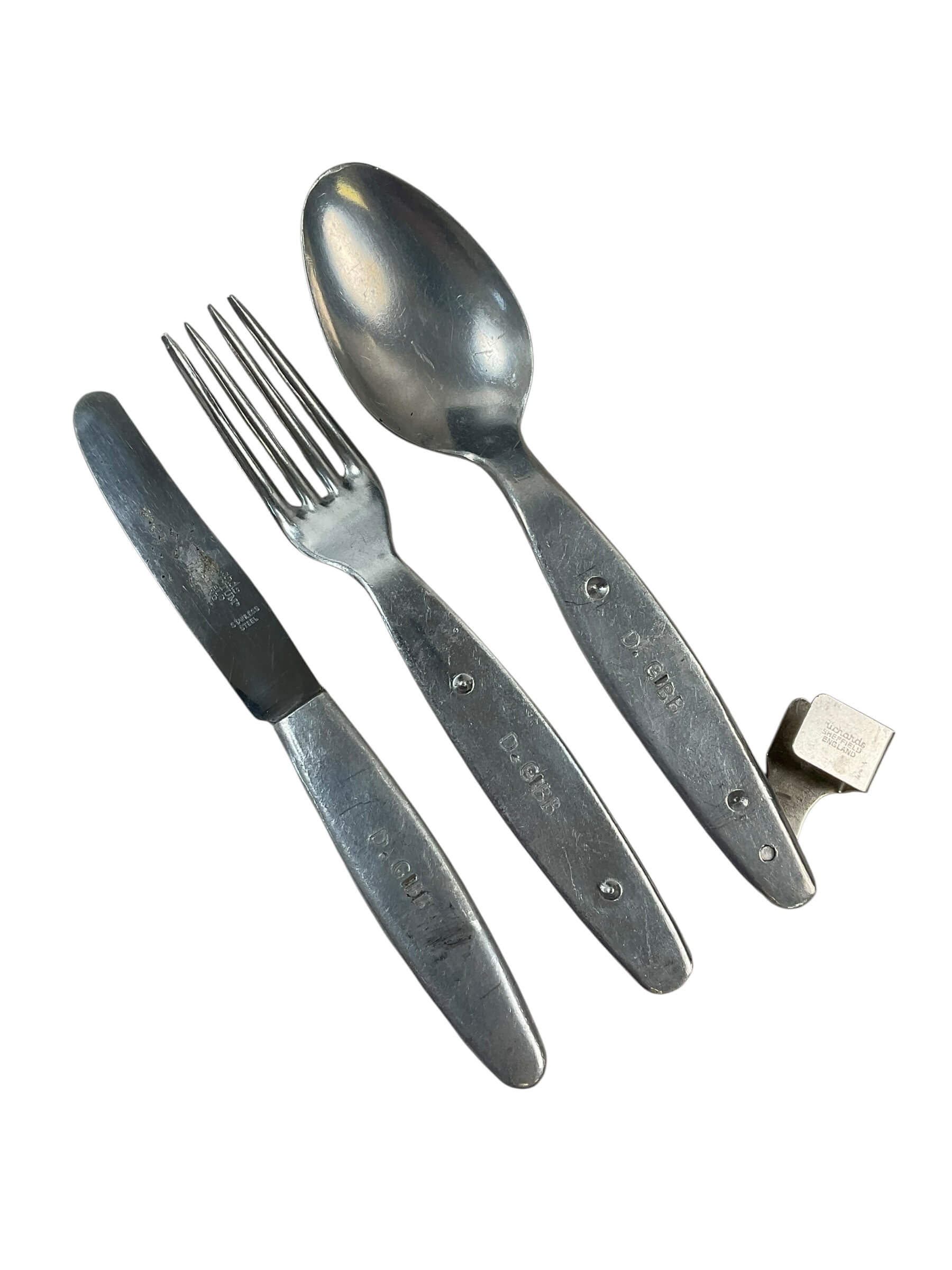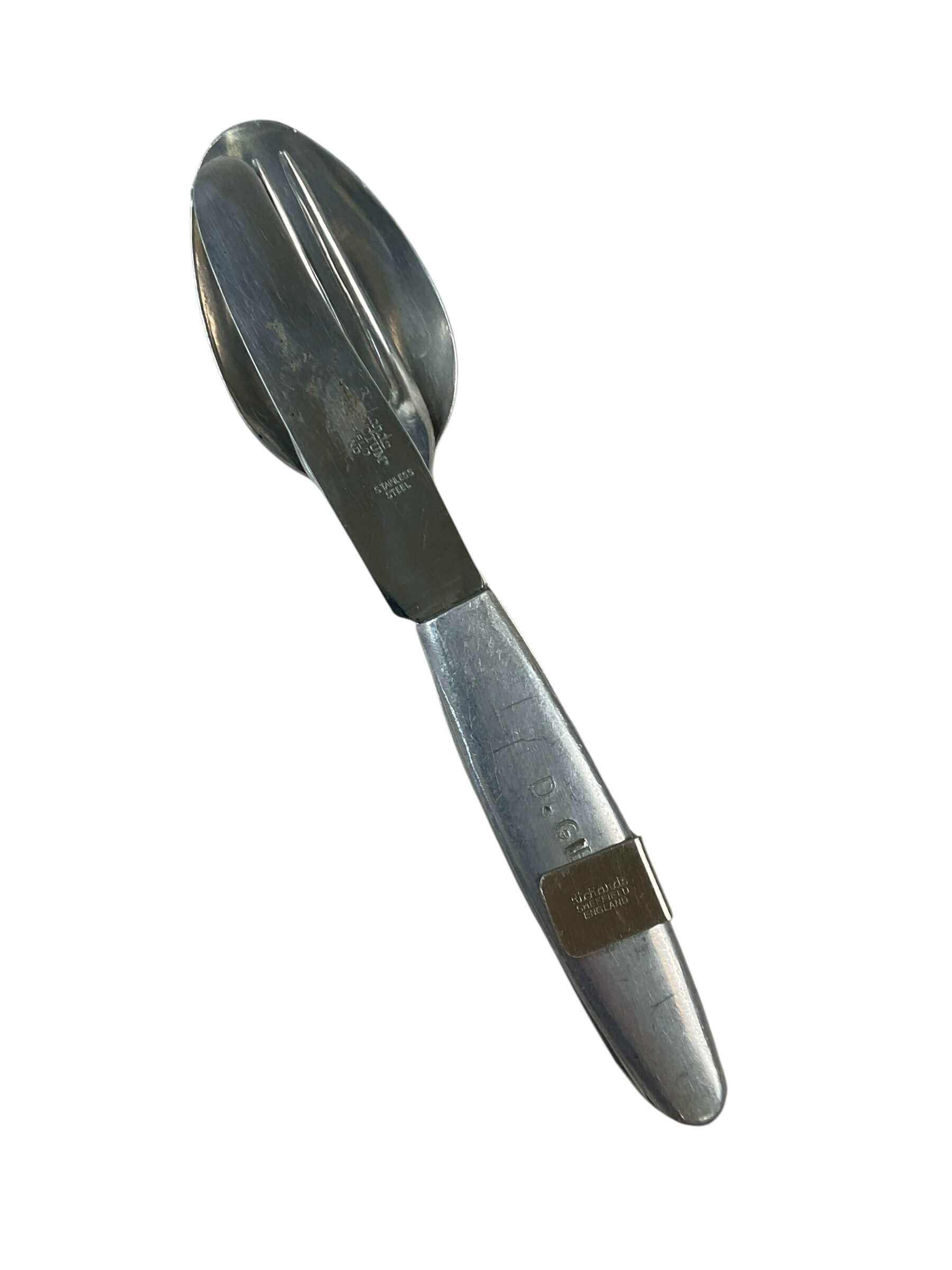 This British Army Private Purchase Officer’s KFS (Knife, Fork, Spoon) set is a period example of personal field cutlery used by commissioned officers during military service. Unlike standard-issue equipment, private purchase KFS sets often exhibit higher quality materials and construction, providing durability and added comfort suitable for officers. The set includes a knife, fork, and spoon, each crafted in metal and typically designed to interlock or nest for compact storage. This particular example is named, indicating prior ownership and enhancing its historical provenance. Officer’s KFS sets were commonly utilized during campaigns and field postings, offering a practical solution for eating rations in diverse environments. Items such as these reflect the personal preferences of officers who opted for equipment beyond standard government issue, often sourcing them from military outfitters or local suppliers. This set provides insight into the daily routines and material culture of British Army officers in the field.