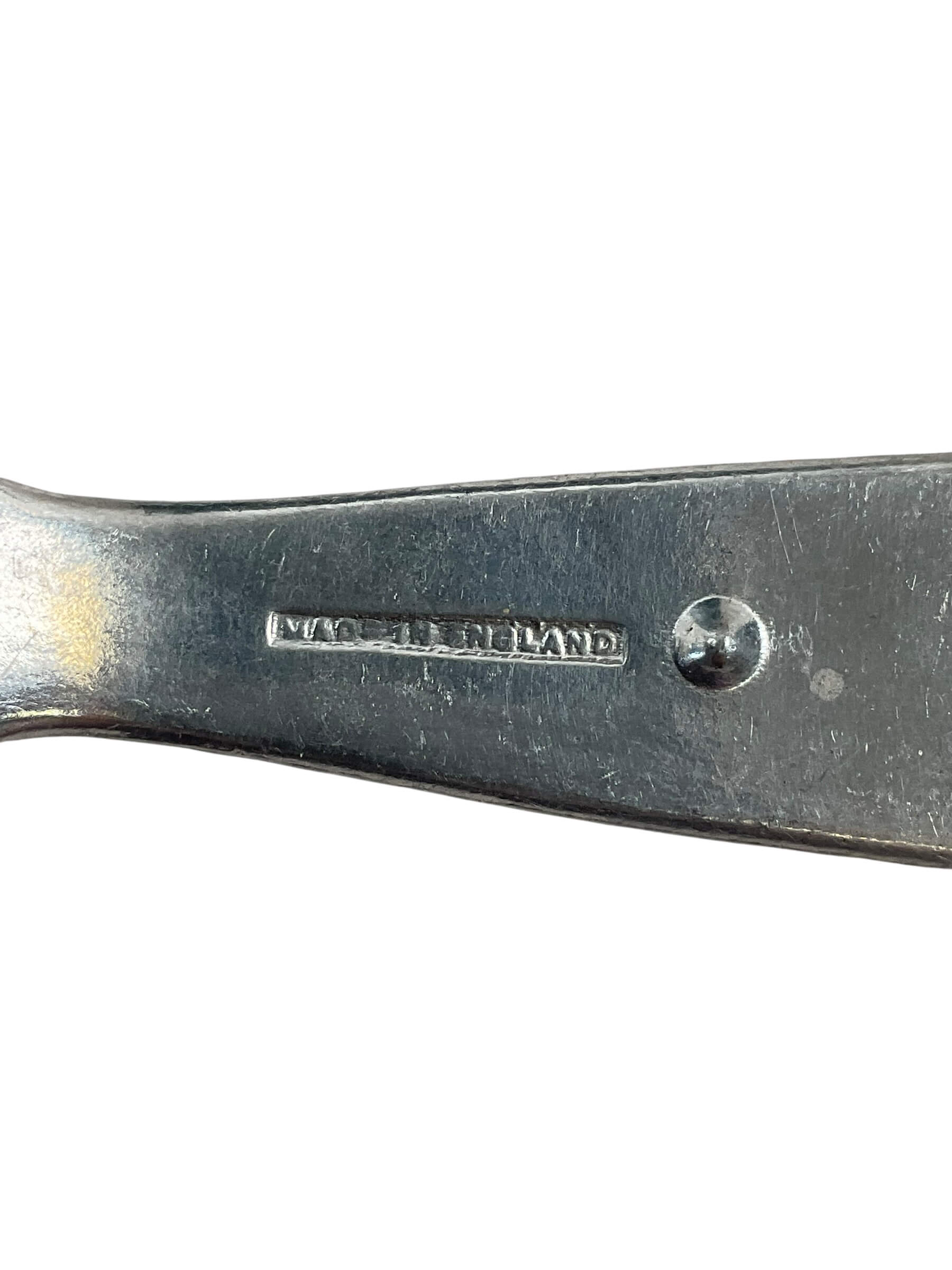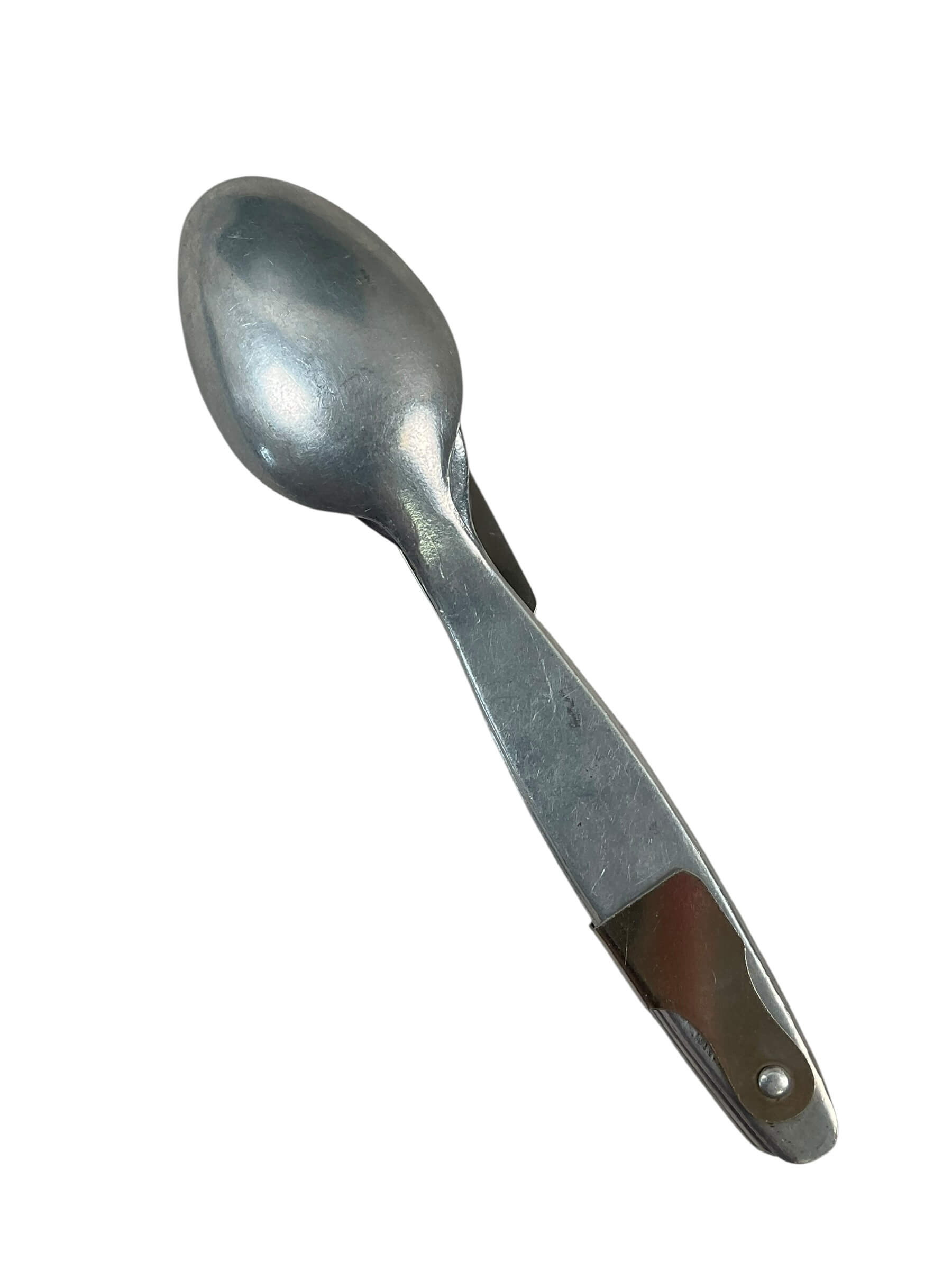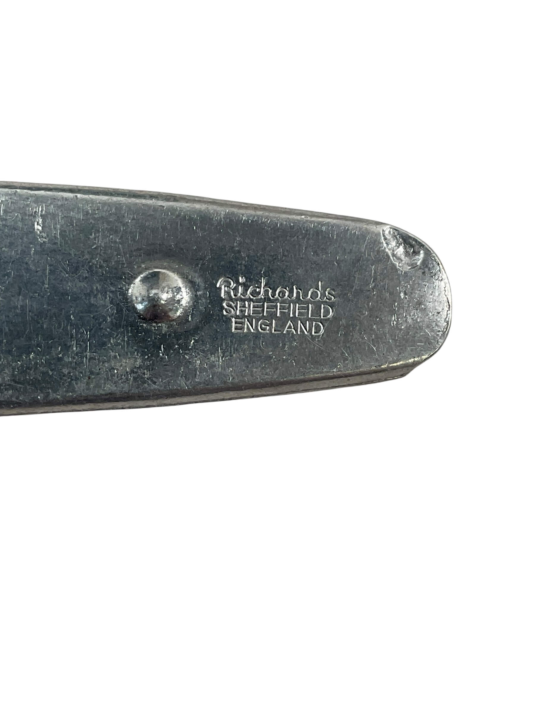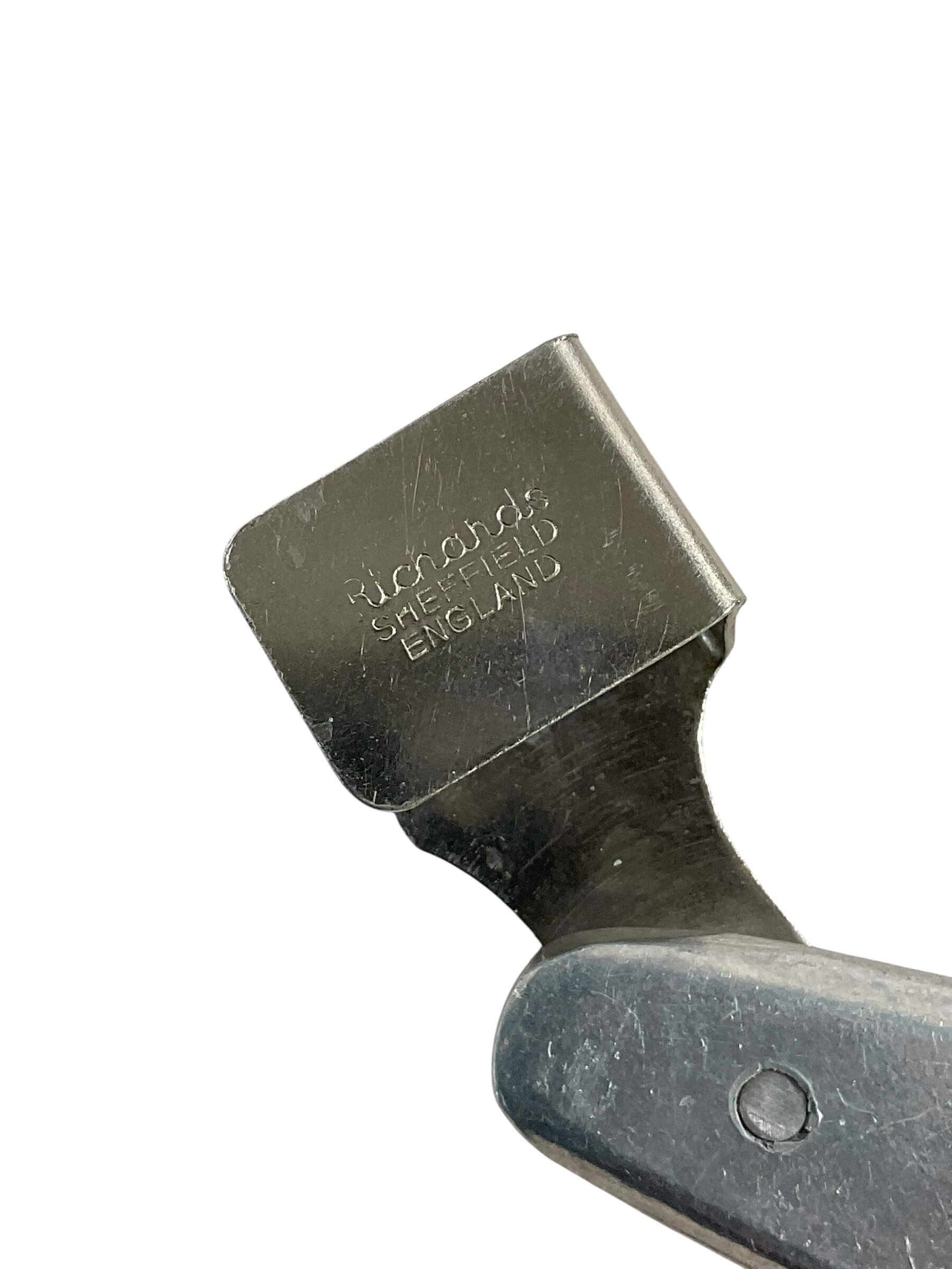 This British Army Private Purchase Officer’s KFS (Knife, Fork, Spoon) set is a period example of personal field cutlery used by commissioned officers during military service. Unlike standard-issue equipment, private purchase KFS sets often exhibit higher quality materials and construction, providing durability and added comfort suitable for officers. The set includes a knife, fork, and spoon, each crafted in metal and typically designed to interlock or nest for compact storage. This particular example is named, indicating prior ownership and enhancing its historical provenance. Officer’s KFS sets were commonly utilized during campaigns and field postings, offering a practical solution for eating rations in diverse environments. Items such as these reflect the personal preferences of officers who opted for equipment beyond standard government issue, often sourcing them from military outfitters or local suppliers. This set provides insight into the daily routines and material culture of British Army officers in the field.