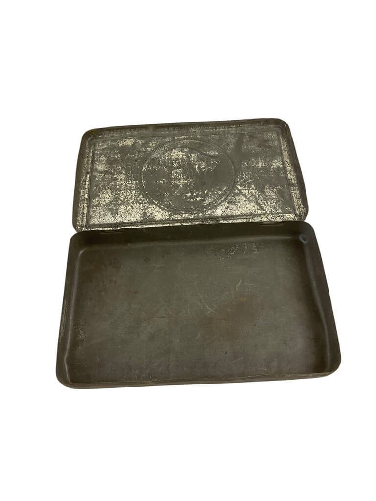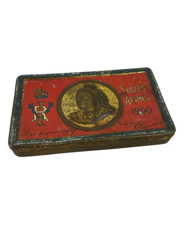 This item is an antique British Boer War Queen Mary Tin, now empty, that originally contained chocolates. It was given as a gift from Queen Mary to soldiers during the Boer War in the early 20th century. The tin features a portrait of Queen Mary, showcasing the intricate artistry of the period. Though it is now empty, it once offered a small token of comfort and a taste of home to brave soldiers fighting far from their homeland. This tin is not only a historical artifact, but also a symbol of Queen Mary’s compassion and the bravery of the soldiers. It is a remarkable piece of British military history that would make a valuable addition to any collection. Despite its age, the tin remains in good condition, retaining the charm and character of its era.