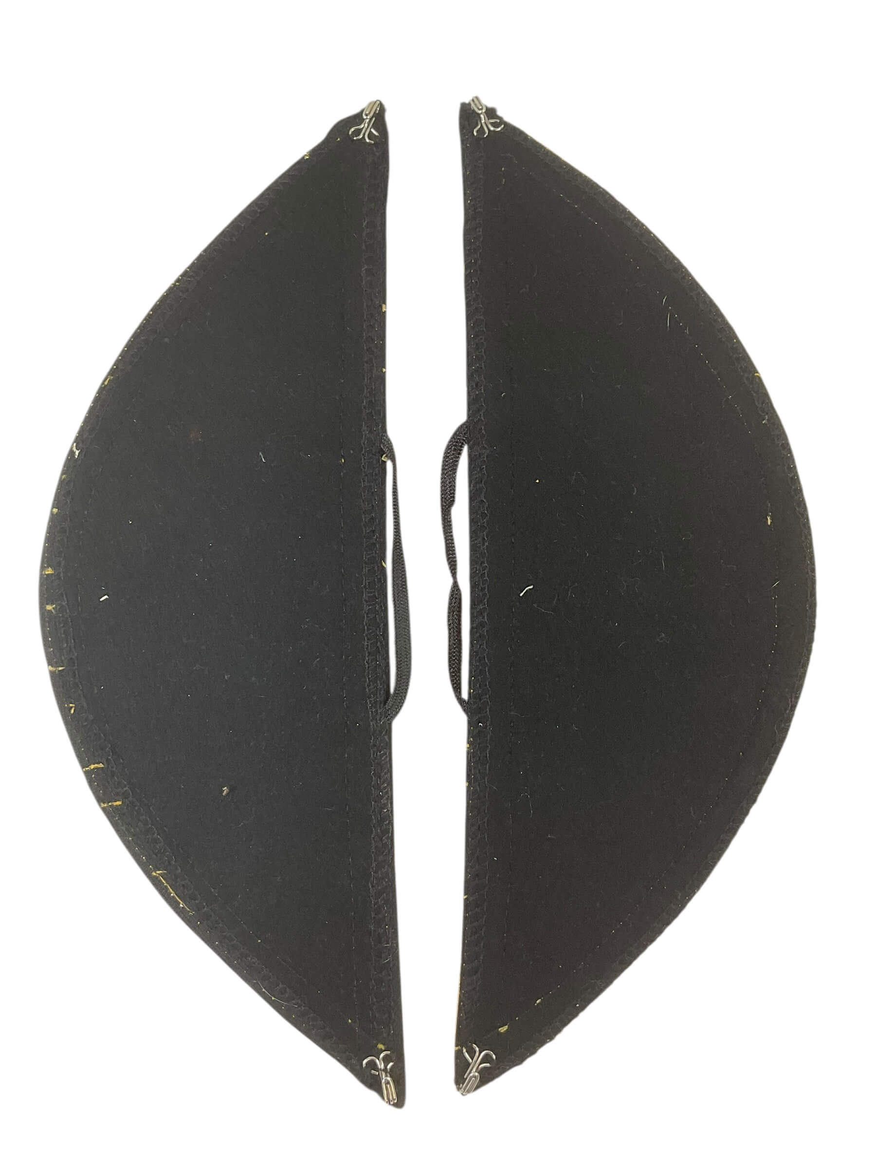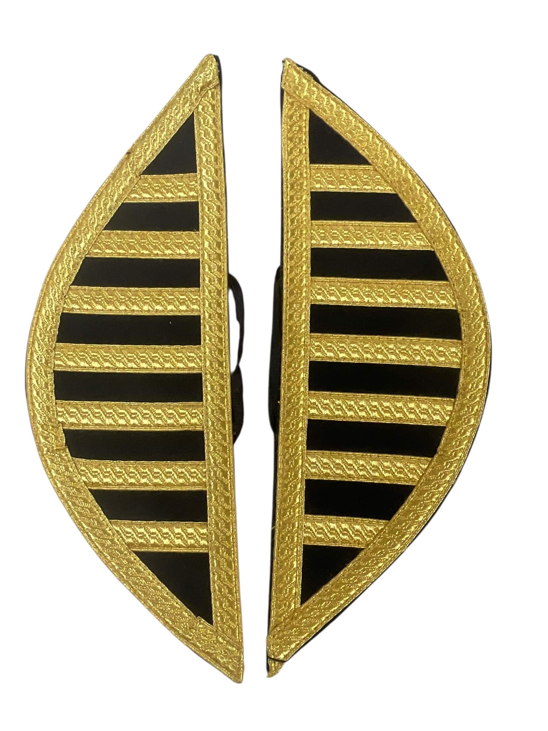 The British Canadian Black/Gold Pattern Band Wings are a military insignia typically associated with aircrew qualification within Commonwealth forces. This specific style features a black band with gold embroidery, forming the outline of stylized wings flanking a central motif, usually denoting the wearer’s role or qualification. The black and gold color combination was commonly used during certain periods for both ceremonial and operational uniforms, indicating a level of distinction within the air branches of the British and Canadian military. Construction is generally of high-quality thread on a fabric backing, designed for attachment above the left chest pocket of the uniform. Variations in detailing can reflect specific branches, ranks, or time periods of issue. These wings served as an immediate visual identifier of an individual’s training and function within the air service. Such insignia hold historical value and are sought after by collectors and researchers of military regalia for their association with Commonwealth aviation history.