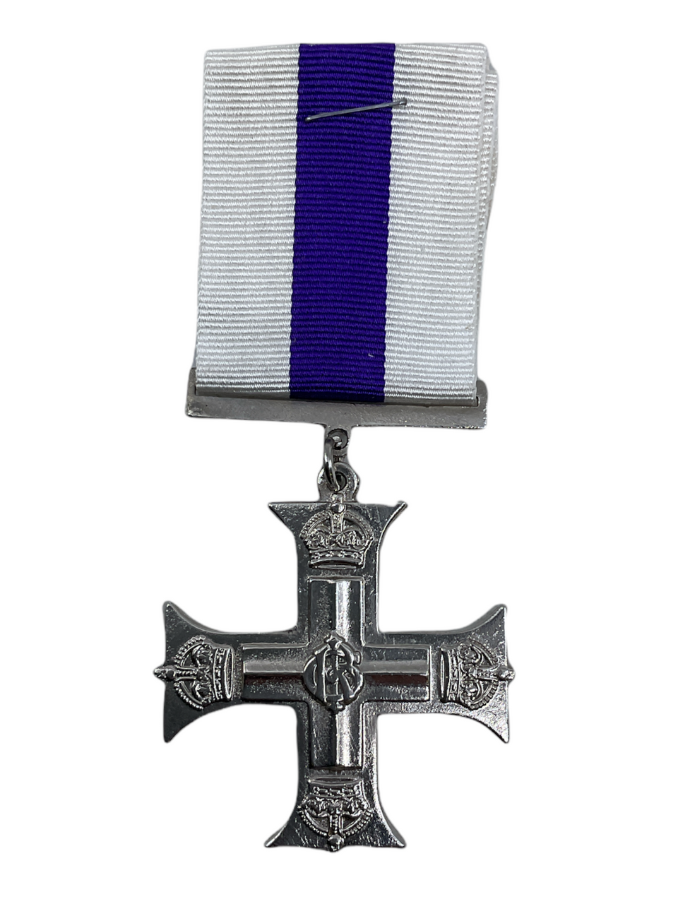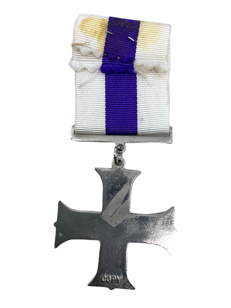 The British Canadian Military Cross Medal & Ribbon COPY is a meticulously crafted replica honoring the prestigious military decoration awarded to officers of the British and Canadian armed forces for exemplary gallantry during active operations. This high-quality copy features a finely detailed cross with intricate engravings and precise dimensions that mirror the original medal, embodying the bravery and heroism it represents. Paired with the medal is a striking ribbon, displaying the characteristic purple and white stripes synonymous with the Military Cross. Ideal for collectors, historians, or enthusiasts, this replica serves as a tribute to the valor of those who have demonstrated outstanding courage in the face of adversity. Whether for educational purposes, reenactments, or as a display piece, the British Canadian Military Cross Medal & Ribbon COPY stands as a symbol of noble sacrifice and dedicated service.