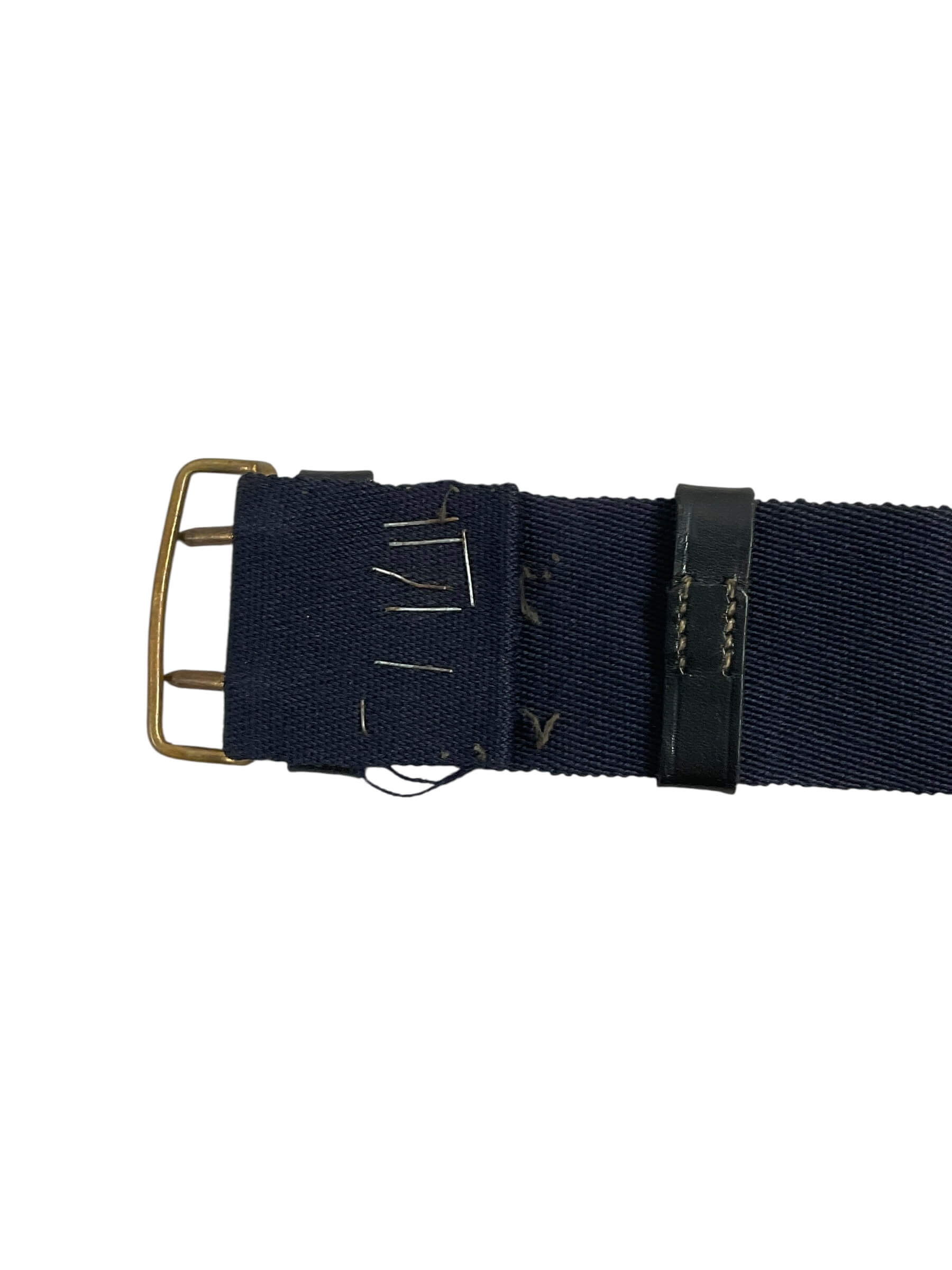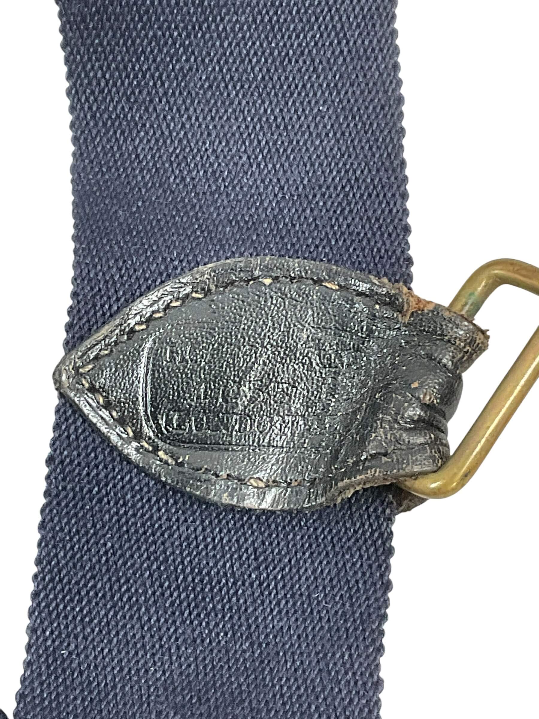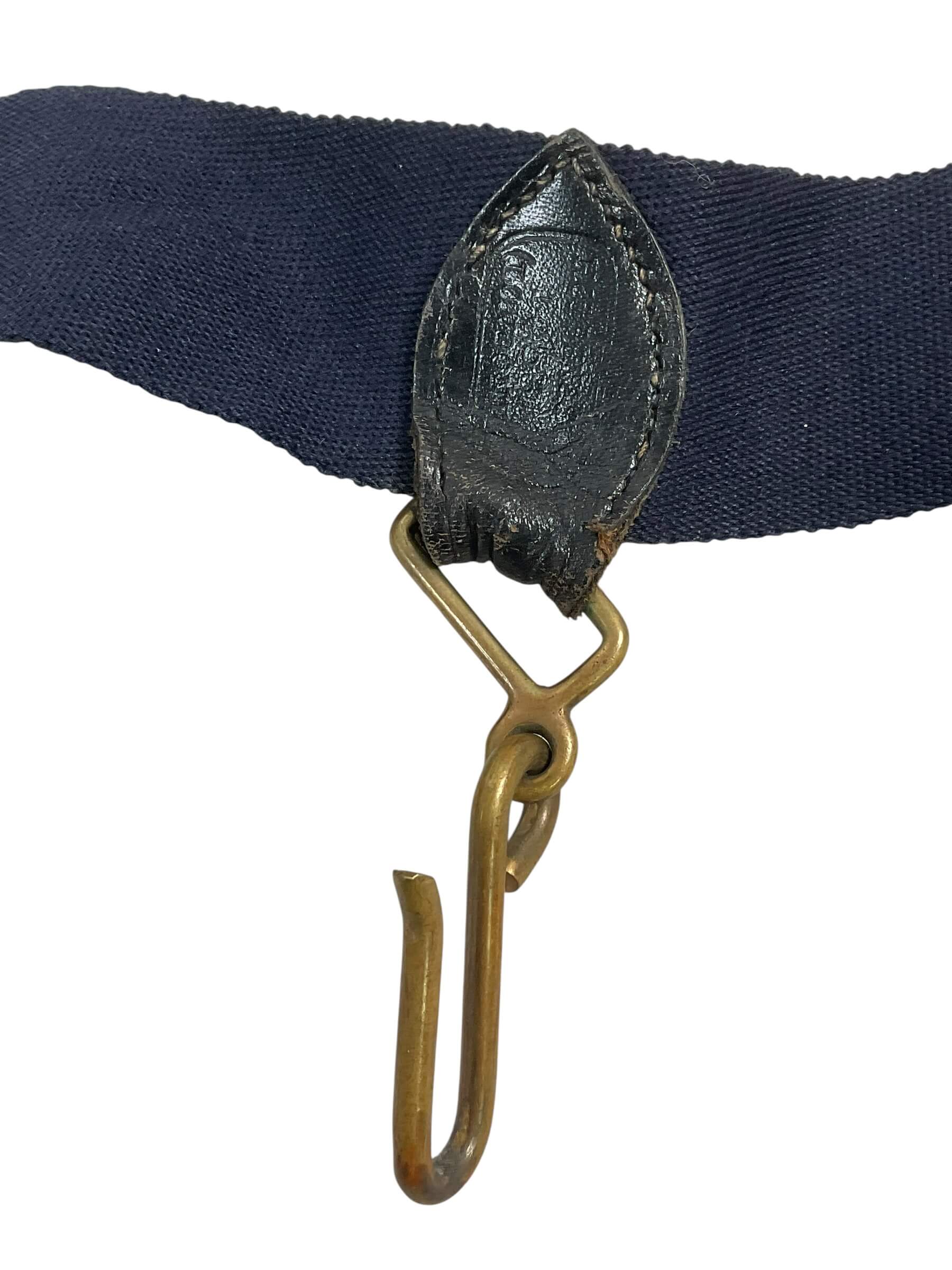 The British Canadian Officers Under Tunic Sword Belt, measuring 37 inches in length, is a vintage military accoutrement designed for commissioned officers during the mid-20th century. This belt was worn under the tunic to securely hold an officer’s sword or sabre in place during ceremonial or field duties. Constructed from durable leather, it features a series of adjustable holes and metal fittings to ensure proper fit and function. This specification was standard for officers serving in both the British and Canadian armed forces, reflecting common design elements and materials of that era. The belt’s unobtrusive construction allowed it to remain hidden beneath the uniform, providing both practicality and a neat appearance during formal inspections and parades. Such items are characteristic of military dress regulations and are valued for their historical association with officer uniforms of that period. This belt is suitable for reference or display within collections focused on British and Commonwealth military history.
