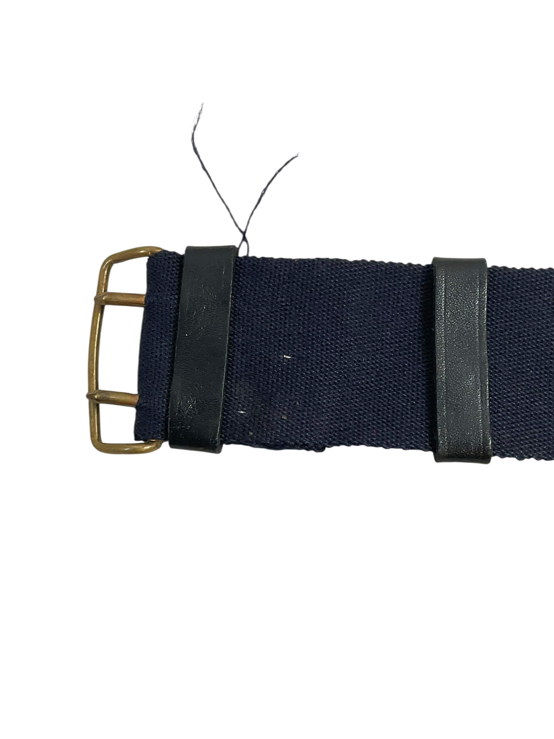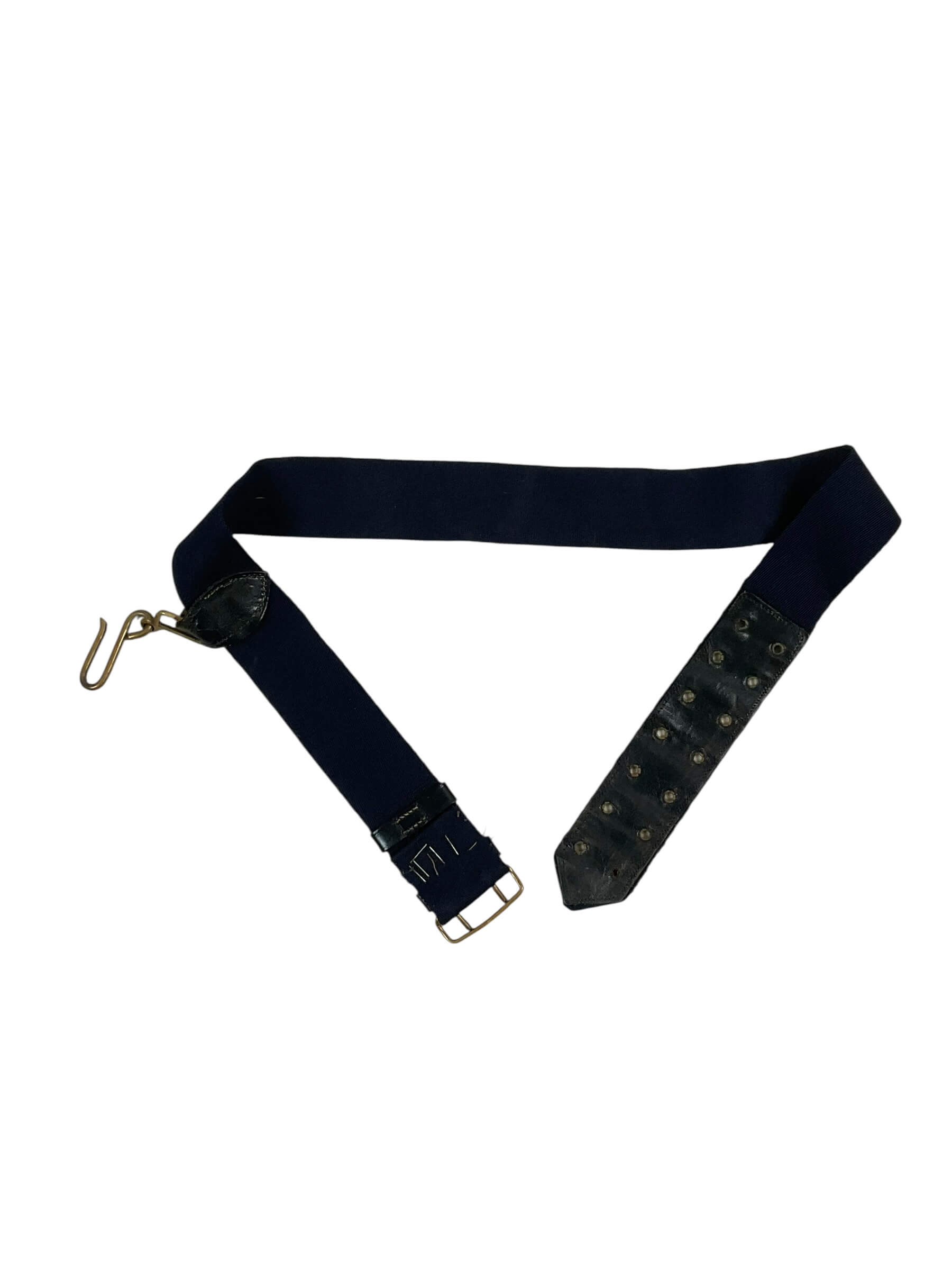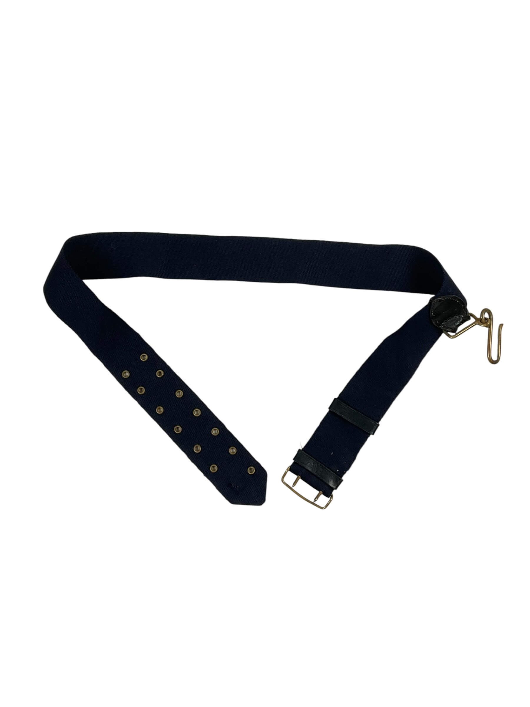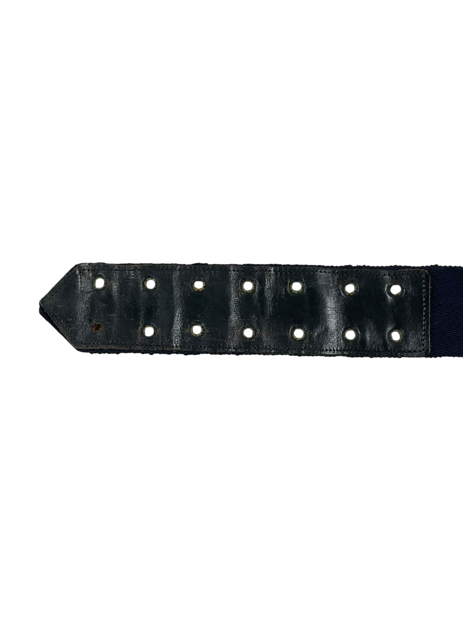 The British Canadian Officers Under Tunic Sword Belt, measuring 37 inches in length, is a vintage military accoutrement designed for commissioned officers during the mid-20th century. This belt was worn under the tunic to securely hold an officer’s sword or sabre in place during ceremonial or field duties. Constructed from durable leather, it features a series of adjustable holes and metal fittings to ensure proper fit and function. This specification was standard for officers serving in both the British and Canadian armed forces, reflecting common design elements and materials of that era. The belt’s unobtrusive construction allowed it to remain hidden beneath the uniform, providing both practicality and a neat appearance during formal inspections and parades. Such items are characteristic of military dress regulations and are valued for their historical association with officer uniforms of that period. This belt is suitable for reference or display within collections focused on British and Commonwealth military history.