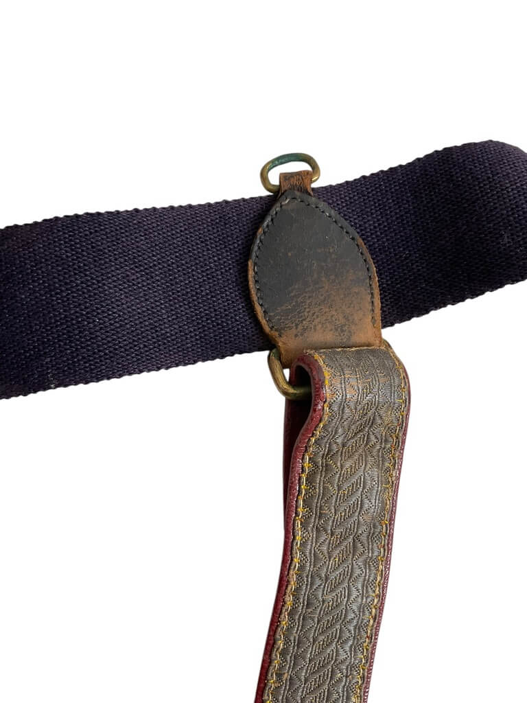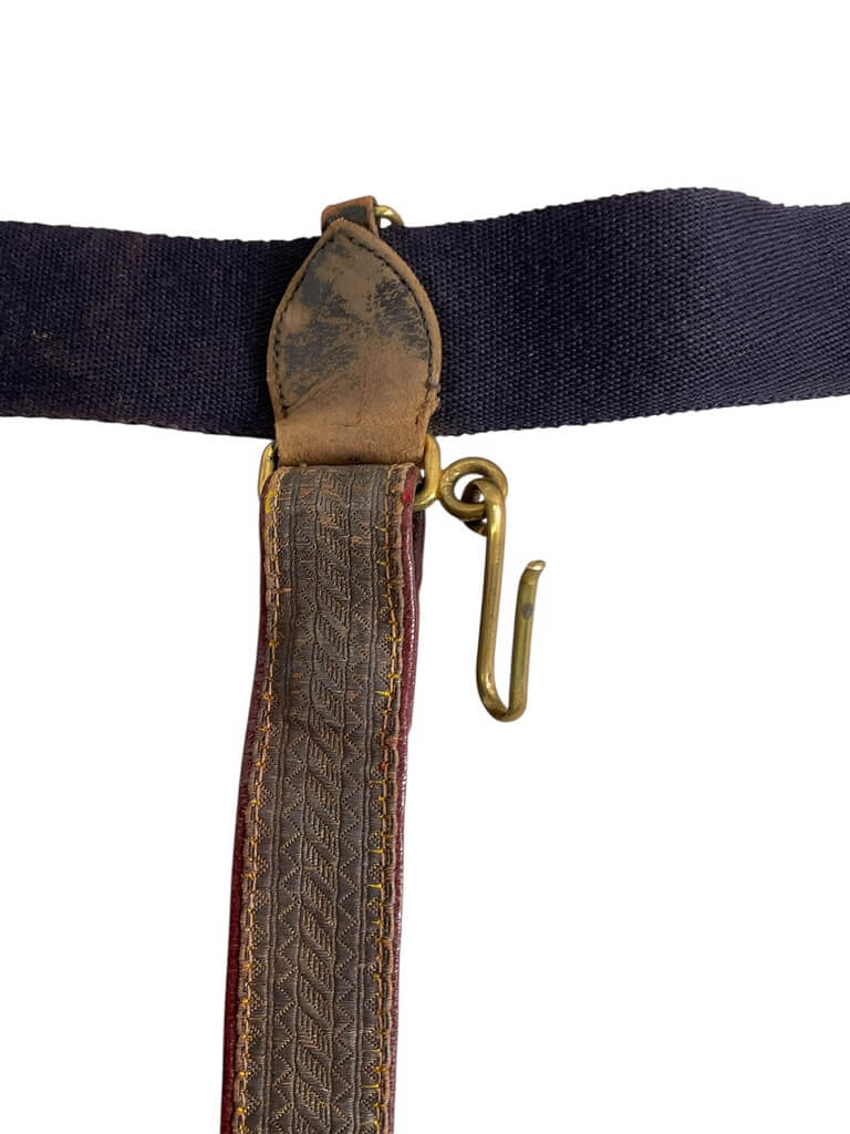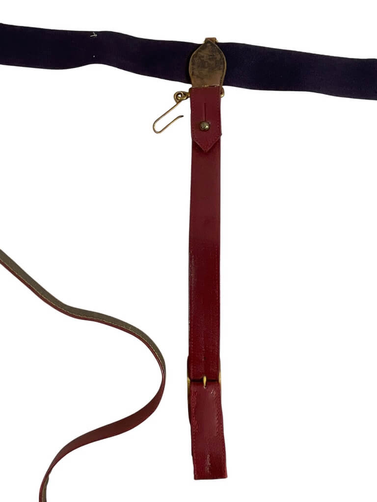 The British Canadian Officers Under Tunic Sword Belt with Straps is a military accoutrement used historically by commissioned officers in both British and Canadian forces. Designed to be worn beneath the tunic, this leather belt securely supports a sword by means of attached straps, allowing for discreet and stable carriage during formal and ceremonial duties. The construction typically features adjustable leather straps with brass or metal fittings, enabling proper fit and adaptability to various uniform requirements. The under tunic configuration ensured that the outer appearance of the uniform remained neat, with minimal visible hardware. Such belts were standard issue or private purchase items from the late 19th to mid-20th century, commonly associated with dress uniforms, parades, and official functions. This example reflects period-appropriate materials and craftsmanship, illustrating the practical and aesthetic considerations of military dress regulations for officers in British and Canadian service.