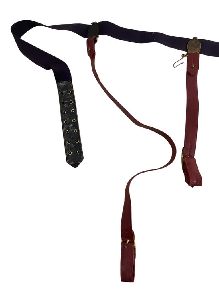 The British Canadian Officers Under Tunic Sword Belt with Straps is a military accoutrement designed for commissioned officers serving in British and Canadian forces. This belt was typically worn underneath the tunic and was intended to support a dress or service sword, allowing for discreet and secure carriage. Constructed from durable leather, it features adjustable straps for a customized fit and metal fittings for attachment of a sword scabb