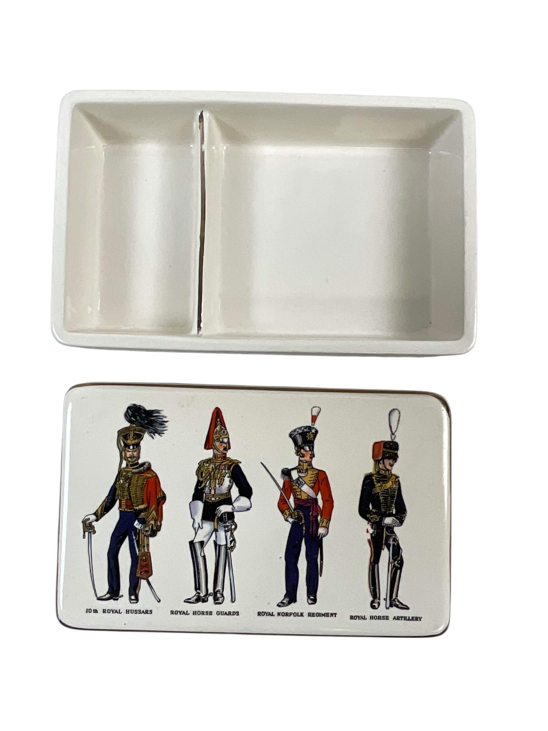 The British Cavalry Ceramic Jewellery Box is a decorative storage piece themed around the historic British cavalry. Constructed from glazed ceramic, the box typically features relief or painted images associated with cavalry regiments, such as uniformed soldiers, regimental insignia, or depictions of horses. The material provides a sturdy and smooth finish, suitable for safeguarding small jewelry items or keepsakes. This item reflects a commemorative tradition in military memorabilia, where everyday objects are adorned with military motifs as a form of recognition or remembrance. The design often draws inspiration from the uniforms, badges, or ceremonial aspects of the British cavalry, a branch of the British Army with a longstanding history. This jewellery box is suitable for collectors of military-themed ceramics, or those interested in British military history, and represents an example of functional commemorative ware produced in honor of specific regiments or the broader cavalry tradition.