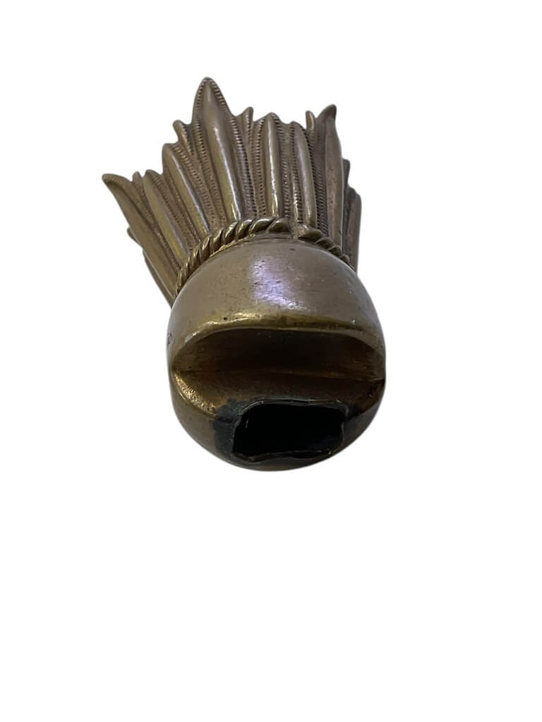 The British Cavalry Lancers Plume Holder is a distinct artifact, steeped in the rich military heritage of the United Kingdom. Designed to hold the ornamental feather or plume, it is a significant part of the cavalry lancer’s uniform, symbolising rank and regiment. These holders, often crafted from brass or other metals, are characterized by intricate detailing and marked with regimental insignias or royal emblems. They were traditionally attached to the lancer’s helmet, adding an element of grandeur and pomp to the military attire. The plume holder not only exemplified the bravery and gallantry of the British Cavalry Lancers but also represented the grandeur of the British military tradition. Collectors and military enthusiasts alike highly value these holders for their historical importance and fine craftsmanship. These pieces serve as a tangible connection to the past, offering a glimpse into the lives and traditions of the British cavalry lancers.