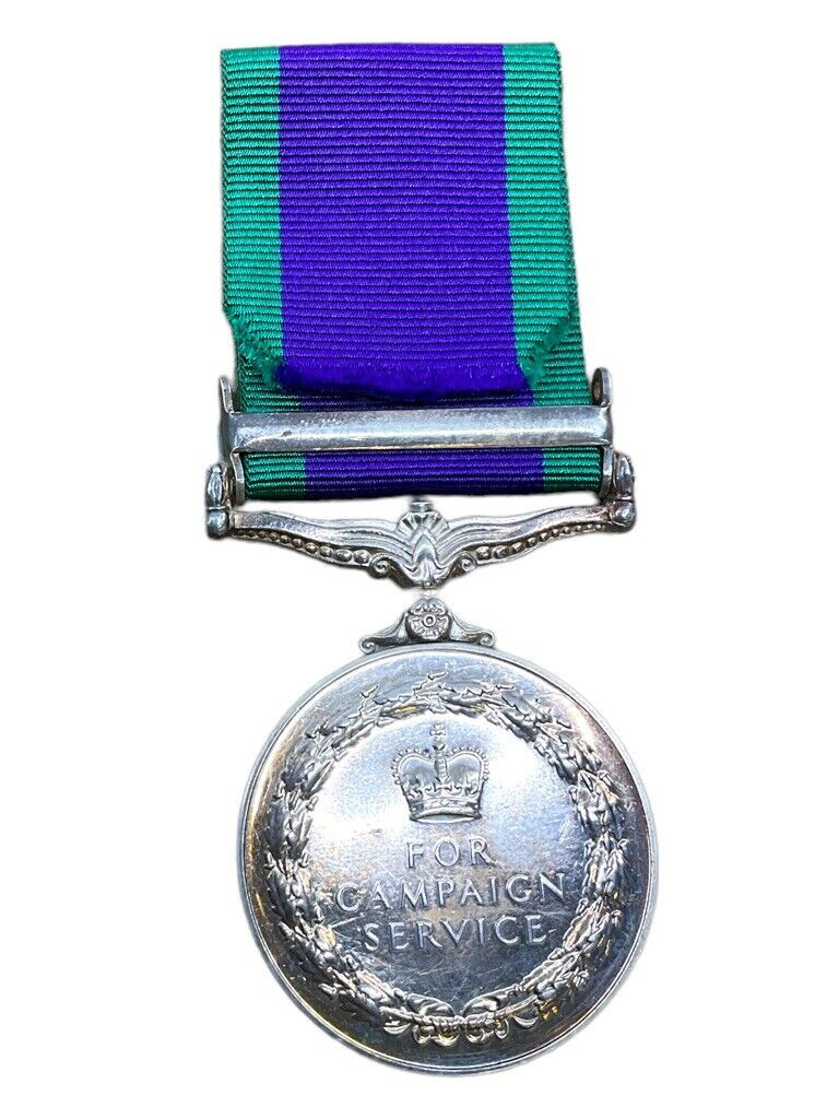The British General Service Medal (GSM) Borneo, awarded to 2404967 Private R. McGeary of the Gordon Highlanders, is a distinguished military decoration recognizing valuable service during the Borneo campaign from 1962 to 1966. This period marked significant British military involvement in the region during the Indonesia–Malaysia confrontation, a part of Cold War tensions. The GSM Borneo Medal features a silver circular design with the reigning monarch’s effigy on the obverse, and a symbolic design on the reverse. The service ribbon is green with outer blue and red stripes, symbolizing proficiency and sacrifice. The inscription “BORNEO” is delicately etched, commemorating the specific campaign. The accompanying service number and name engraving personalize the medal, linking it directly to Private R. McGeary’s honorable contributions as a member of the esteemed Gordon Highlanders. This medal is not just a tribute to bravery and dedication but also a poignant piece of military history.