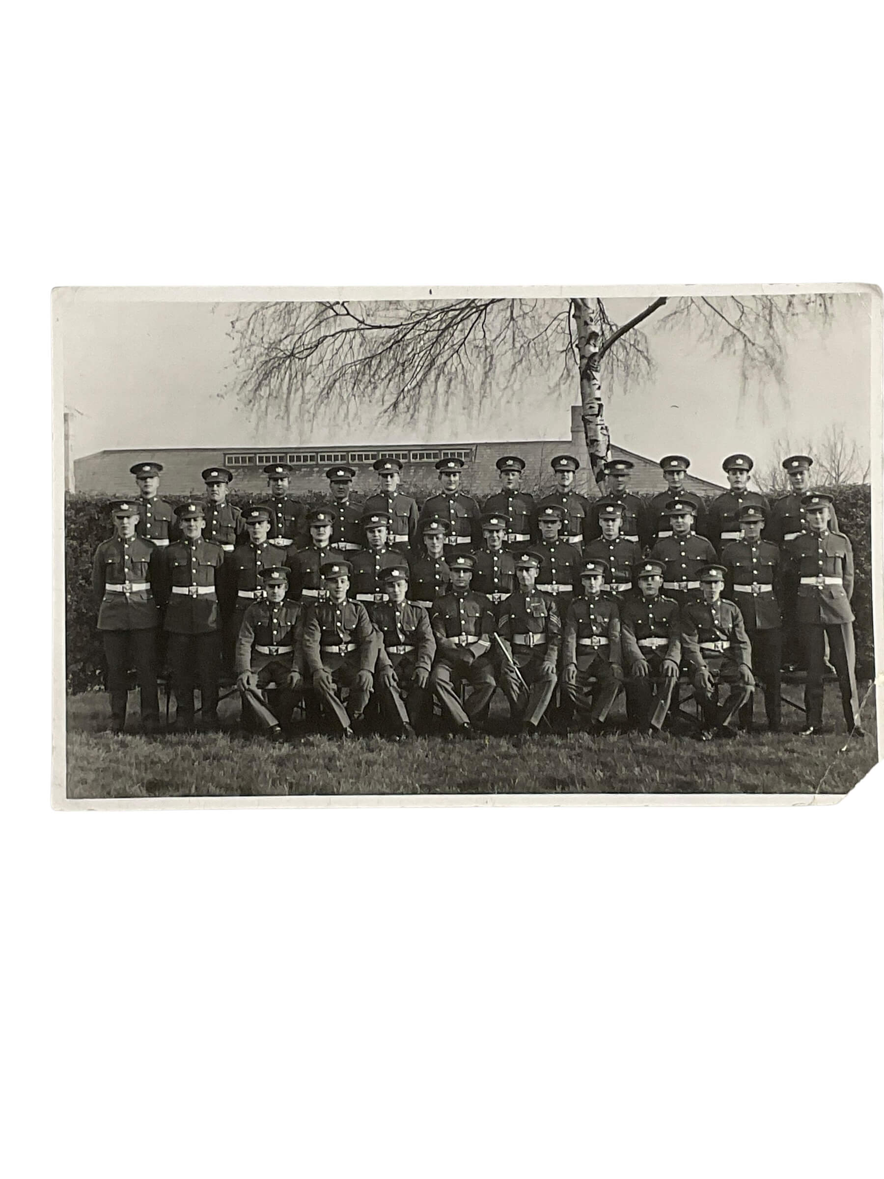 This item is a vintage group photograph postcard featuring members of the British military in Gloucestershire. Measuring 3 1/2 inches by 5 inches, the postcard displays a formal gathering typical of early- to mid-20th-century regimental or unit photographs. The image composition includes uniformed personnel arranged in rows, with identifiable period attire such as service dress caps and jackets, indicative of British forces during peacetime or interwar periods. The backdrop appears to be an outdoor or barrack setting, consistent with group photographs intended for official records or personal mementoes. The reverse side of the postcard is standard for the era, with a designated area for correspondence and address. This photographic format was commonly produced for both military documentation and as keepsakes for family members. Such postcards provide valuable visual records of unit composition, regimental traditions, and clothing styles. No writing or postage markings are present unless otherwise specified.