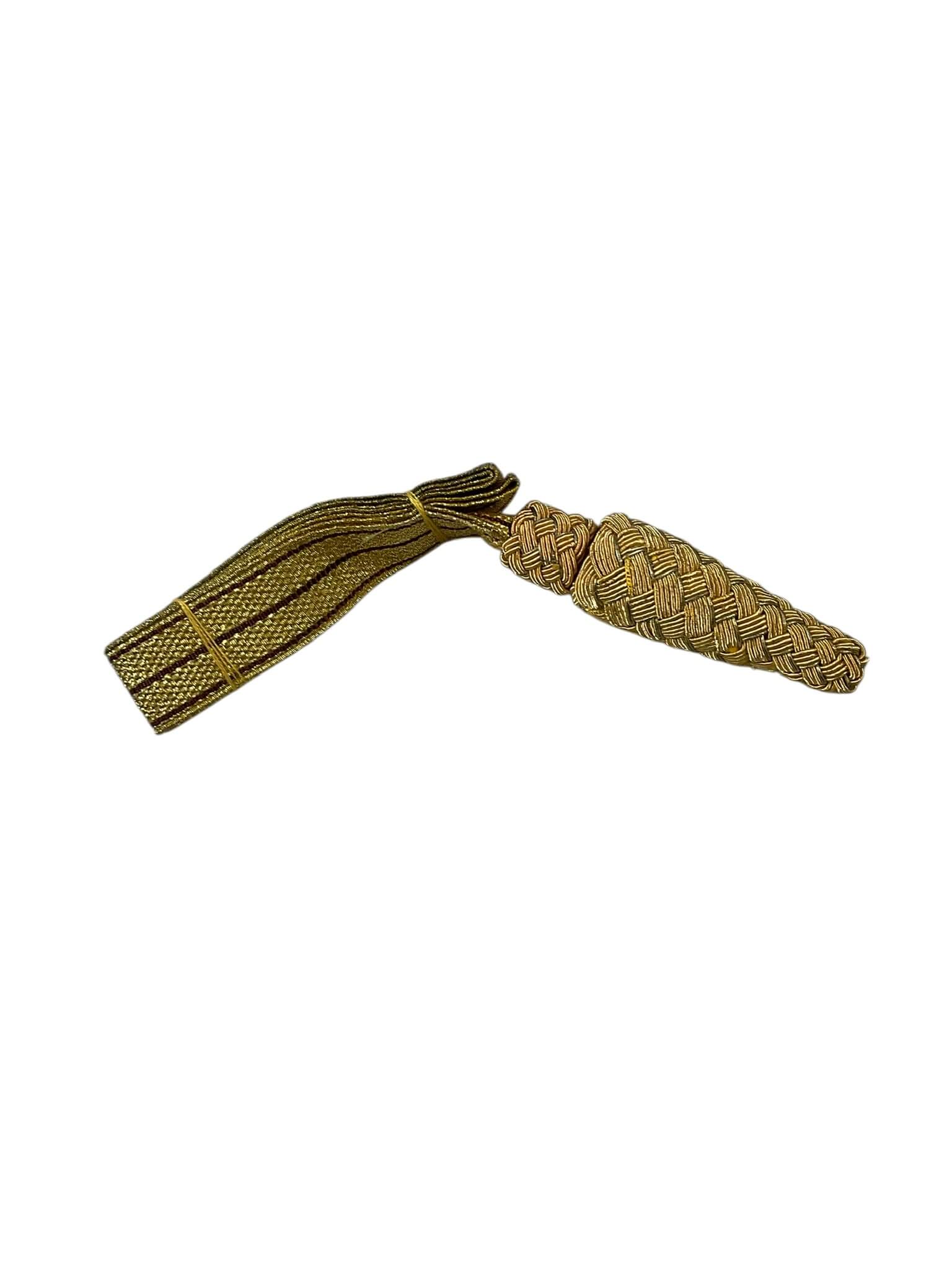 The British Gold Sword Knot with Maroon Stripes is a traditional military accoutrement used primarily by British Army officers. This sword knot is constructed from gold bullion wire, featuring distinctive maroon stripes that run along its length, which serve both ornamental and practical purposes. Sword knots were originally designed as a lanyard to secure the weapon to the wrist, preventing loss in combat, though they evolved to become a mark of rank and regimental identity. The gold and maroon color combination is associated with certain regiments and ceremonial roles within the British military. The knot typically consists of a tightly woven strap attached to a bullion acorn or tassel, designed to be looped around the guard of an officer’s sword. This item provides insight into British military dress traditions and is sought after by collectors of militaria for its historical significance and craftsmanship.