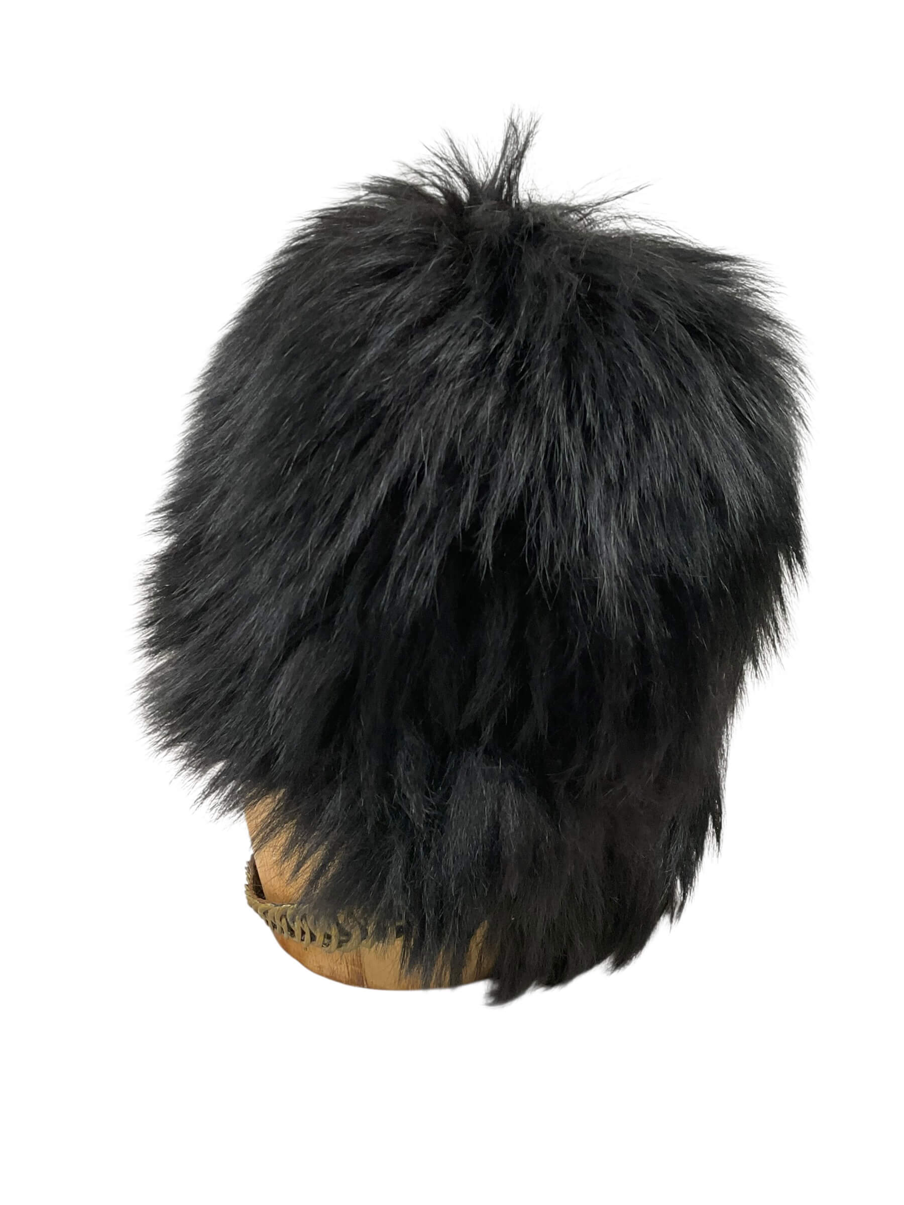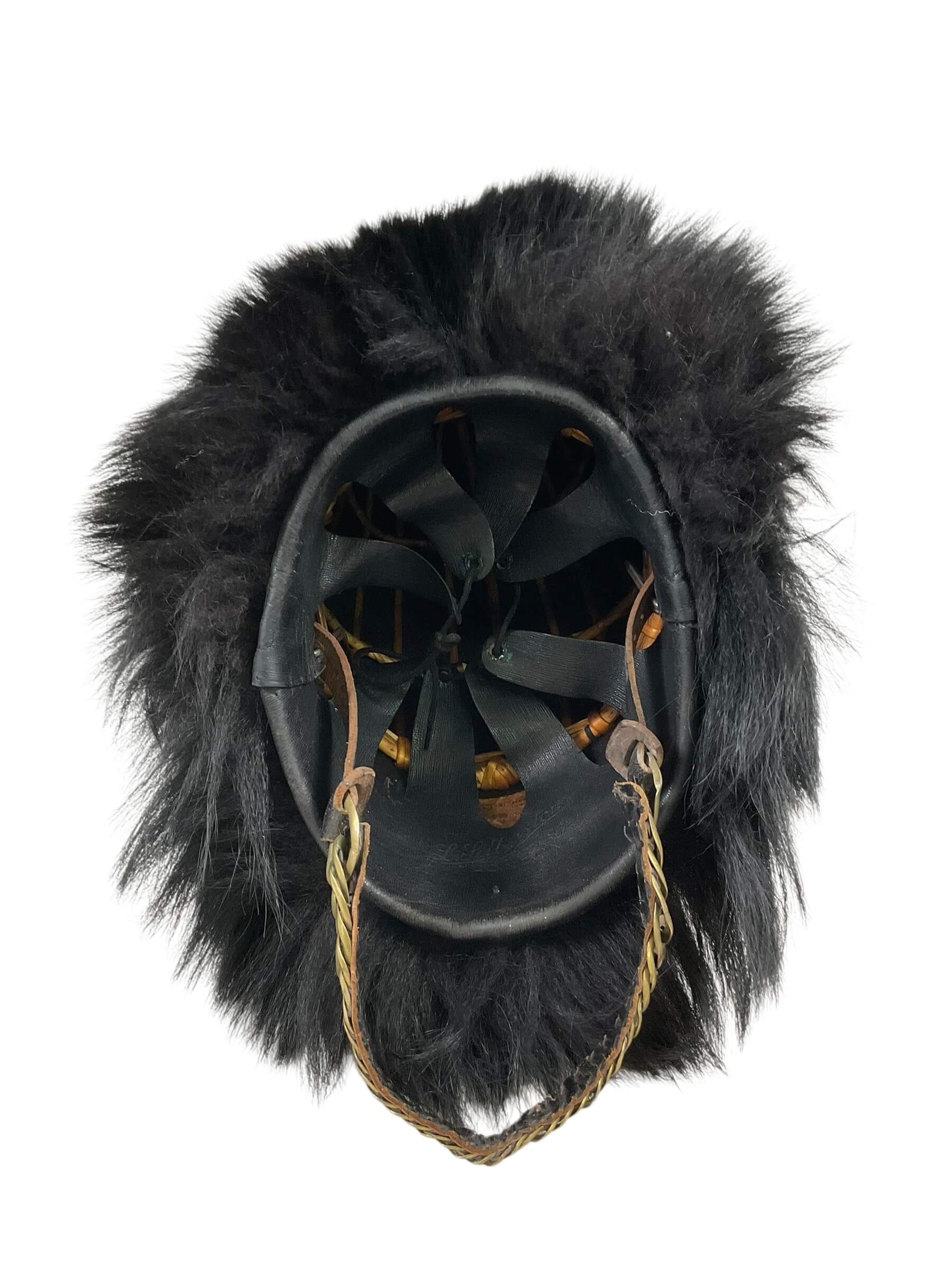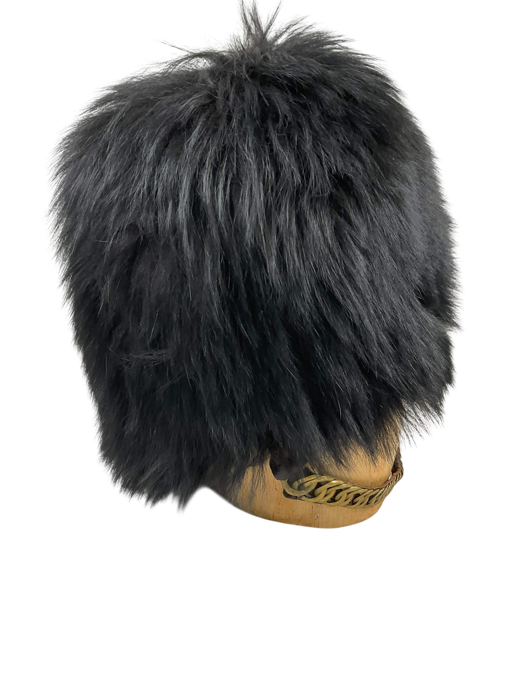 The British Guards Bearskin with Chin Strap, Size 7 1/4, is a traditional military headdress associated with the British Army’s Foot Guards regiments. The bearskin is constructed from genuine fur and features a full, rounded crown measuring approximately 18 inches in height. This example includes a leather chin strap, designed to secure the headdress during parade use. The interior typically features a leather headband and cotton lining for comfort and fit. Bearskins have been worn by the Guards since the early 19th century, notably adopted after the Battle of Waterloo in 1815, as a symbol of elite status and ceremonial presence. This piece, sized for a head circumference of 7 1/4, aligns with period specifications and demonstrates the craftsmanship employed in British military dress uniforms. It is representative of items worn during formal occasions, such as Changing the Guard at Buckingham Palace and other state events.