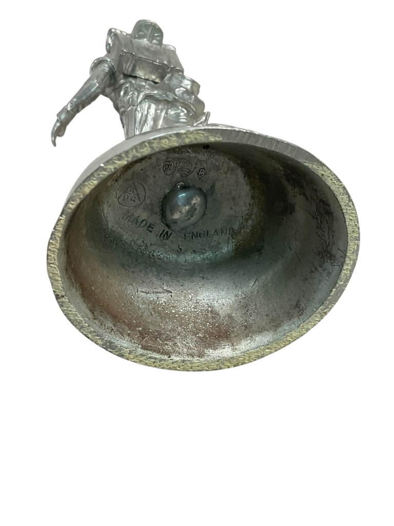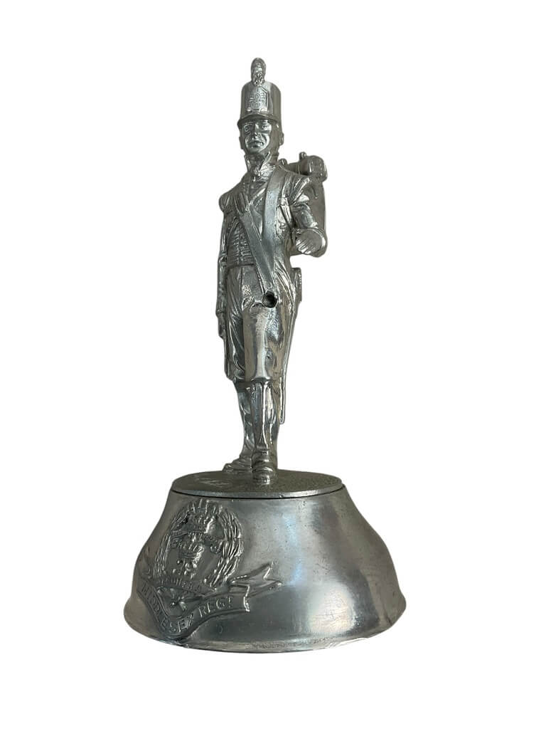 This pewter statue represents a soldier of the British Middlesex Regiment and stands 4 1/2 inches tall. The Middlesex Regiment, formally known as the Duke of Cambridge’s Own, was an infantry regiment of the British Army, originally formed in 1881. The statue depicts a uniformed figure, accurately detailed in period dress, including standard-issue military attire and regimental insignia characteristic of the unit. Crafted from solid pewter, the figure is set on a round base, providing stability and a classic appearance. Such statues are often collected for their historical associations with British military heritage and regimental history. The compact size (4 1/2 inches in height) allows for easy display on shelves or desks. Pewter figures like this are utilized in historical collections, educational displays, and by enthusiasts interested in military history. This item represents a visual and physical reference to the long-standing traditions of the Middlesex Regiment.