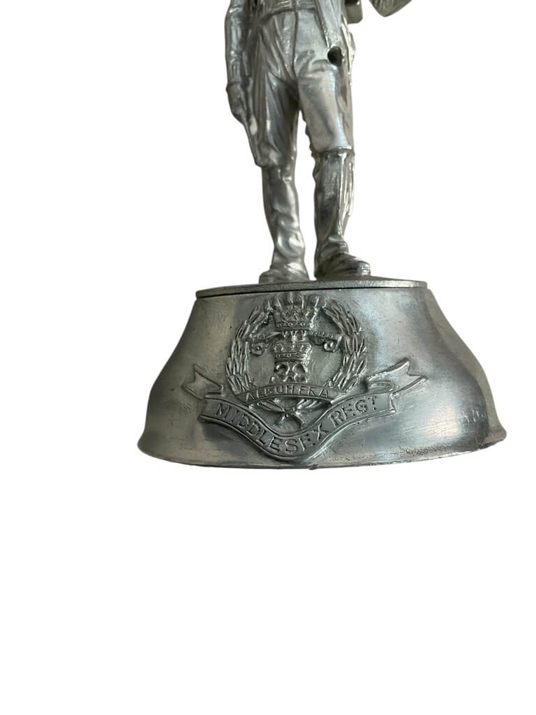This pewter statue represents a soldier of the British Middlesex Regiment, a historic infantry regiment of the British Army first formed in 1881. Standing at approximately 4 1/2 inches tall, the statue features detailed uniform and equipment accurate to the period commonly associated with the regiment. The figure is depicted in standard issue dress, including the regimental cap and tunic, reflecting the attire worn