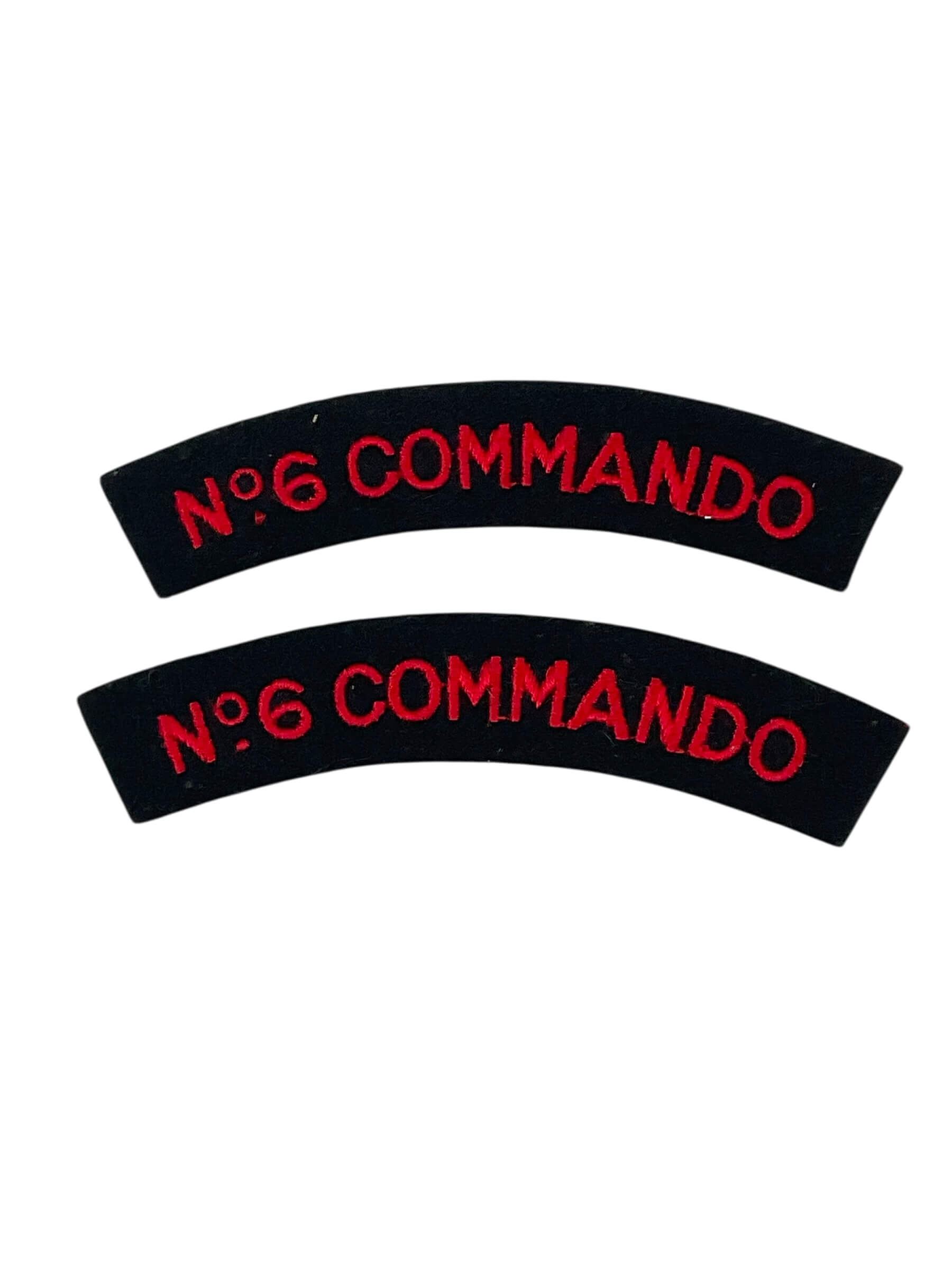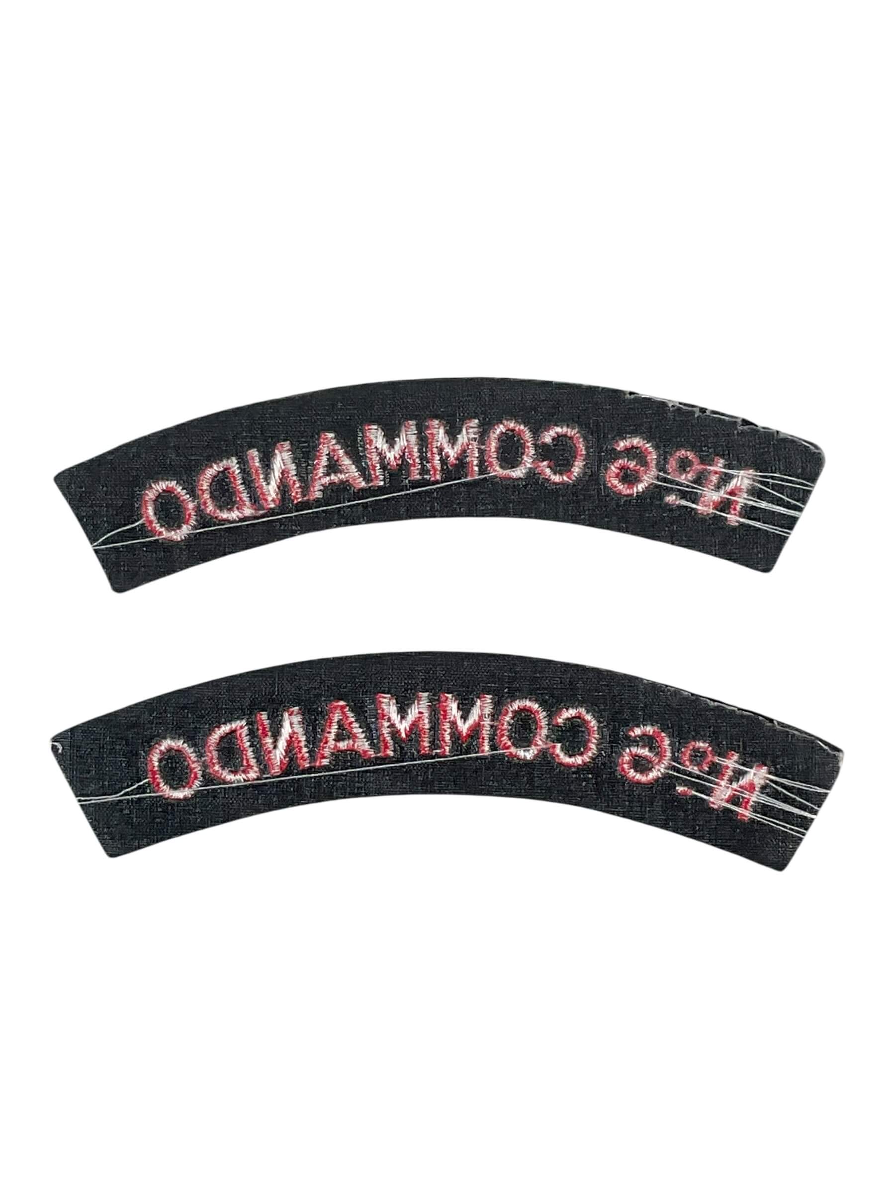 The British No 6 Commando Shoulder Titles Insignia Pair consists of two cloth shoulder titles originally worn by members of No 6 Commando, a unit formed during the Second World War. Each title is typically constructed from dark green or black felt with “No 6 COMMANDO” embroidered in light-colored thread, intended for attachment to the upper sleeve of the battledress uniform. No 6 Commando was established in 1940 as part of the British Army’s Commando forces and saw extensive service in Europe and the Mediterranean. The shoulder titles served as a means of unit identification and esprit de corps, distinguishing Commando personnel from other branches. Surviving examples may show signs of wear or variation in font and construction, reflecting changes in manufacturing and rank-and-file customization during the wartime period. These insignia represent a notable aspect of British military uniform history from the Second World War era.