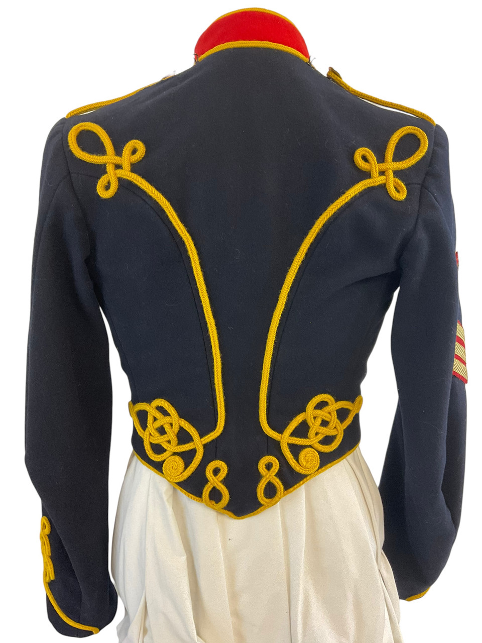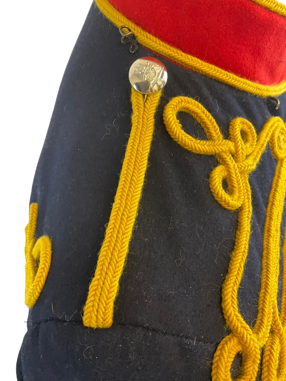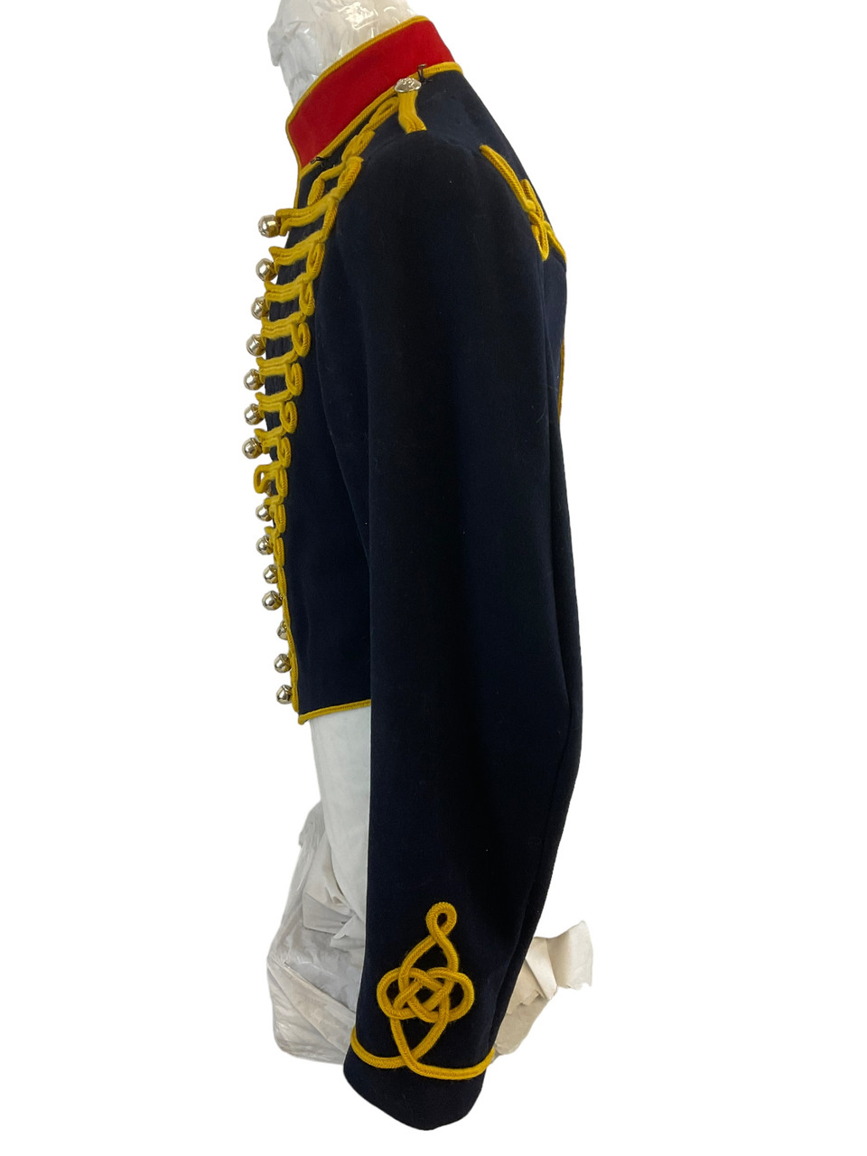 The British Royal Horse Artillery Full Dress Tunic and Trousers represent a striking and historically significant military ensemble, symbolizing ceremonial traditions and regality. The tunic features a distinguished high-collar design, typically bedecked with intricate gold braiding and buttons that reflect the grandeur of the British military heritage. Matching trousers, tailored for a perfect fit, often include a bold stripe running down the leg, enhancing the formal appearance. This full dress uniform is crafted from high-quality materials, designed to maintain an impeccable look during parades, state functions, and other ceremonial duties. Rich in history and symbolism, this uniform not only encapsulates the pride and dignity of the Royal Horse Artillery but also embodies the longstanding military excellence and pageantry of the United Kingdom, making it a remarkable piece of military finery.