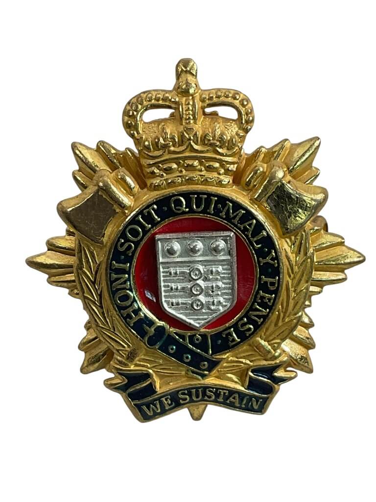 The British Royal Logistics Corps Cap Badge is an insignia worn by personnel serving in the Royal Logistic Corps (RLC) of the British Army. Established in 1993 through the amalgamation of several logistic and transport units, the RLC is responsible for supply, transport, movements, and a range of logistical support functions. The cap badge typically features the RLC’s distinctive elements, including the central shield, crossed axes, and laurel wreath, surmounted by a crown, reflecting the corps’ service to the Crown and its role within the wider army structure. The motto “We Sustain,” often featured within the badge’s design, underscores the core mission of providing enduring support to military operations. Constructed of metal, most examples are fitted with a slider or lugs for attachment to headgear. This item represents a key emblem of the corps’ identity and is associated with both full dress and service uniforms from 1993 to the present.