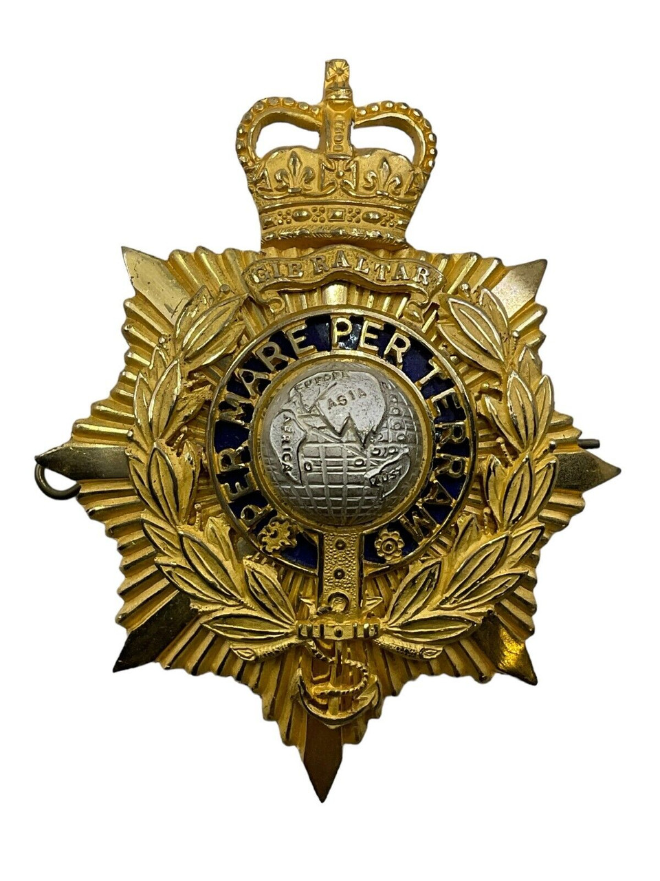 The ‘British Royal Marines Officers Helmet Plate’ is a prestigious emblem historically worn by commissioned officers of the esteemed Royal Marines. This intricately designed insignia features symbols and motifs representative of the rich heritage and valor of the British Royal Marines. Typically crafted from high-quality metals and often adorned with enamel, this helmet plate serves not only as a mark of rank but also as a proud testament to the professional excellence and storied tradition of these elite marine forces. The design often includes elements such as the Royal Crown, a globe, an anchor, and various embellishments that highlight the maritime prowess and global reach of the Royal Marines. Collectors and historians cherish these helmet plates for their historical significance and the craftsmanship they exhibit, making them significant artifacts of British military history.