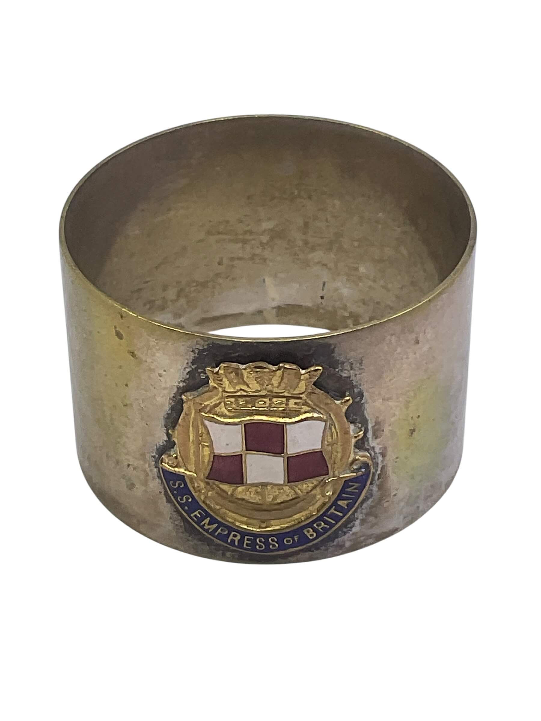 The British Steamship S.S. Empress of Britain Napkin Holder is a collectible item that represents one of the most notable ocean liners of the early twentieth century. The S.S. Empress of Britain was launched in 1931 by Canadian Pacific Steamships and served as an important passenger liner between England and Canada before its requisition for military use during the Second World War. This napkin holder features a design based on the ship’s likeness or insignia, often used as tableware in shipboard dining rooms or as commemorative items for passengers. Typically constructed from metal with detailed engravings or stamped artwork, such napkin holders serve as historical artifacts reflecting maritime travel and naval history. The piece provides insight into the daily life aboard transatlantic liners and the traditions associated with travel during the interwar period. It is relevant for collectors of maritime memorabilia, twentieth-century artifacts, or military antiques linked to notable British vessels.
